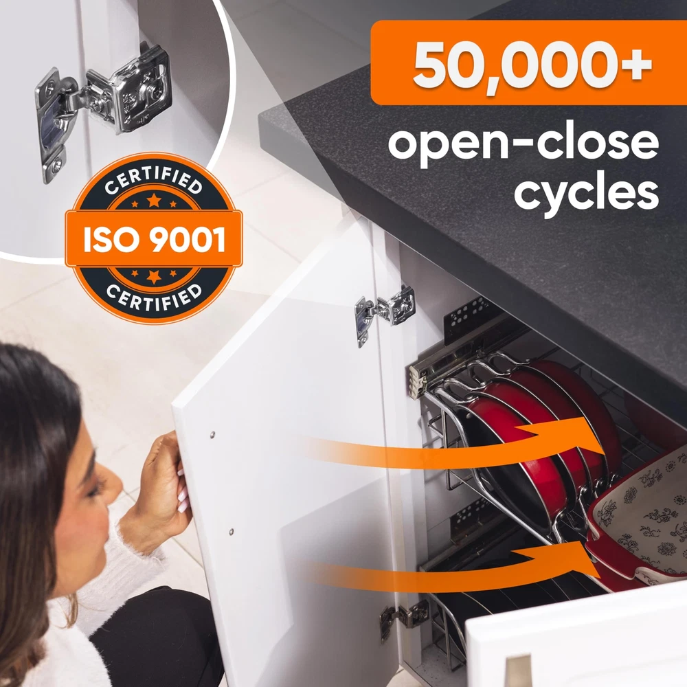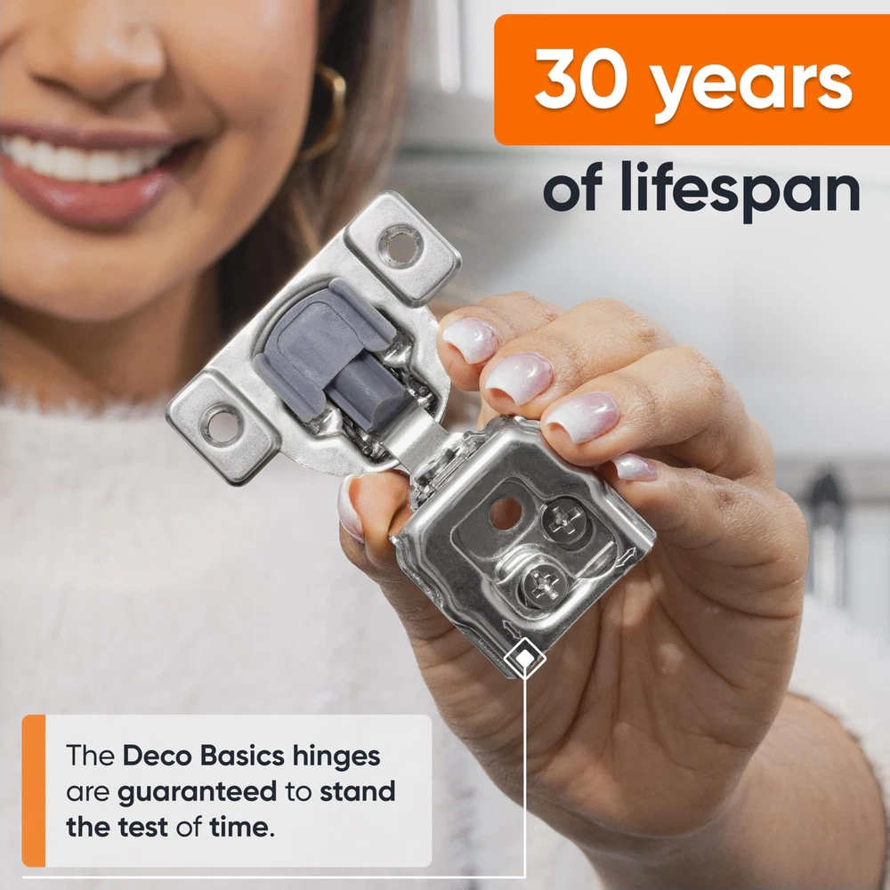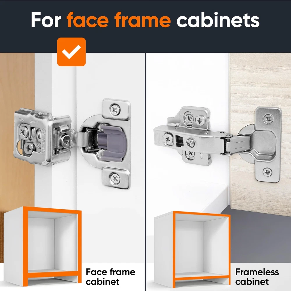 Soft Close Hinges: Cabinet Hinges provide long-lasting durability, a soft close damper, and the reinforced strength to outlast even the roughest kitchens or bathrooms. 3 Way Adjustment Structure The cabinet hinges have 3 way adjustments, which is better than a 2 way adjustment in normal. Then ,it means you could: Adjust Up and Down Adjust Left and Right Adjust Front and Back Excellent damper When you open a door and leave it, it stays back and forth. You’ve probably been shocked by the door's creaking noise. Luckily, the cabinet hinges are equipped with an excellent damper. So it would provide: Super smooth operation Suitable closing speed which could protect your hands Silent open and close, provide a comfortable home environment Product Details: Face Frame Cabinet Hinges Self, Soft-Closing Design with Built-In Damper Angle Opening: 105° 35mm Bore (Hinge Cup) Available Quantities: 10, 20, 40, or 50 Include Matching Screws 1-3/8 INCH OVERLAY SOFT CLOSE HINGES : 35mm bore (concealed hinge cup), 105-degree opening angle for the most common cupboard hinges door styles. They're also known as hidden hinges for cabinet doors or hidden cabinet hinges in kitchens & baths. QUIET, SOFT CLOSING CABINET HINGES -Our cabinet door hinge has built-in cabinet soft close damper that dampens the banging sound of any slamming of the cabinet doors. This helps the door to close more safely and quietly while protecting your fingers. 3-WAY ADJUSTABILITY FOR EASY INSTALLS & UPGRADES. Simply turn the screws on the soft close hinges for kitchen cabinets to adjust the door position. Come with matching cabinet door hinges dowels and screws to ensure a perfect fit. HEAVY-DUTY STAINLESS STEEL FINISH: Thanks to the high-quality steel metal and built-in soft close cabinet door damper mechanism, our soft close hinge for cabinets with 50,000 times tested for performance and durability to last a lifetime. 100% SATISFACTION GUARANTEED: Return soft close door hinges for replacement or refund in 90 days. Bulk hinges options available, update your cabinets with strong, reliable soft close cabinet hinge from by clicking 'Add to Cart’ now.