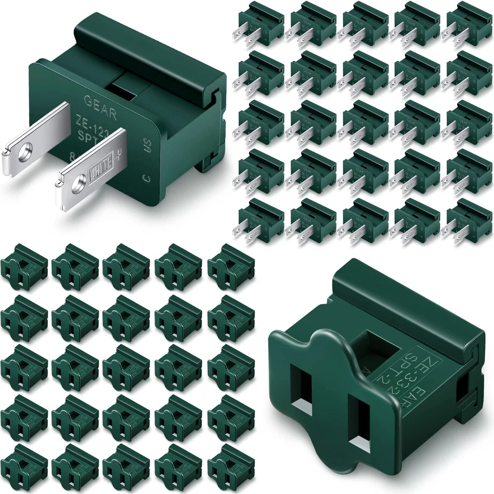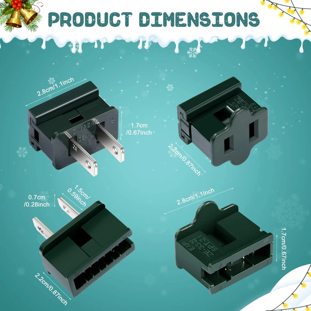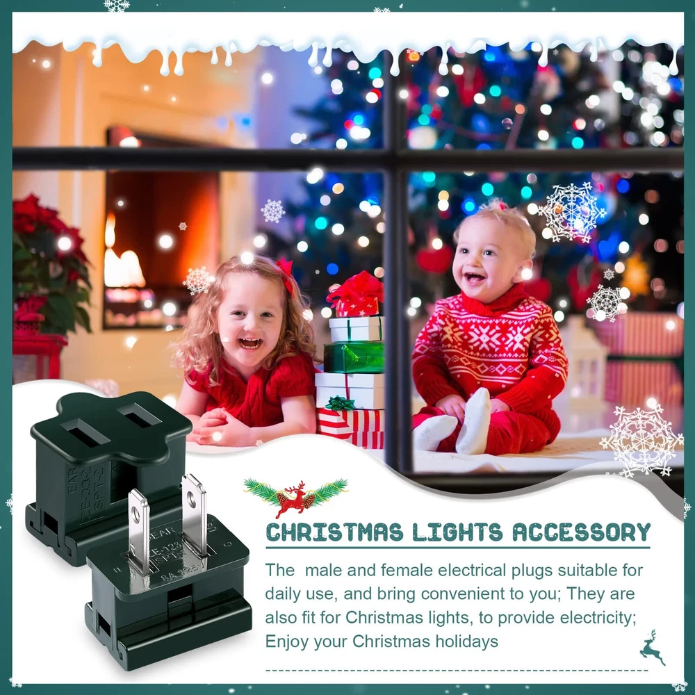 Features: Suitable for: Capable of 6 amps/ 125 volt. Simple to use: Suitable for customizing any length of light silk, cut the wire to the desired length, then slide the wire top clip into the plug to engage the wire. Suitable for Christmas and others: The male and female connectors are nice Christmas complements to lighting and architectural design. Add to the custom run to provide power. Specifications: Material: PC and copper Color: green Size: moderate size/ capable of 6 amps/ 125 volt Package includes: 25 x Green female plugs 25 x Green male plugs Notes: Manual measurement, please allow slight errors on size. The color may exist slight difference due to different screen displays. Pointed parts included, please keep away from little kids. Suitable for Daily Use: you will receive 25 pieces of male and 25 pieces of female Christmas light plugs, enough for you to use and replace at Christmas or in your daily life, and you can also share them with others A Long Time Service: male and female electrical plugs are safe with PC and copper, the internal threaded plugs of double male plug adapter meet the needs for indoor and outdoor use; Easy and convenient to use Simple Operation: this electrical plug is suitable for customizing light wires of any length; You can cut the wire to the desired length and then slide the clip on the top of the wire onto the plug, to make the wire join Versatile Usage: the green male and female electrical plugs suitable for daily use, and bring convenient to you; They are also fit for Christmas lights, to provide electricity; Enjoy your Christmas holidays Size Information: the male slip plug has proper size, which is easy and convenient for you to apply; You can use them if you want, just remember they are capable of 6 amps/ 125 volt; Just attach a plug where you need it