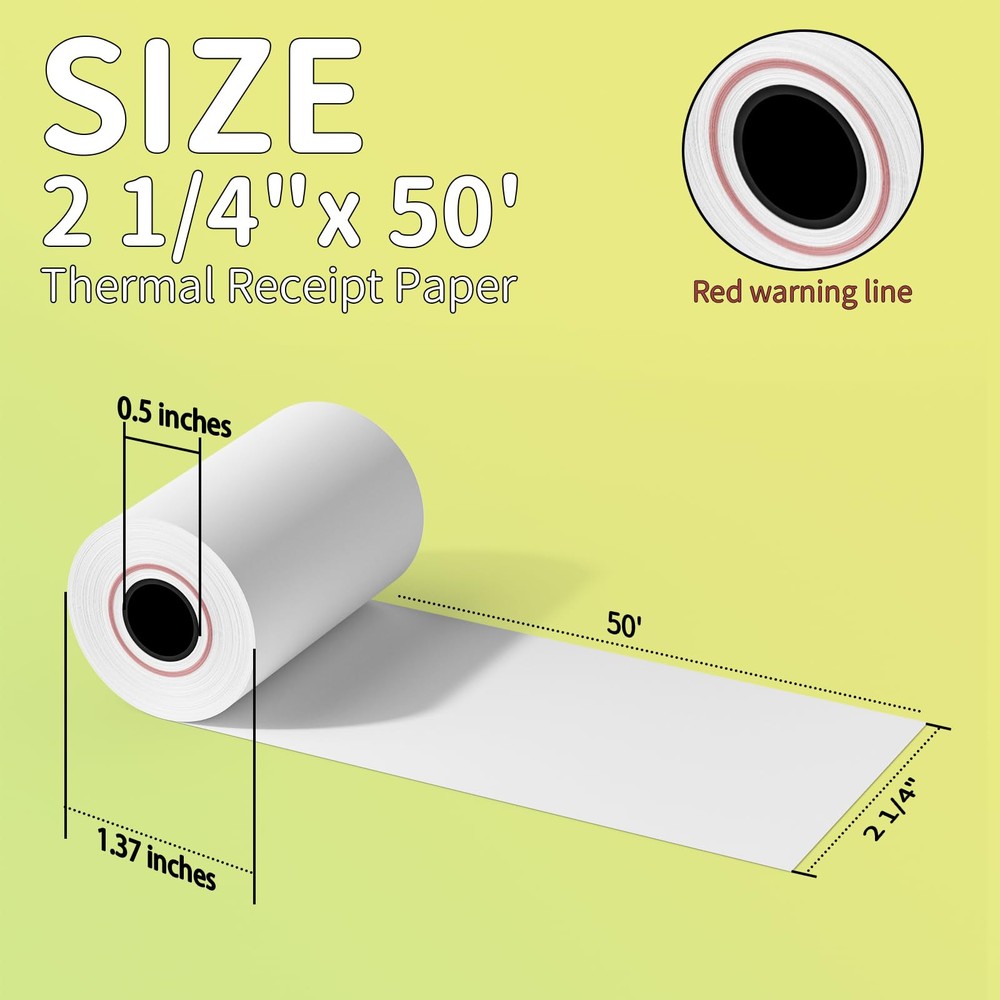 5 Rolls Thermal Paper 2 1/4" x 50' , BPA Free Receipt Paper, 58mm Thermal Receipt Paper, POS Cash Register Receipt Rolls, Credit Card Paper, Premium Quality, White 【Specification】2 1/4" x 50' thermal cash register receipt paper, 50 rolls thermal paper (Size: 2.25 inch x 50 Feet) 【Thermal Paper Rolls】2 1/4 x 50 thermal paper rolls can be used in thermal printers, cash registers, POS systems, credit card terminals and self-service kiosks, serving various purposes across retail, hospitality, logistics and shipping, parking, gaming and healthcare. 【Premium Thermal Coating】We utilize state-of-the-art thermal coating technology to ensure that our thermal paper has the best coating for sharp, crisp print quality. 【Long-Lasting and Durable Print】Our thermal paper produces prints that resist fading, ensuring that prints remain legible and intact for long periods. 【BPA Free Thermal Paper】Made from BPA-free paper, our thermal paper products are safe and eco-friendly for both users and the environment.