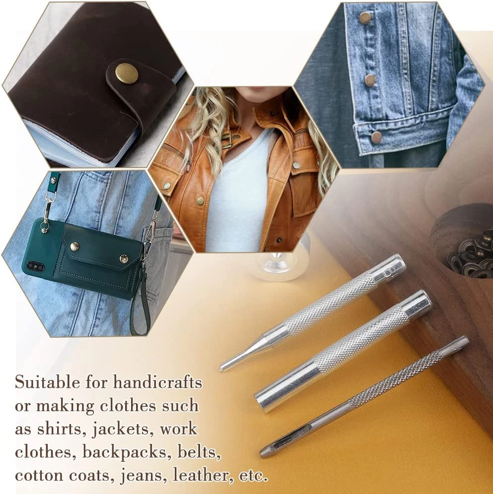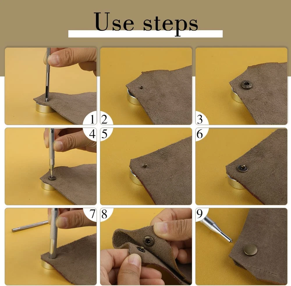 Store New Arrivals Add to Favorite View Feedback Contact 50 Sets Leather Snap Fasteners Kit 10Mm Bronze Metal Snap Buttons Kit Stainless Steel with 4Pcs Snap Fastener Installation Tools for Sewing Clothing, Bracelets, Jackets, Bags Belt, DIY Crafts Description Item model number 01 Unit Count 50.0 Count Style Bronze Color Bronze Material Stainless Steel Country of Origin China Item Weight 5.4 ounces Head Style Button Model Name Leather Snap Recommended Uses For Product Belt Product Dimensions 1.97 x 1.18 x 0.79 inches Manufacturer 01 Snap Button Kit Includes: 50 pairs of snaps kits, each pair has 4 small parts, caps, washers, sockets and studs, also comes with 4 installation tools. These will be packaged in a transparent plastic box, convenient for your storage and use. High Quality Material: The snap button is made of alloy, high quality and not easy to rust, long service life, suitable for indoor and outdoor use, even in wet environments. Simple Installation: This metal snap button kit is very easy to install and use, after you are familiar with the 4 installation and punching tools, you only need to tap hard, even a beginner can easily learn to use it. Precautions: Snaps are suitable for thick to medium weight fabrics, not for thicker or denser fabrics or silks. The snap fasteners cap has a diameter of approximately 10mm/0.39 inches. Please refer to the dimensional diagram to confirm that the snap button is the size you need. Wide Range of Applications: These leather snaps can be used to make leather handicrafts, clothes, shoes, hats, canvas, belts, backpacks and more, can fulfil your various leather decorative demands or clothing repair supplies. Product Description Set Includes: 50 Sets Leather Snap Fasteners Kit, 1 * Punch Tool, 1 * Double-sided Base, 1 * Concave Installation Tool, 1 * Pointed Installation Tool Features: Snap fasteners made of metal materials, hard, sturdy and durable, will not easy to get erosion and rust. These buttons are widely used, you can apply them in jackets, backpacks, hats, suits, trousers, shirts, sweaters, belts, jeans, etc. Please Note: These buttons are small items, please keep them away from children to avoid suffocation by misuse. Complete Snap Installation Tool: Made of durable solid steel with high hardness and good wear resistance. An ideal complete multi-tool for all your needs for quick and easy drilling and snap fit. 1 * Punch Tool 1 * Double-sided Base 1 * Concave Installation Tool 1 * Pointed Installation Tool How to Use: 1. Measure the hole location and mark it on the fabric with a pencil. Use the provided punch tool to punch a hole at the mark. 2. From the front of the fabric, thread the tube of the button through the hole you just punched and snap the stud onto the tube of the button. 3. Using the concave tool, tap it vertically so that the snaps engage the fabric. 4. Using the hole punch tool on the other fabric, make a new hole. 5. From the front of the fabric, thread the tube of the button through the hole you just punched and snap the female stud onto the tube of the button. 6. Using a pointed tool, tap it vertically so that the snaps engage the fabric. 7. Check that the snaps are securely installed. ABOUT US We offer the best prices around on high quality products. Our E-store includes media such as books, movies, music and games while offering electronics, toys, sporting apparel, clothing, tools, general home, garden items and more. SHIPPING We are always working hard to ensure your package arrives as soon as possible. Please understand that some factors like weather, high postal traffic, and the performance of shipping companies are outside of our control. We offer free shipping to the lower 48 states and ship within 2 business days of payment, usually sooner. We do not accept P.O. Boxes. Please provide a physical address. RETURNS We offer a 30-Day Return Policy on items which you are not completely satisfied with. You have the option for a full-refund or an exchange of the item. No returns are available on items shipped outside of the USA. PAYMENT We accept PayPal. CONTACT US This page content is yet to come Please ad us to your favorite seller and visit again later Thank You CUSTOMER SATISFACTION We try our very best to make sure every customer is completely satisfied. If there's a problem, message us! We're happy to help