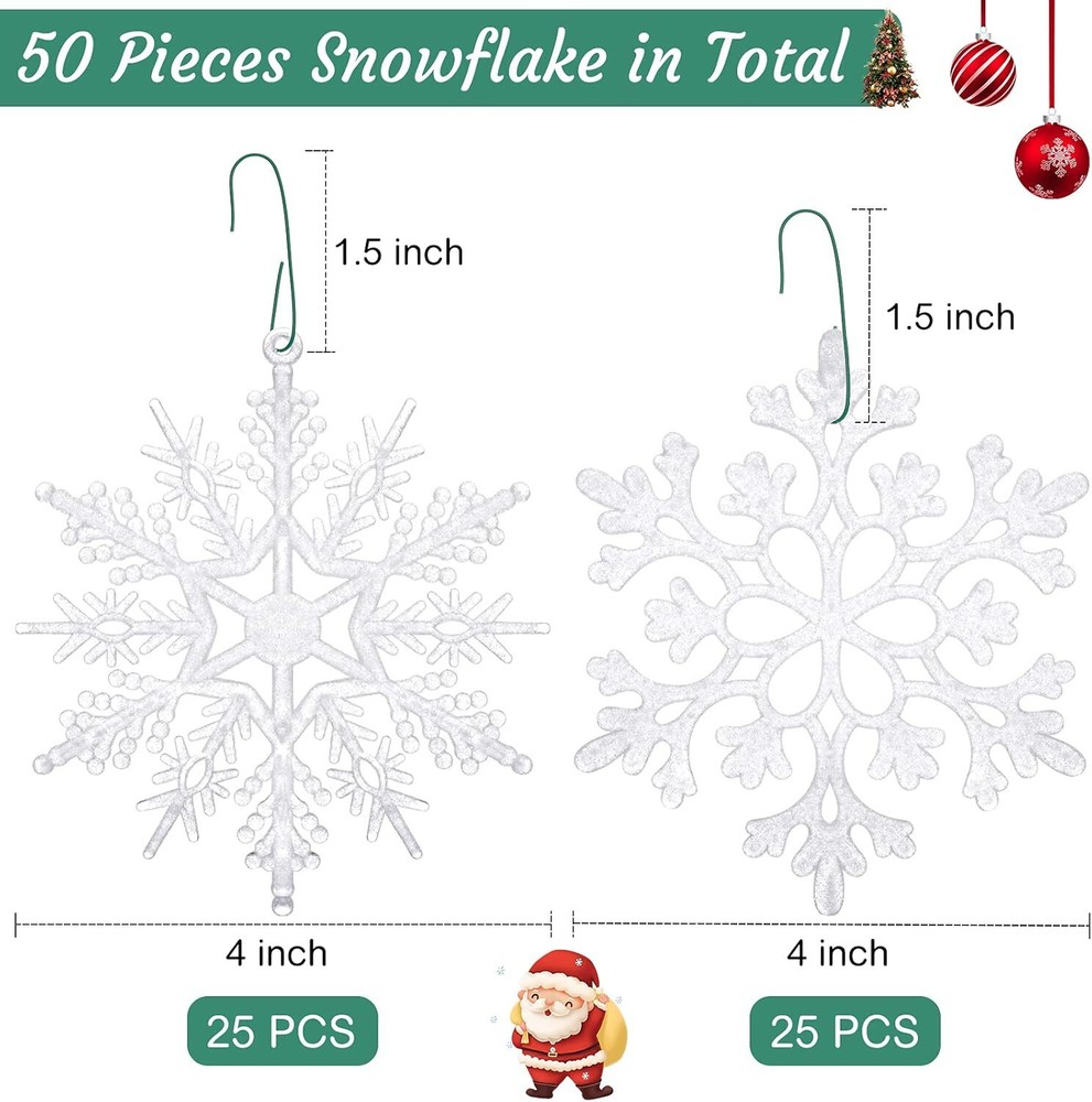 4 inch/10 cm PP Plastic Christmas Snowflake Ornaments Core Parameters Material: PP plastic Size: 4 inch/10 cm in diameter Color: Glitter (styles may vary) Technical Specifications • 50 pieces Christmas glitter snowflakes (2 styles, 25 pieces each) • Includes 50 pieces hooks (golden/silver ropes may replace small green hooks) • Lightweight, durable, and fade-resistant • Suitable for indoor/outdoor decoration (Christmas tree, house, office, etc.) • Can be gifted or shared for festive occasions Package Information Package Dimensions: Not specified