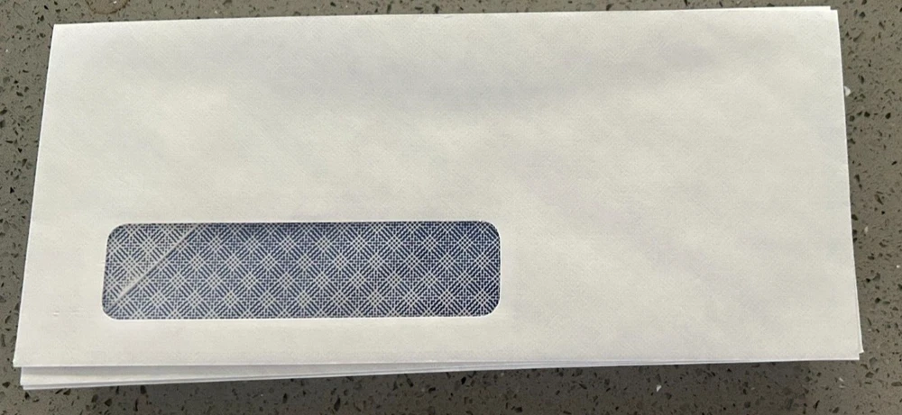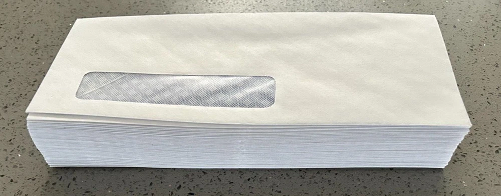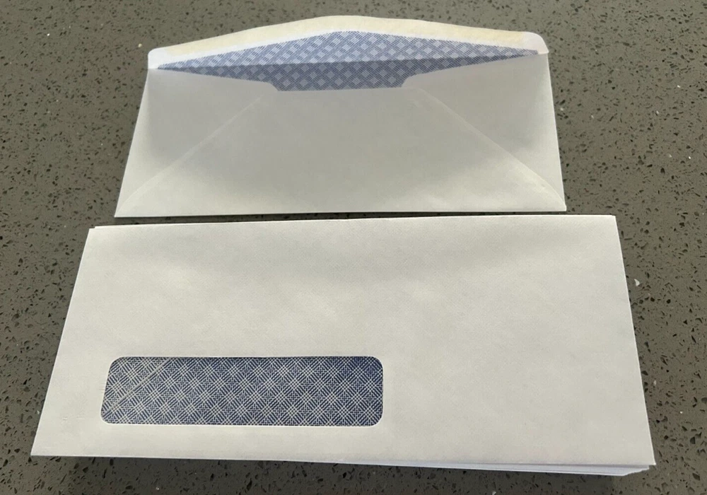 Lot of 50 white window security envelopes #10, 4 1/8 in x 9 1/2in, gummed closure.