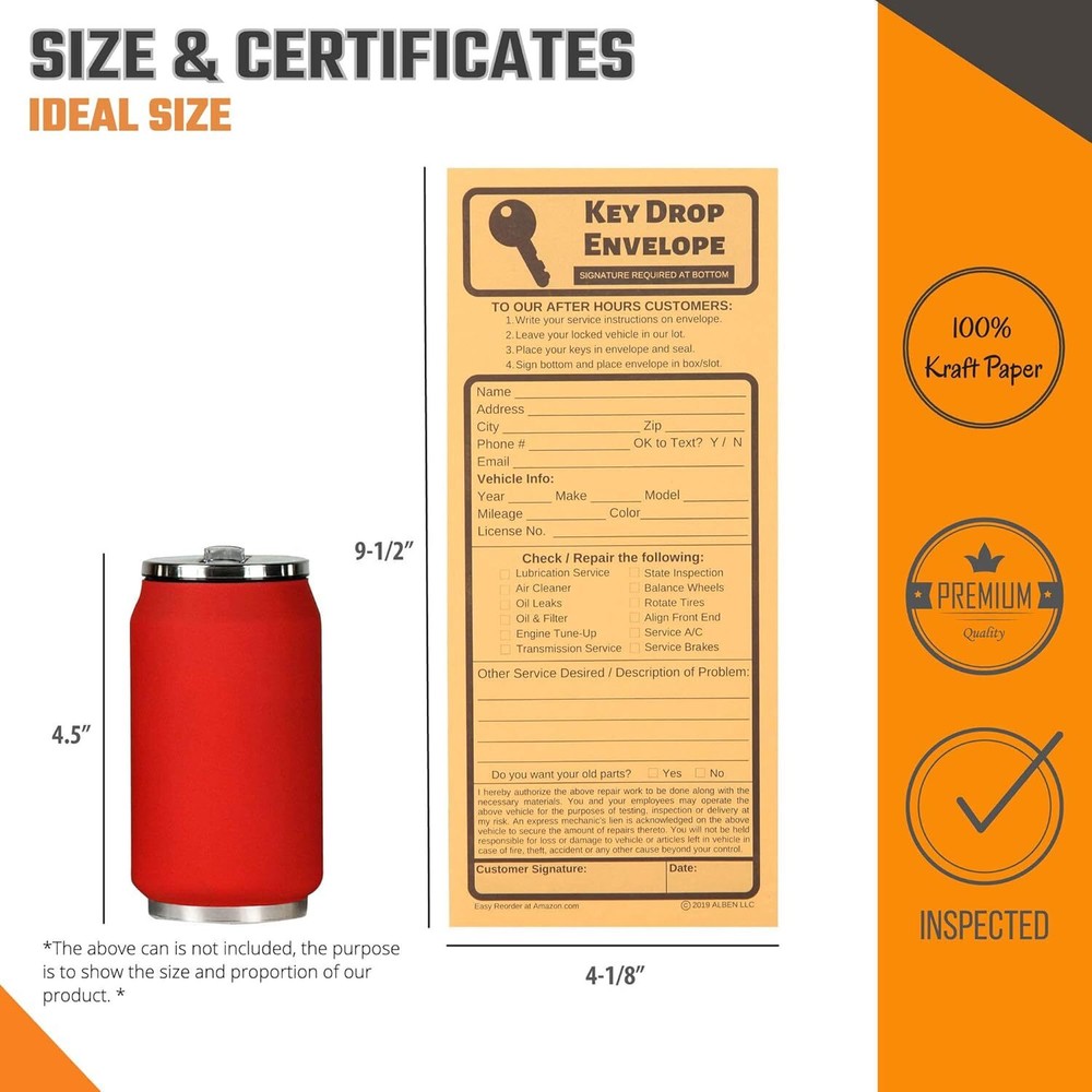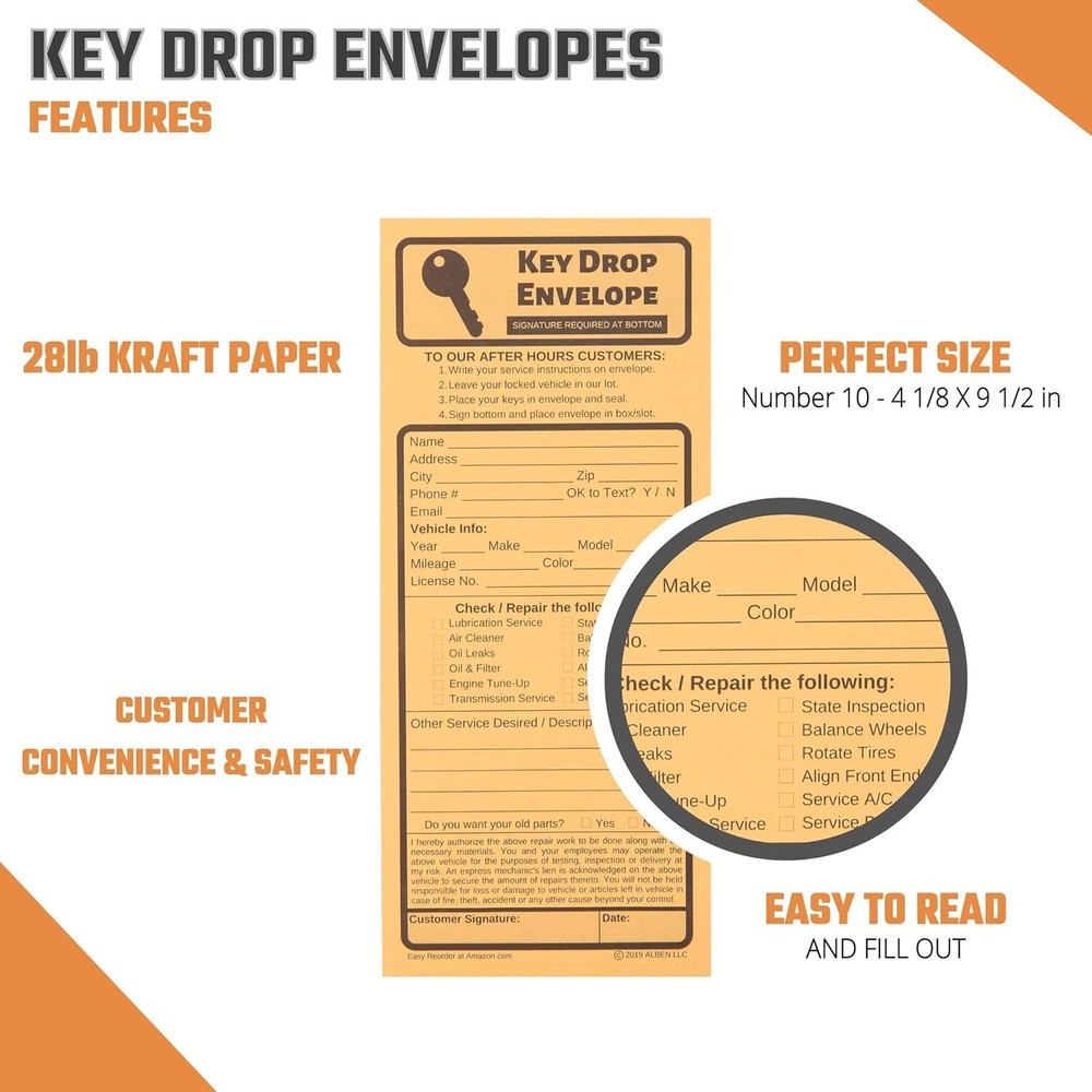 500 Key Drop Off Envelopes for After Hours – Auto Shop Repair/Service Drop Box Overnight Envelopes - Automotive Mechanic Car Drop Off for Overnight or Early Birds, Kraft Paper, 4 1/8 x 9 1/2 Item Description About this item 500 AFTER HOURS KEY DROP ENVELOPES-Alben’s night drop envelopes are ideally made in Number 10 Envelope Size measuring 4 1/8 inches Wide and 9 1/2 inches Long with a Peel and Seal closure flap ALL INCLUSIVE EARLY BIRD ENVELOPES-Our early bird drop off envelopes include Customer Drop Off Instructions, Personal Information, Checklist for Requested Repairs/Services, Blank Space for Additional Information, Terms, Signature and Date CUSTOMER CONVENIENCE & SAFETY–Our night key drop box envelopes are made with strong 28lb Kraft paper and may also be used as cashier envelopes, safe drop envelopes for money, cash deposit envelopes or money drop envelopes EASY TO USE REPAIR ENVELOPES-Each overnight key drop box comes with a neatly pre-printed checklist to check off the desired repair AUTO REPAIR SHOP KEY ENVELOPES-We ensure that our repair shop envelope drop box will meet your expectations and offer returns on our key drop off box; If you have issues with key drop box automotive outdoor set, contact us and we will ensure you have a positive experience › See more product details Payment We accept payment only through PAYPAL Shipping We ship products worldwide through standard express courier service, it will reach within 7 to 10 days to abroad buyers, we ship the product after recieved clear payment and give full information about shipment to the buyer Return We accept product return within 7 to 21 days from delivery date but product should be in original position and not in damaged condition,the return shipping charges will be buyer responsibility