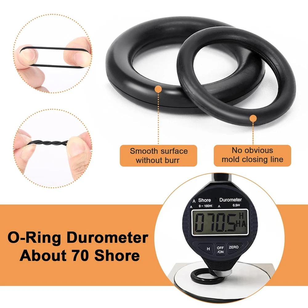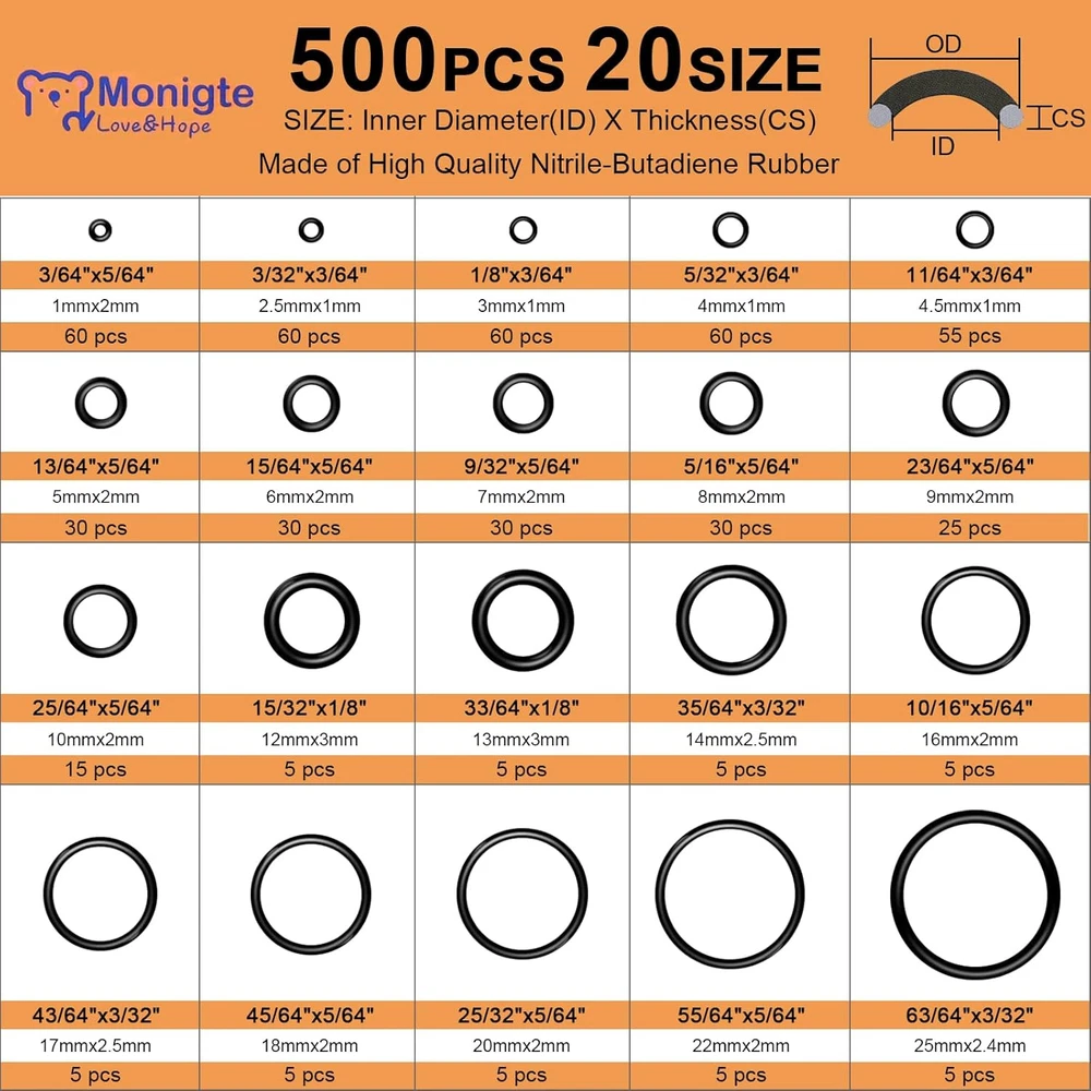 500 Pcs 20 Sizes O Ring Kit,Rubber O-Ring Assortment Kit, Rubber Black Product Details Package Dimensions : 6.57 x 5.12 x 0.67 inches; 3.84 ounces Manufacturer : Monigte Material: Nitrile Rubber Brand: Monigte Color: Black Manufacturer: Monigte Unit Count: 500.0 Count Wide Range of Applications: This O-ring assortment kit is ideal for use in faucets, plumbing, pressure washers, hose nozzles, sinks, filters, and automotive engines.It's good for sealing and repairing mechanical bearings, pumps, boats, oil and gas control valves, spray systems, air conditioners, kitchens, bathrooms, and more.Whatever your industrial project, this kit offers reliable sealing solutions for multiple uses. Assortment of Sizes: The kit includes 500 rubber O-rings in 20 different sizes, ensuring you always have the right fit for your projects. These O-rings are essential for various sealing tasks, making it a must-have for both professionals enthusiasts.With multiple size options, you’ll be able to tackle a wide range of repairs and installations efficiently. Premium Quality Rubber O-Rings: Made from high-grade Nitrile Butadiene Rubber (NBR), these O-rings are highly durable and resistant to wear, deformation, corrosion, and extreme temperatures ranging from -40°F to 248°F (-40°C to 120°C).Whether you're dealing with hot or cold environments, the O-rings maintain flexibility and effectiveness, making them for demanding industrial applications. Convenient Classification: Each O-ring is stored in a sturdy plastic case with individual compartments, clearly labeled for easy identification and retrieval. The detailed size chart helps you find the exact O-ring quickly, saving you time and effort during installation or repair work.It's a convenient solution for keeping all your O-rings in order and ready for use. Use in Plumbing and Machinery: Designed for high-performance sealing, these rubber washers and O-rings are ideal for use in plumbing, hydraulic systems, and mechanical equipment.They provide excellent sealing in faucets, engines, pumps, and pressure washer hoses, ensuring a tight and reliable seal to prevent leaks.Suitable for various industries, from home repairs to heavy duty industrial work.