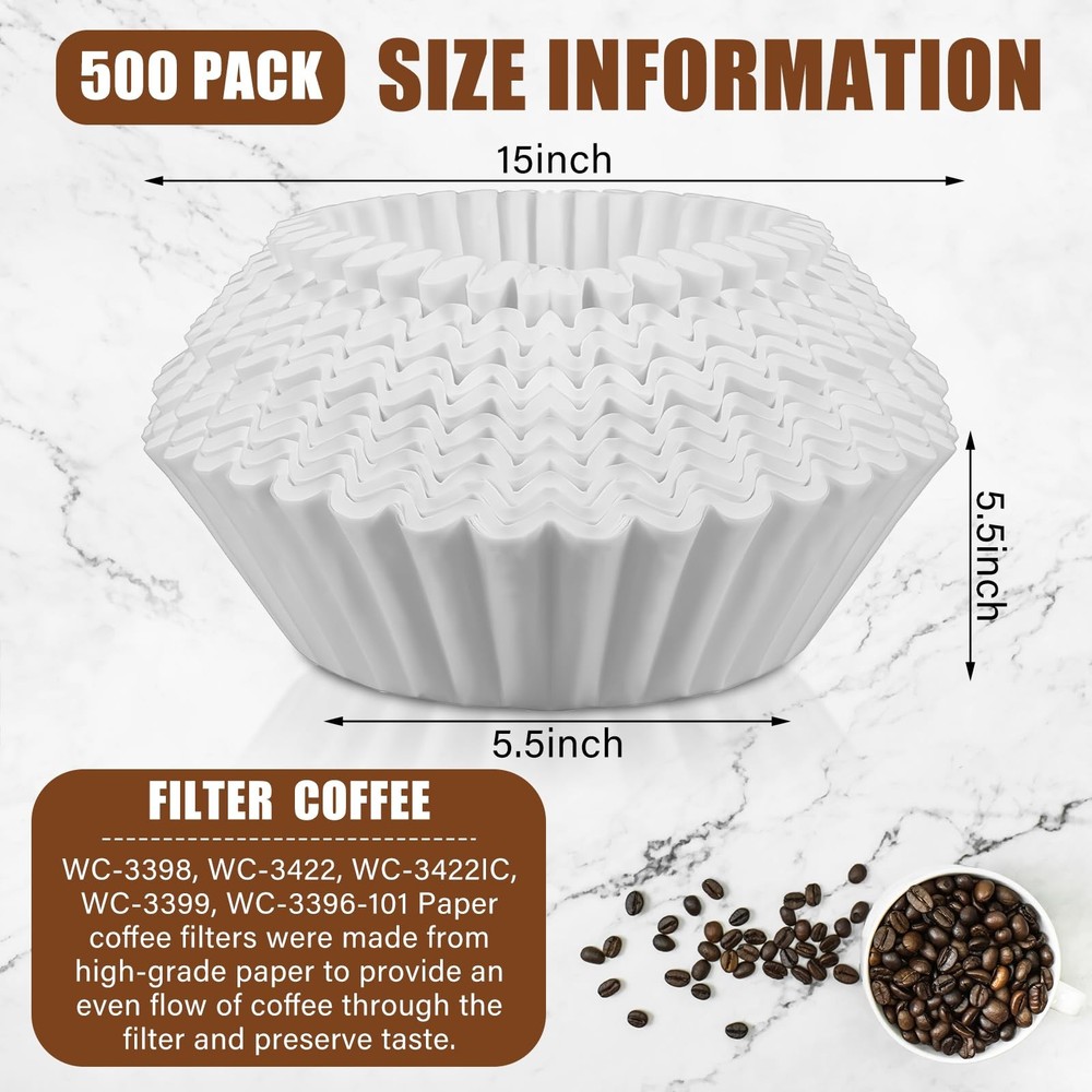 Features: Use of range: Ideal for coffee, iced tea large-batch brewing, whether you're brewing smooth iced tea, bold coffee, or specialty cold brews, these capacity filters deliver consistent results and are trusted by professionals and home brewers alike. Ideal gift: It is synonymous with a full line of commercial coffee brewing equipment, iced tea brewing systems and specialty beverage dispensers. These paper coffee filters are easy to use and dependable for restaurants. Specifications: Material: paper Color: white Size: 15In x 5-1/2In Package includes: 500 x Paper coffee filters Notes: Manual measurement, please allow slight errors on size. The color may exist a slight difference due to different screen displays. Reliable material: the paper coffee filters were made from quality paper to provide an even flow of coffee through the filter and preserve taste; Extra large filter for high volume brewing (15“ x 5-1/2”) designed for commercial brewers to ensure a fit in restaurants, cafes, banquet halls, gas stations, etc. and won't get dirty when brewing Designed to be applied with commercial coffee brewers; Paper coffee filters (commercial use) prevent coffee grounds from overflowing while brewing; Fine paper for smooth, full-bodied flavor - our fine filter paper maximizes extraction, prevents coffee grounds or tea leaves from seeping through, and ensures a full-bodied every time Quantity Packaging: includes 500 pieces, large packaging is designed for daily commercial use, which will last you for a long time; It is suitable for businesses, event venues and busy kitchens that need reliable high-performance filters; Paper filters can meet the needs of commercial coffee brewers and preserve coffee flavor Quality Material: these paper coffee filters are easy to use and a trusted choice for restaurants; NO SPILLS, NO TEARS - HIGH SIDE DESIGN, MAXIMUM CAPACITY - With extra-high sides and reinforced construction, these filters easily accommodate large batches, preventing spills, tears, and messy spills in high-volume brewing environments Wide Application: designed to meet the sturdy and performance needs of service professionals; These commercial coffee filters are popular for their ability to preserve the fresh taste of delicious coffee; Ideal for coffee, iced tea and large-volume brewing - Whether you're brewing smooth iced tea, espresso or specialty cold brew, these large-capacity filters deliver consistent results and are trusted by professionals and home brewers alike