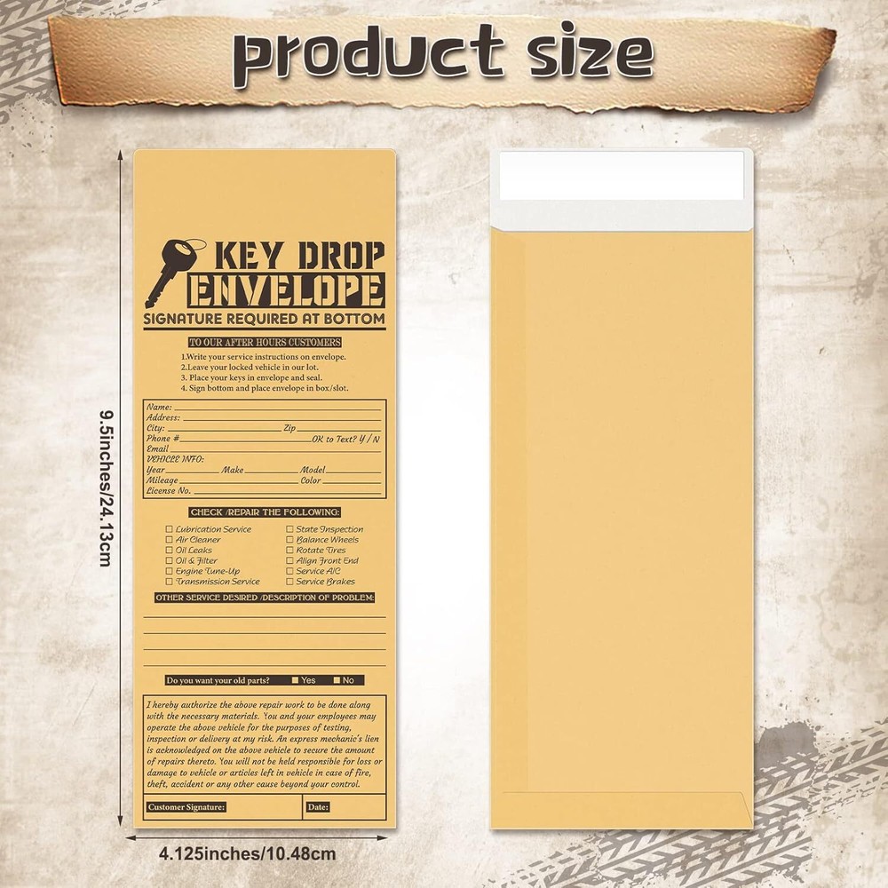 500 Pcs Drop Key Envelopes Auto Shop Repair Service Drop Box Self Adhesive Envelopes for Auto Repair Shops and Mechanics Kraft 4.125 x 9.5 Inches(Classic) Sufficient to Meet Your Needs: you will get 500 pieces of drop key envelopes, you can use them to hold your cards; Sufficient quantity will meet your using needs, and you can share them with your family Reliable Material: our self adhesive envelopes are made of reliable kraft material, safe and sturdy, there is adhesive on the back, will help you seal the envelope and keep the item from getting lost; And their reliable material will serve you for a long time Portable Design: overnight drop box envelopes have proper size in approx. 4.125 x 9.5 inches/ 10.48 x 24.13 cm, can hold your keys, cash, and other items; And you can put them into the mailbox, which will bring you convenience in using Useful and Practical: our overnight envelopes are designed in black font, including lots of information, like name, address, service details, date, signature, etc., print clearly for easy reading, will give you a good using experience Easy to Use: each key drop envelope has the clear template, convenient for you to record maintenance and other work details; It is light and portable, won't take up too much space, you can put it into your bags, and you can carry it to other places easily Color Black Closure Type Self-Seal Occasion Auto Repair Shop Material Paper