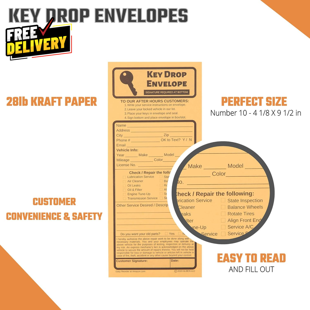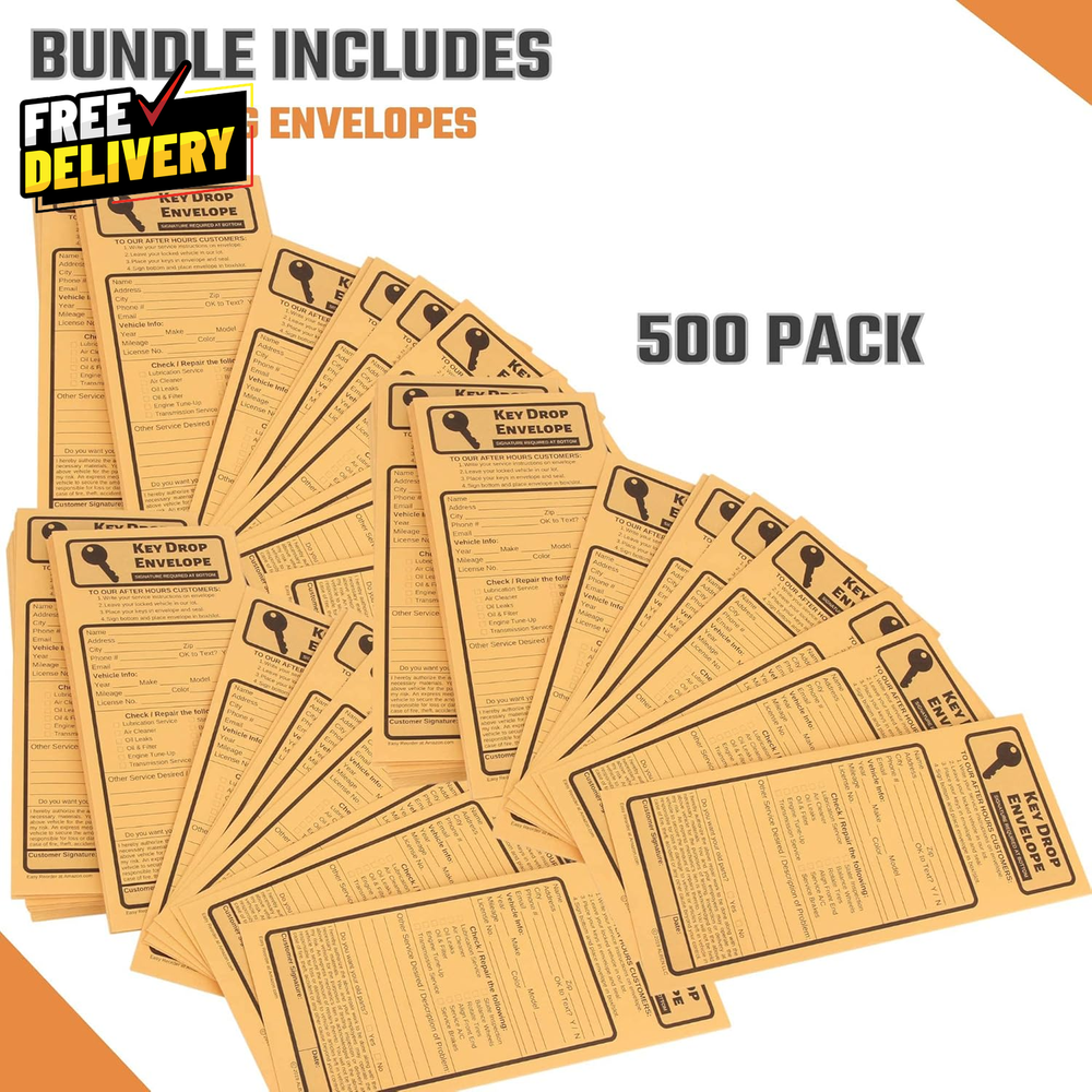These key drop envelopes are a game-changer for auto shops! The peel-and-seal closure keeps keys secure, and the included forms make customer check-ins effortless. Perfect size, durable, and the 500-count pack ensures you’ll never run out. A must-have for any after-hours service!