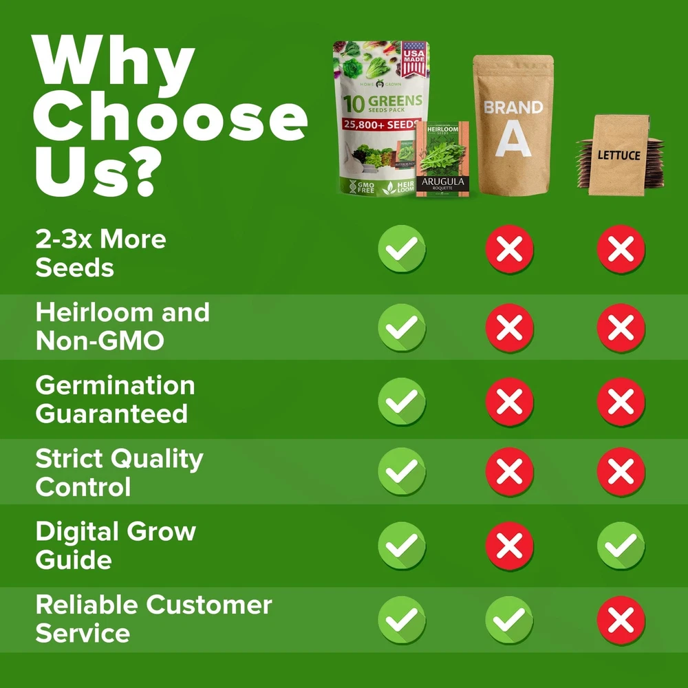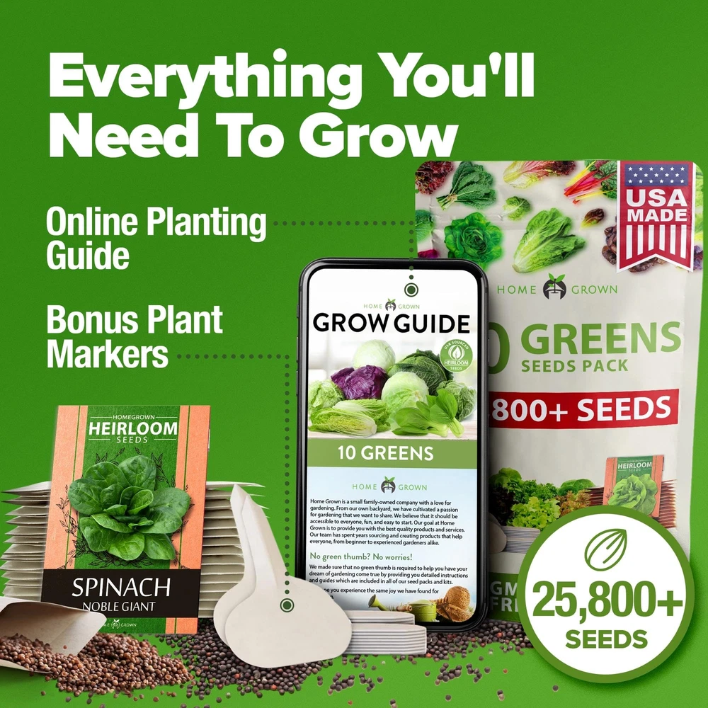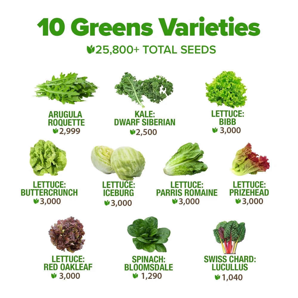 Included in each pack: Varieties - Counts (estimated) Total: ~1500 Paris Island Romaine Lettuce Seeds ~ 150 Buttercrunch Lettuce Seeds- 150 Red Oak leaf Lettuce Seeds - 150 Iceberg - 150 Prizehead Lettuce Seeds- 150 Bibb Lettuce - 150 Dwarf Siberian Kale Seeds - 150 Nobel Giant Spinach Seeds - 150 Arugula Seeds (Roquet) - 150 Swiss Chard Seeds - 150 10 ea Plant Markers 1 ea Planting Guide Our heirloom Non-GMO seeds are great for gardeners, survivalist, , and chefs alike. Get yours today! Harvesting Time: Majority of lettuces - 40-60 days Romain - 75-80 days Crisphead - 70-100 days Looseleaf and butterhead - Anytime during development Considered to be a care-free growing crop Ideal growing PH - 6.0 - 8.0 Ideal temp - 80 degrees or warmer for germination Can easily be started indoors and transferred outside or in a hydroponic system 10 MOST POPULAR LETTUCE AND LEAFY GREEN VAULT PLUS BONUS PLANT MARKERS - Start growing your own garden and eating all-natural, healthy, non-GMO lettuce and leafy greens straight from your yard or indoor garden. FALL AND WINTER VEGETABLE PREP - Plant seeds all year indoors and start your own leafy green vegetable garden to enjoy amazing greens and salads all year. These can be used as a indoor garden, gardening kit, or in an outdoor garden bed. Plant more and use as spouts or micro greens. Complement your bugout bag survival kit with ready-to-grow heirloom survival seeds. 5,000 TOTAL SEEDS & DETAILED PLANTING GUIDE - Our assorted heirloom seeds pack have a large variety of seeds and with high germination rates. These make great lettuce seeds for planting indoor, outdoor, or in a hydroponic system like aerogarden. Included as well is a planting guide in each pack. GREAT GIFT FOR GARDENERS - CHEFS - SURVIVALIST - What else is better than giving a gardener a full of collection to have a bountiful vegetable garden. Seeds are contained inside in waterproof resealable mylar pouch to maintain freshness and quality of the seeds. Our collection of lettuce and greens starter seeds make for a great addition to your prepper gear and supplies. PRODUCT OF USA - Our garden seeds are sustainably sourced in the USA. Have confidence about our quality and 100% satisfaction . These seeds can work with aerogarden pods and other hydroponic systems. Visit and for all kinds of vegetable herb and greens seeds to complete your bug out bag supplies.