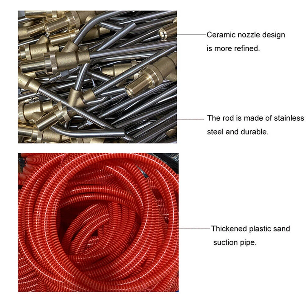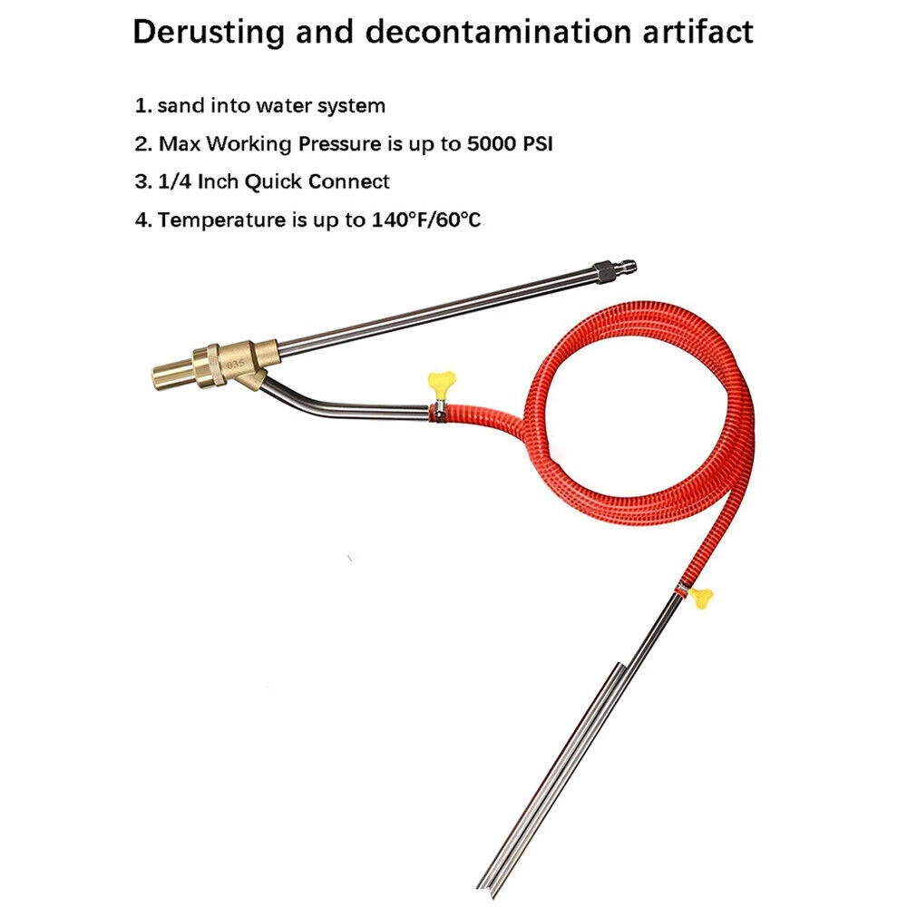 Descriptions: SANDBLASTING PACKAGING KITS: HIGH-QUALITY & DURABLE MATERIAL: WORKING PRINCIPLE: WIDELY APPLICATION: EASY to USE: Specification: Product name: Pressure Washer Sandblasting Kit Material: brass, stainless steel, plastic and ceramic Color: as show Hose: 3m/9.84ft Max Working Pressure: 5000 PSI Max Temperature: 60℃/140°F Connection: 1/4" Quick Connect Plug Washer wand: 40.5cm/16 inch Sanding wand: 40.5cm/16 inch Application: removing rust, graffiti, paint, grease baking and scale Package List: 1 x Pressure Washer Wand (Water Input) 1 x Sand Wand (Sand Input) 1 x Hose 6 x Hose Clamps 1 x Goggles 2 x Long Ceramic Nozzles 2 x Short Ceramic Nozzles 4 x Rubber Bands How to Set Up: Step 1: Connect the washer wand to the pressure water gun. Step 2: Connect the 1/4 connector to th Pressure Washer Sandblasting Kit Sand Blaster for Pressure Washer 5000PSI US Hot Descriptions: SANDBLASTING PACKAGING KITS: You will get a 3m hose, 16" pressure washer wand (water input), 15 3/4" sand wand(sand input), goggles, 4 hose clamps, 3 sets ceramic nozzles (There is a pair of nozzles in the sandblaster), and 6 O-rings. HIGH-QUALITY & DURABLE MATERIAL: Sandblasting kits are made of durable materials, brass, and stainless steel, which are resistant to corrosion, and abrasion, and have stable performance. Its working pressure can reach 5000PSI and the temperature can reach 60 ℃ / 140 °F. WORKING PRINCIPLE: The pressure washer sandblaster kit is used to inject sand into the water system for cleaning. Use dry silica sand, baking soda, fine sand, or washed river sand for better results. If the hose is blocked, please rinse it with clean water. WIDELY APPLICATION: The pressure washer sandblaster kit is mainly used to remove rust, graffiti, paint, grease scale, and other stubborn materials, and is ideal for household and factory abrasive cleaning! Our power sandblaster kit can greatly improve efficiency, and remove rust faster and more conveniently. EASY to USE: 1/4 inch quick connector on the end of a gun, suitable for most pressure washers. In addition to the ceramic nozzles in the sandblaster, we also offer two additional sets of replaceable ceramic nozzles that you can replace at any time. Specification: Product name: Pressure Washer Sandblasting Kit Material: brass, stainless steel, plastic and ceramic Color: as show Hose: 3m/9.84ft Max Working Pressure: 5000 PSI Max Temperature: 60℃/140°F Connection: 1/4" Quick Connect Plug Washer wand: 40.5cm/16 inch Sanding wand: 40.5cm/16 inch Application: removing rust, graffiti, paint, grease baking and scale Package List: 1 x Pressure Washer Wand (Water Input) 1 x Sand Wand (Sand Input) 1 x Hose 6 x Hose Clamps 1 x Goggles 2 x Long Ceramic Nozzles 2 x Short Ceramic Nozzles 4 x Rubber Bands How to Set Up: Step 1: Connect the washer wand to the pressure water gun. Step 2: Connect the 1/4 connector to the hose. Step 3: Insert the sand wand into the medium (such as dry silica sand, baking soda or washed river sand). Note: Please make sure that the sand is dry, otherwise it cannot be used. Step 4: Turn on the pressure washer and water and sand will flow from the nozzle. Payment Shipping Return Contact us About us Payment 1.Paypal, Credit Card, G Pay etc, many payment way is accepted. 2.Please be sure your shipping address is correct before make a payment. Shipping 1.We will ship out the item within 1-3 business days after comfirming the payment, appreciate your patience. 2.If the items are broken on the way( we will check the orders clearly before we sent them ),please contact us in 3 days you received it. We will send you a new one or refund your payment. Return 1.We stand behind every buyer.Items can be returned for exchange or refund within 30 days. 2.Please contact us when you have any confusion of our item, we will solve the trouble for you as soon as possible. Contact us 1.This is professional Seller.We will reply your message within 24 hours. 2.Please contact us whenever you have any question about the item. We will deal with it as soon as possible. 3. If you are unhappy with the item or our service,please Contact Us before leave feedback,just give me a chance,thank you! About us 1. Unless specified otherwise, all our products are IN STOCK and are shipped from Local warehouse - Not Overseas! 2. We provide a 30 day Satisfaction Guarantee or your money back (provided items are in the same new and resaleable condition.) 3. We have a PayPal Verified Business Account, please buy with Confidence! 4. Every item will be tesrted before send.We know our products well and if we don't have the answers we will do our best to find them for you! 5. Our friendly team look forward to serving you! Your satisfaction is our No.1 Priority We will do our best to satisfacy you.