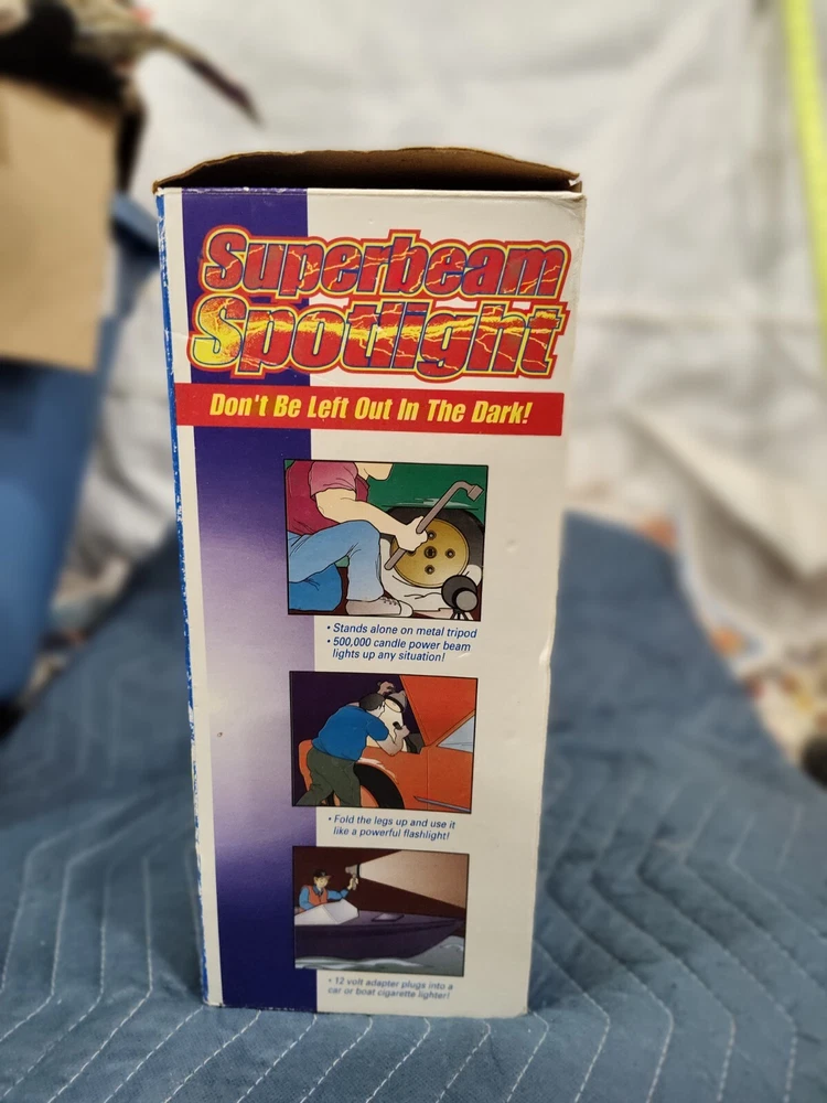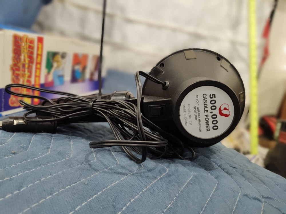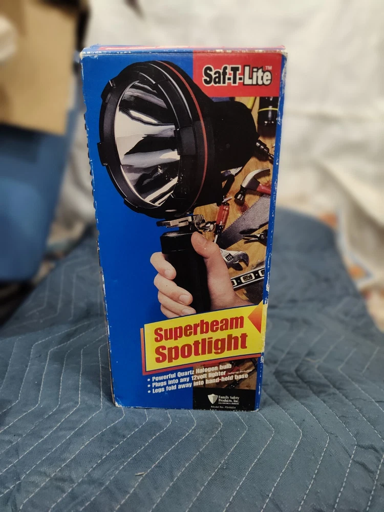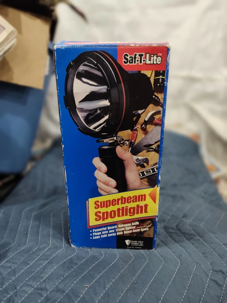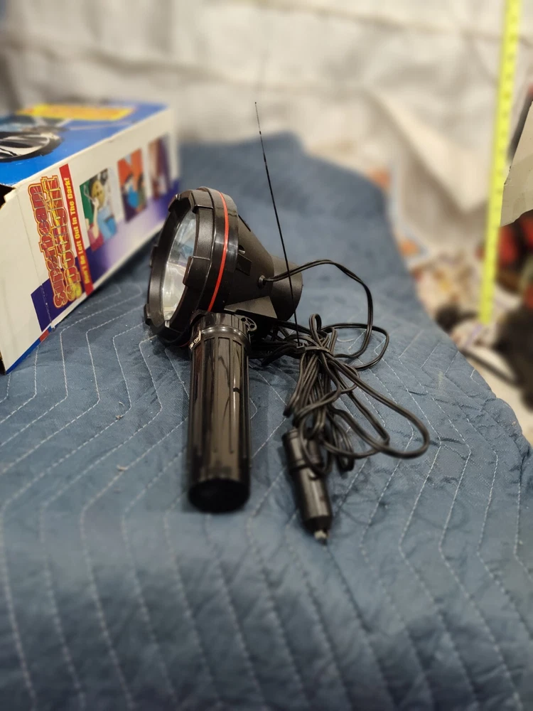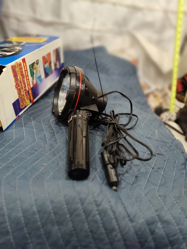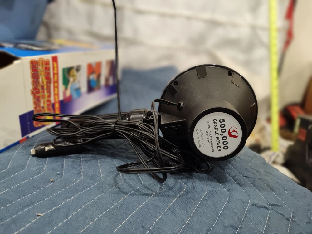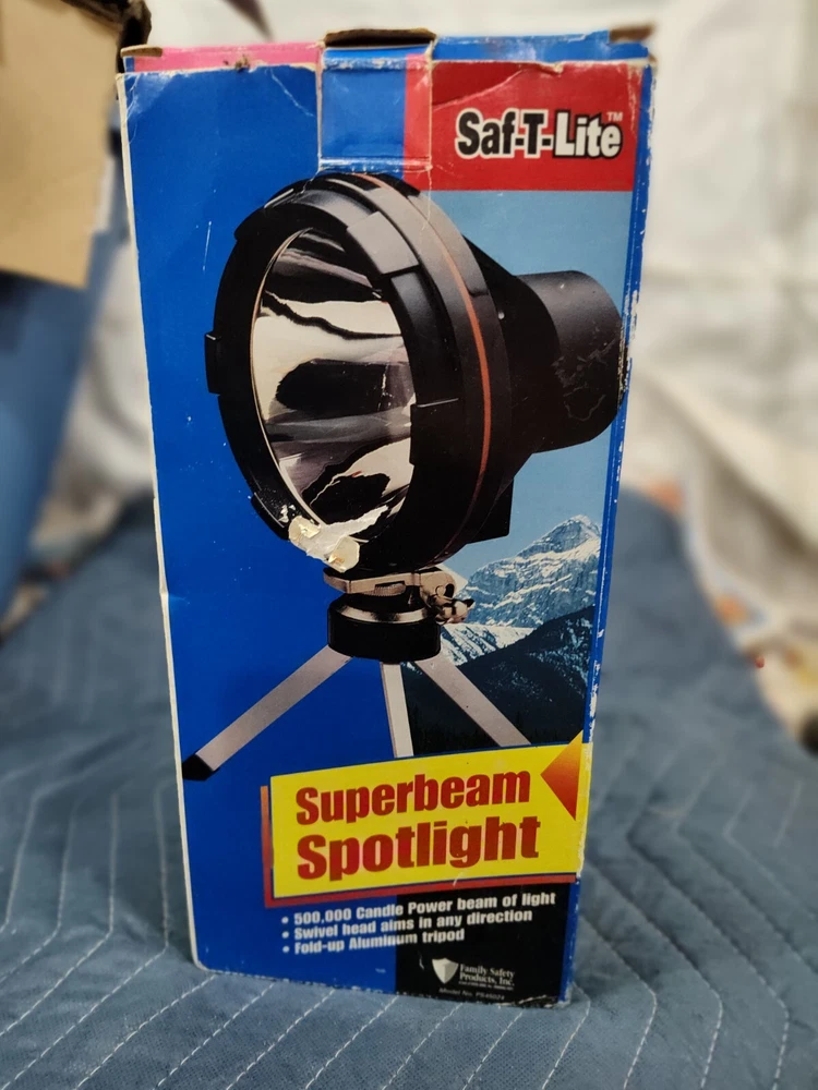 This is a high-powered portable spotlight with a built-in battery and USB power source. The spotlight is made of durable ABS material and features LED lighting technology. It is a SAF-T-LITE brand searchlight spotlight with a quartz halogen bulb and an item length of 13 inches. The spotlight is waterproof and handheld, making it perfect for camping and hiking. . The color of the spotlight is black and it has a width of 3 inches. 500,000Candle power tested works like it should