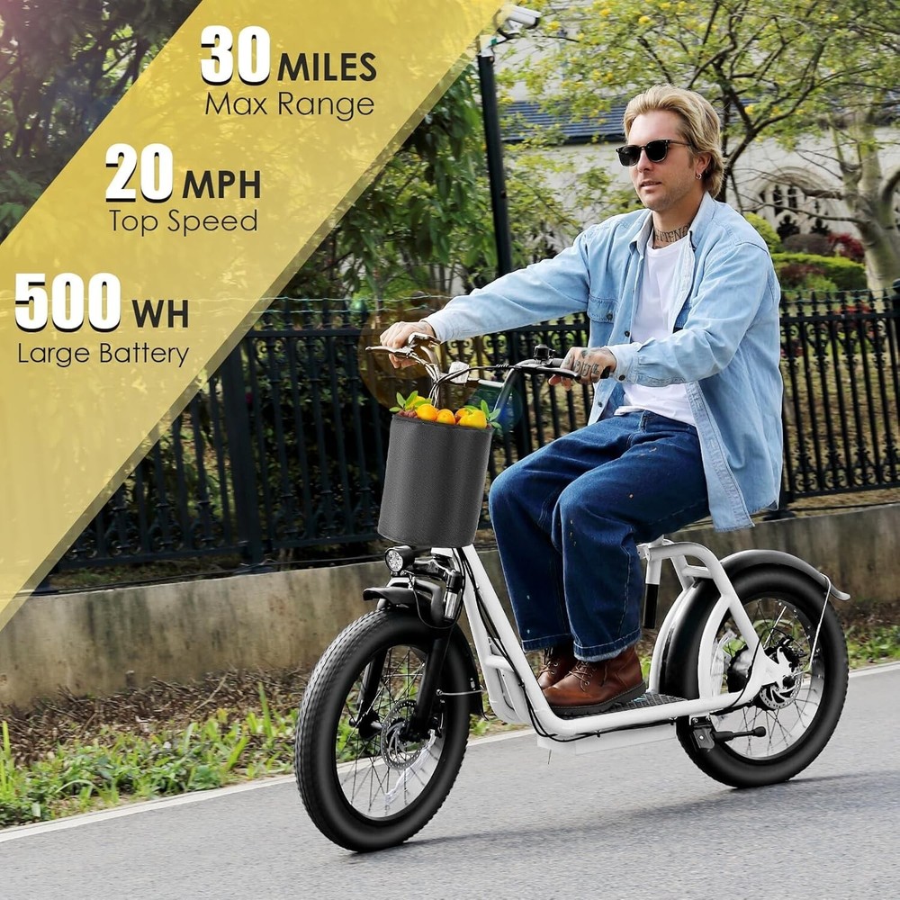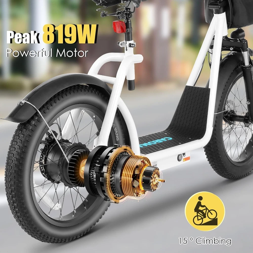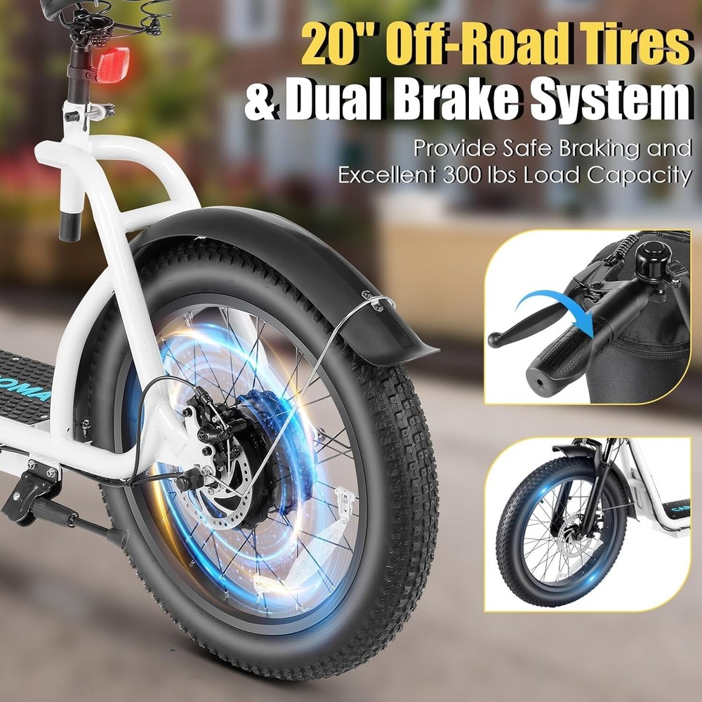 Product Description About this item 【20"X3" Fat Tire】Puncture-proof 20"*3" oversized fat tires can provide superior grip, stability and comfort on various terrains. Whether on sand, mountain roads, snowy roads or various terrains, Caroma electric scooters can bring you a comfortable riding experience. 【Upgraded Brushless Hub Motor】The upgraded 500W(Peak 819W) brushless hub motor has stronger climbing ability. In pure electric mode, it can reach speeds of up to 20MPH(32KM/H) and easily conquer slopes of up to 15 degrees. For all your riding needs. 【Long-lasting Battery Life】High-capacity lithium battery (48V/10.4Ah) certified by UL 2272, which can travel up to 30 miles (48KM) per full charge. Equipped with safe and reliable fast charging technology, it only takes 5-6 hours to fully charge, making it ideal for short trips, picnics, and shopping. 【Off-road Suspension System】The electric scooter is equipped with 2 front fork spring shock absorbers, 2 seat shock-absorbing springs and 2 puncture-resistant 20"X3" fat tires, which can effectively absorb ground impact while riding and provide better control. Combined with front and rear mechanical disc brakes and an EABS system, you can enjoy a comfortable ride and powerful braking, even on steep slopes, rough terrain, or other extreme terrain.