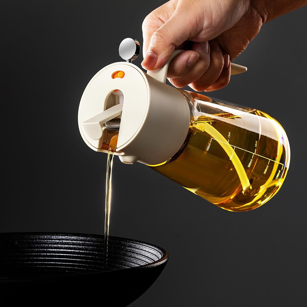 1 2 in 1 Spray and Pour Functionality: Our oil dispenser for kitchen features a dual-function design, fulfill various cooking needs with the convenience of both spray and pour features, saving valuable kitchen space. Switch-Controlled Smart Lid: Enjoy effortless pouring with the automatic lid opens as the oil spray bottle tilts when the switch is on. Lock the switch for worry-free spray functionality. Enhanced Nozzle Power: The upgraded version of olive oil bottle boast a more powerful nozzle, delivering finer oil mist with a quick lever press and a steady oil stream with a slow press. Reliable Quality: Crafted from reinforced borosilicate glass, our cooking oil dispenser is non-toxic, odorless, and built to last, ensuring a reliable and durable kitchen companion. Lifetime Warranty: We are confident in the quality of our olive oil sprayer. If you have any concerns, our customer support is available to provide a hassle-free refund or exchange.