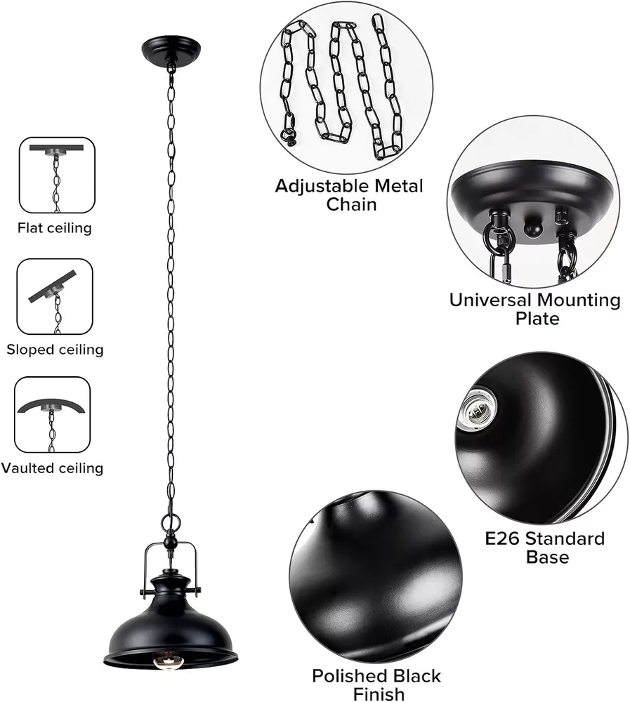 50.5'' Adjustable Dome Pendant Light with Polished Black Finish for Dining Room ‹ › ‹ › ‹ › ‹ › ‹ › ‹ › ‹ › ‹ › 50.5'' Adjustable Dome Pendant Light -Embellished with a Polished Black Finish for Dining Room Indulge in Industrial Elegance Illuminate your living spaces with our sophisticated dome pendant light. Suspended gracefully by a sturdy chain link, this pendant showcases a traditional yet chic dome-shaped shade, all finished in a sublime polished black. Its vintage-inspired design elevates any area, radiating an aura of timeless elegance. Customized Hanging Height Overall Dimensions: 10.63” Diameter × 50.5” Height Includes a 36-inch adjustable metal chain to personalize your lighting experience. Compatible with flat, sloped, and vaulted ceilings - embrace versatility in your home. Round canopy measuring 5.13 inches wide Safety Meets Superior Quality CE & UL listed for reliable safety performance. Crafted from durable metal with exquisite workmanship, ensuring longevity indoors. Enjoy peace of mind with a 12-month warranty against non-human damage. Effortless Installation Hardwired for simplicity, this pendant light comes with all essential assembly parts and clear instructions, making the installation process intuitive. Compatible with E26 base bulbs (not included); suitable for LED, CFL, and Incandescent options, with a maximum rating of 60 watts. Versatile Lighting for Every Area The soft black shade gently diffuses light, creating an inviting ambiance that transforms your home into a sanctuary. Ideal for: Kitchen Dining Room Living Room Bedroom Entrance and Corridors Gallery and Cafés Elevate Your Space Let this exquisite pendant light redefine your interiors, bringing a touch of industrial sophistication to your home decor. Discover the allure of beautifully balanced light with our adjustable dome pendant light. Shipping Free & Fast Shipping - We offer free shipping to most of the USA with a normal delivery time of 3-7 days. However, due to the current situation, additional delivery time (up to 3 weeks) may be required for some items. Alternative Carriers - We may use alternative carriers (e.g. USPS, FedEx, UPS, etc.) to ensure your package arrives safely and on time. Due to the use of multiple carriers, we are unable to provide a tracking number automatically. Handling Time - Orders are processed and shipped within 1-2 business days of receiving cleared payment. Shipping Restrictions - Shipping to Alaska, Hawaii, Puerto Rico, Guam, and other US territories may incur shipping charges or delivery restrictions. Please contact us before ordering, or your order can be refunded/cancelled. State Restrictions - There may be restrictions based on your state of purchase. For example, certain items may not be shipped to California due to state regulations. Contact for Tracking Updates - If you require tracking updates or have any concerns about the delivery of your order, please feel free to contact us, and we will be happy to assist you. Return Please see our eBay Return Policy. Thank you. Payment We accept all major credit cards, PayPal, and Apple Pay for your convenience. Your payment information is secure and encrypted to ensure a safe and seamless transaction. Please complete your payment within 3 days of purchase to avoid any delays in shipping. Feedback Your feedback is extremely important to us. We strive to provide the best products and customer service possible. If you are satisfied with your purchase, please take a moment to leave us a positive review. If you have any concerns or issues with your order, please contact us before leaving negative feedback. We are committed to resolving any problems and ensuring your satisfaction. Contact Us If you have any questions or concerns, please feel free to reach out to our customer support team. You can contact us through the eBay messaging system. We are available Monday to Friday, 9:00 am to 5:00 pm EST, and we will do our best to respond to your inquiry within 24 hours. Thank you for supporting our small family business! UPC: Not Set Lumens: Industrial Hanging Light Item Height: Industrial Hanging Light Item Length: Industrial Hanging Light Item Weight: 3.67 pounds Item Width: Not Set Power Consumption: 60 watts Unit Quantity: 1 Material: Metal Room: Bedroom,Dining Room,Kitchen,Living Room Light Color: Black Features: Dimmable Department: Unisex Baby & Toddler,Kids,Teens,Adults Control Style: Touch Occasion: Birthday,Casual,Housewarming,New Home Light Direction: Downwards Labels & Certifications: Not Set Brand: Unbranded Type: Pendant Sensor Type: Light Style: Industrial Lighting Technology: Incandescent Color: Black Finish: Polished Number of Settings: 1 Shade Shape: Dome Power Source: Corded Installation Area: Indoor Energy Star: Not Set LED String/Strip Type: Not Set MPN: Not Set EC Range: Not Set Manufacturer: Not Set Item Diameter: 11 in Voltage: 120 V Year Manufactured: Not Set Number of Lights: 1-3 Amperage: Not Set Country/Region of Manufacture: Not Set Output Voltage: Not Set IP Rating: Not Set Era: 21st Century (2000-now) Manufacturer Warranty: Not Set Color Temperature: Not Set LED Chip Code: Not Set Model: Not Set Product Line: Not Set Unit Type: Unit Assembly Required: Not Set