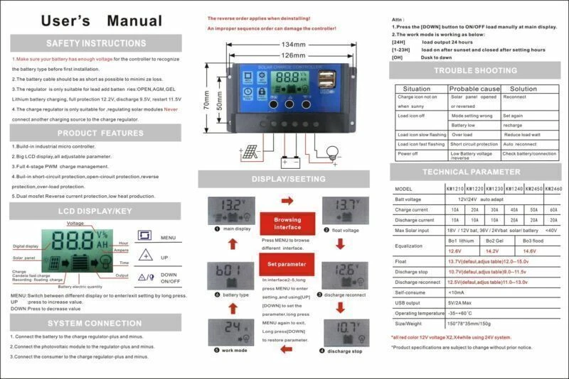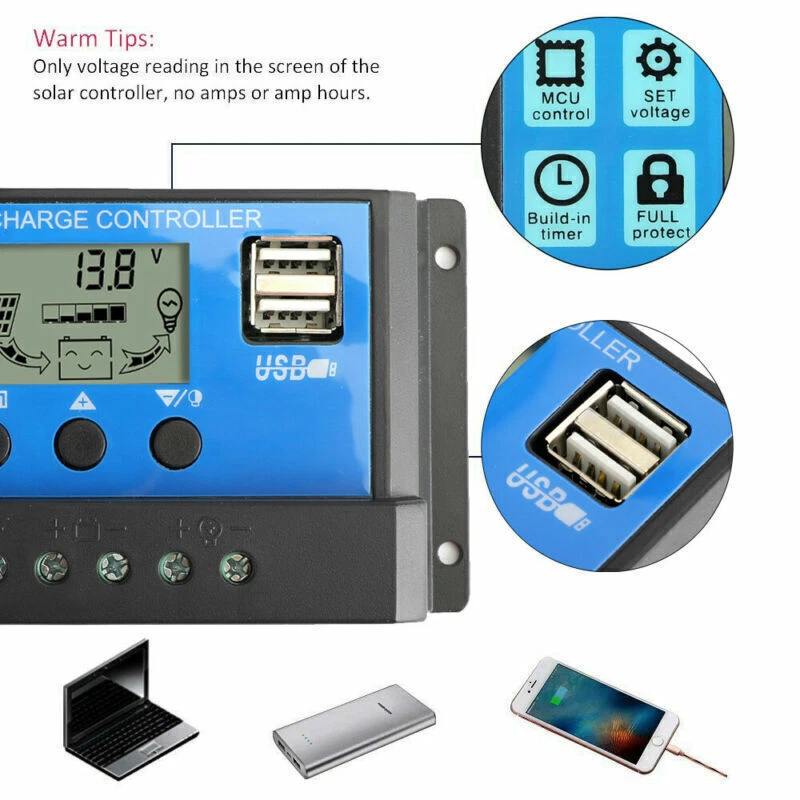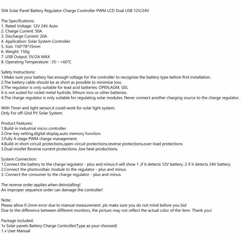 You may also like 60A MPPT Bluetooth APP Solar Charge Controller Charger Fits 12V-60V Battery Blue 38.85 USD Free shipping Solar Charge Controller PWM 12V Build In Timer Battery Control Adapter Black 12.85 USD Free shipping PWM 30A 12V 24V 48V Solar Charge Controller For Lifepo4 Lead Acid Gel Battery 50.85 USD Free shipping 60A 12V/24V Solar Panel Battery Regulator Charge Controller PWM 4-Stage Dual USB 15.85 USD Free shipping 12V/24V/36V/48V/60V 30A MPPT Wind Solar Hybrid Charge Controller Panel USB US 93.85 USD Free shipping 50A MPPT Bluetooth Solar Charge Controller Charger 12V/24V Lithium Battery Gold 27.41 USD 28.85 USD Free shipping 5% off Dual USB Charge Controller Auto Focus Solar Panel 12V-24V Regulator MPPT 100A 41.85 USD Free shipping PWM 30A Solar Battery Regulator Charge Controller 12V 24V 4-Stage Dual USB 13.85 USD Free shipping 40A MPPT High Energy Solar DSP Controller Repair Battery APP to Remotely Manage 61.85 USD Free shipping 10A/20A/30A Solar Panel Regulator Charge Controller PWM LCD Dual USB 12V/24V 12.85 USD Free shipping 30A MPPT High Energy Solar DSP Controller Repair Battery APP to Remotely Manage 58.85 USD Free shipping 30A MPPT Bluetooth Solar Charge Controller Charger 12V/24V Lithium Battery Gold 26.85 USD Free shipping 50A Solar Panel Battery Regulator Charge Controller PWM LCD Dual USB 12V/24V The Specifications: 1. Rated Voltage: 12V/24V Auto 2. Charge Current: 50A 3. Discharge Current: 20A 4. Application: Solar System Controller 5. Size: 150*78*35mm 6. Weight: 150g 7. USB Output: 5V/2A MAX 8. Operating Temperature: -35~+60℃ Safety Instructions: 1.Make sure your battery has enough voltage for the controller to recognize the battery type before first installation. 2.The battery cable should be as short as possible to minimize loss. 3.The regulator is only suitable for lead acid batteries: OPEN,AGM, GEL it is not suited for nickel metal hydride, lithium ions or other batteries. 4.The charge regulator is only suitable for regulating solar modules. Never connect another charging source to the charge regulator. With Timer and light sensor,it could work for solar light system. Only For off-Grid PV Solar System. Product Features: 1.Build-in industrial micro controller. 2.One-key setting,digital display,auto memory function. 3.Fully 4-stage PWM charge management. 4.Build-in short-circuit protections,open-circuit protections,reverse protections,over-load protections 5.Dual mosfet Reverse current protections ,low heat productions. System Connection: 1.Connect the battery to the charge regulator - plus and minus.it will show 1 ,if it detects 12V battery, 2 if it detects 24V battery. 2.Connect the photovoltaic module to the regulator - plus and minus. 3. Connect the consumer to the charge regulator - plus and minus. The reverse order applies when deinstalling! An improper sequence order can damage the controller! Note: Please allow 0-2mm error due to manual measurement. pls make sure you do not mind before you bid Due to the difference between different monitors, the picture may not reflect the actual color of the item. Thank you! Package included: 1x Solar panels Battery Charge Controller(Type as your choosed) 1 x User Manual -About US Founded in 2012, VIPJQ have professional development and sales, and are involved in various products, providing customers with various high-quality products. Since its establishment, VIPJQ has always adhered to the service concept of "customer first" and the management concept of "pursuit of quality", and is committed to providing customers with high-quality original designs. We commit to provide you the best innovative, quality products & professional services with competitive prices. We value every customer, and we look forward to providing solutions for your business needs to help your business achieve its goals, please contact us immediately! We are all about you! We are a Japanese seller,but with large warehouse in USA. We are profesional on Auto Parts,Car Parts,Motorcycle Parts,3C,other hot sale items and so on. We aim to provide to customers high quality product and best service. -About Shipment&Returns The item usually will be dispatched within 3 days after you ordered.All are free shipping. And it usually takes 3-10 working days to delivery depends on buyers' address or other majeure on the way. If you are not satisfied with the items and want to return the item,we hope you could message us first,we will give you the return details, we think we could give you the best service to save your time and money.Thank you. -About Feedback&Customer Service If you are enjoy your shopping here,not only enjoy the items but also the service,we are appreciate you could give us a 5-star feedback. If you are not satisfied with the item,before you give us the negative feedback,we hope we could give you the best solution through our commutication. We think we could do it if you give us the chance.Thank you.