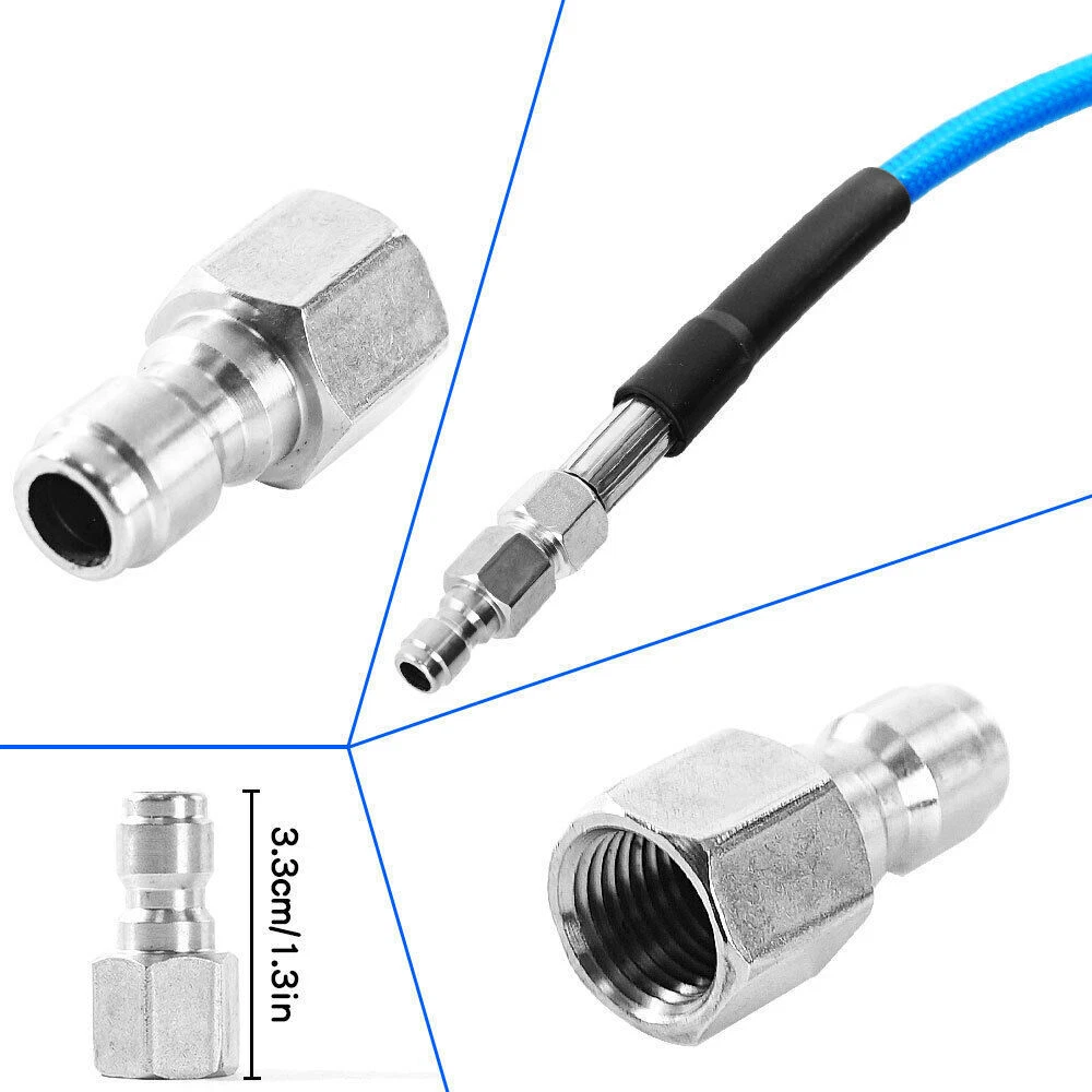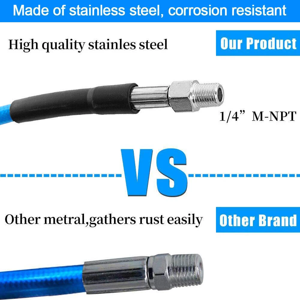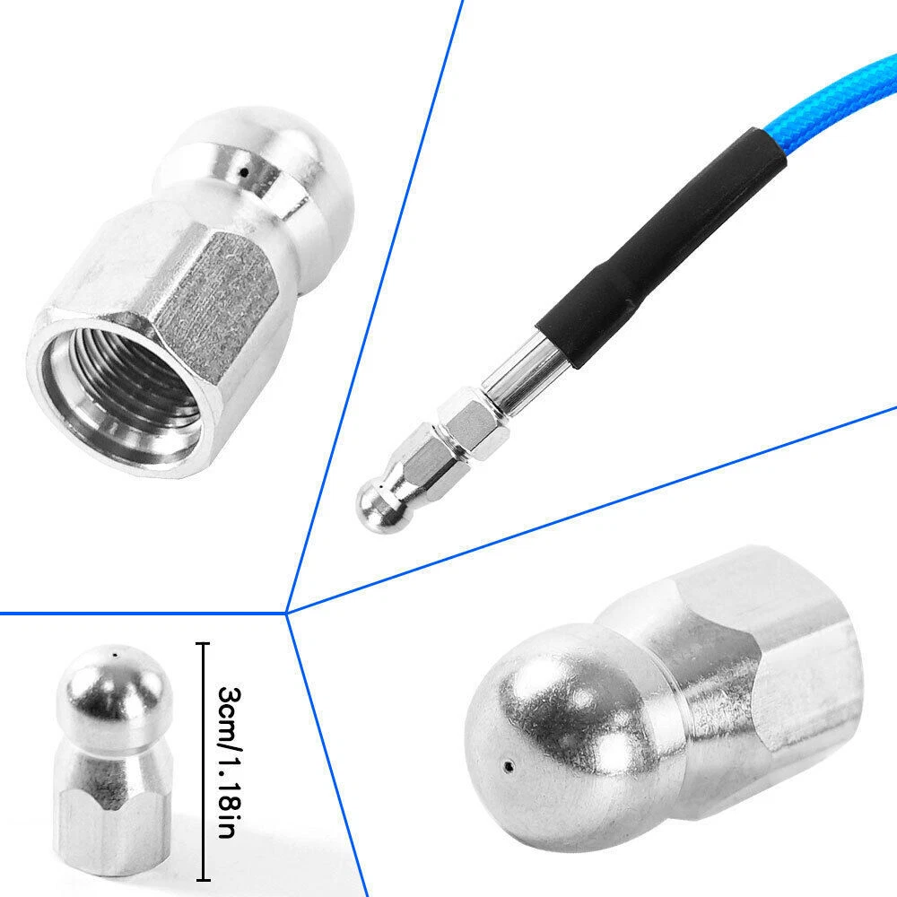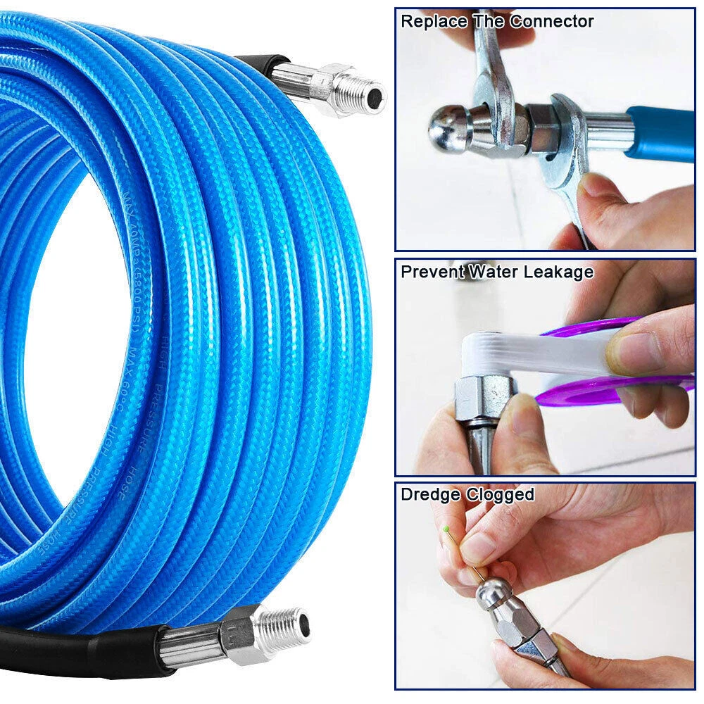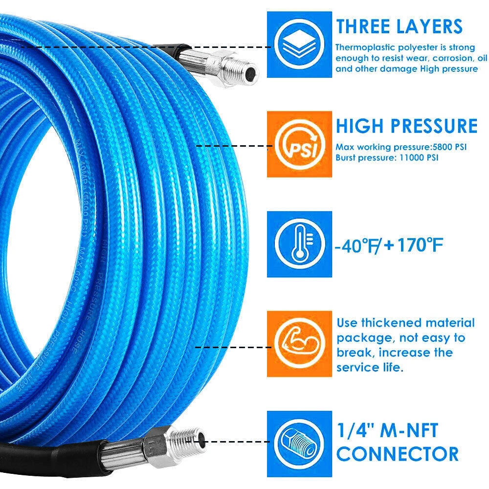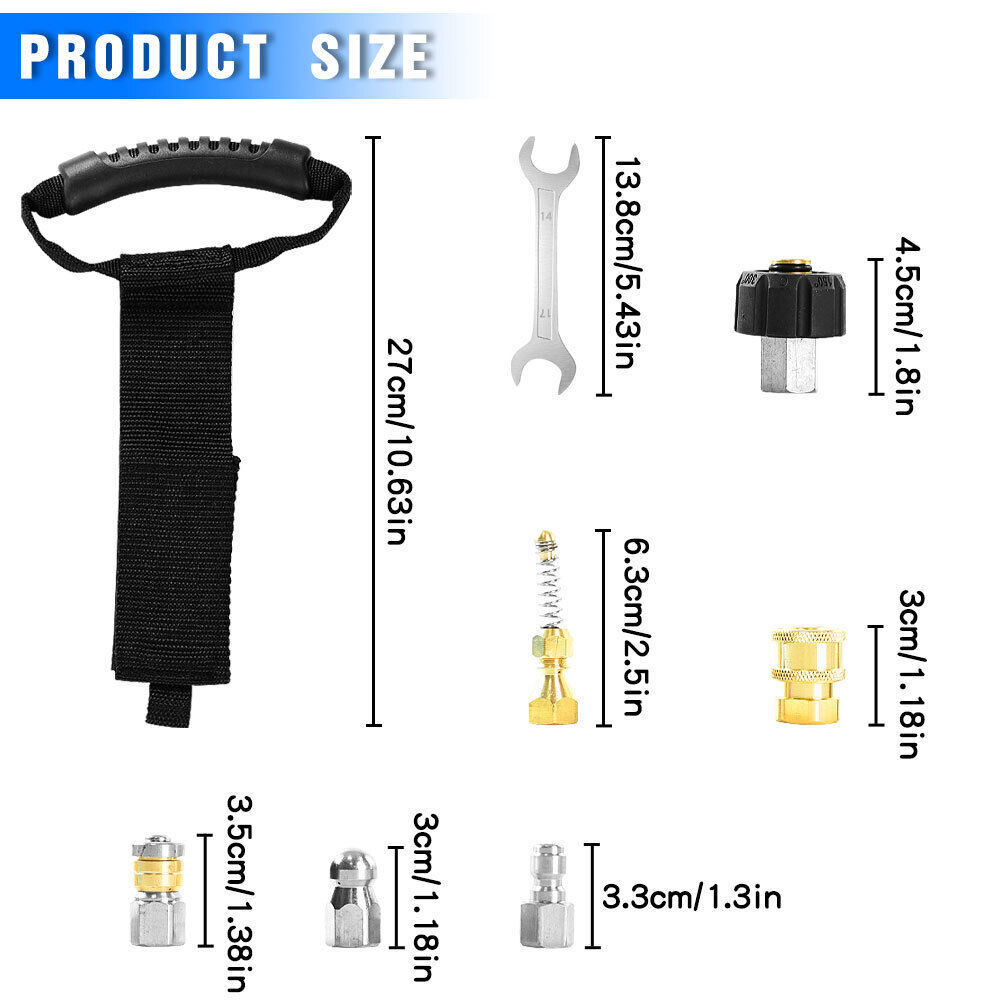 Features 【High Quality Hose】 【Utility Tools】 【Sewer Jetting Nozzles】 【Drain Jetter Nozzle】 【Quick Connect Plug】 Package include 1 X Sewer Jetter Kit, 1x Handle Strap For Storage, 1 X 1/4 Quick Connect Plug, 1 × M22 Female To 1/4'' Female Npt Coupler 1 X M22 Coupler 1 X Button Nose Nozzle 1x Rotating Sewer Jetter Nozzle, 1x Corner Sewer Jetter Nozzle 1 X Thread Seal Tape 1 X Box Of Pearl Corsage Pin, 2 X Spanners Sewer Jetter Kit for Pressure Washer Drain Cleaner Hose 100FT 1/4" M-NPT 5800PSI Features 【High Quality Hose】 High pressure washer hose with working pressure up to 5800PSI, inner hose made of thermoplastic polyester tubing reinforced with chemically bonded 1/4" high tenacity polyester braid, outer hose made of thermoplastic polyester tubing, all materials are of high quality to withstand the effects of sunlight, oils, ozone, and abrasion to prolong the product's lifespan. 【Utility Tools】: The pressure washer drain jetter can be used indoors and outdoors to clean cars, motorcycles, driveways, roofs, bathrooms, swimming pools, siding, windows, floors, gutters and more. We added 2 wrenches for installing nozzles or accessories, 1 box of pearl brooches to help clear clogged nozzles, waterproof tape to prevent nozzles from leaking, and equipped with a handle storage strap for easy carrying and storage. Thoughtful accessories make your use stress-free to use. 【Sewer Jetting Nozzles】: Button Nose Sewer Jet Nozzle clears clogs and flushes away debris by spraying 0° in the front and driving 3 33° jets in the back; Corner Sewer Jet Nozzle clears clogs in corners by spraying sideways, and the 3 rear nozzles are angled at a 33° angle to flush out debris and clogs from the front nozzles. 【Drain Jetter Nozzle】The rotating sewer jet nozzle provides even cleaning with 3 backward rotating jets that spray into clogged pipes; the pointed nozzle has 1 front and 6 rear jets, the front jets are good for cutting through debris and removing stubborn materials, and the rear jets drive the nozzle forward to flush out debris and clogs for a more effective cleaning. 【Quick Connect Plug】: Quick Connect Plug for Sewer Jetter Hose (Female M22 to Female 1/4'' NPT) is used in many high pressure connections that are often assembled or disassembled, and is ideal for quick replacement of sewer jetter hoses, medium/high pressure washer pumps, lances and nozzles, each time it makes a solid connection to the quick connect, allowing easy flushing of obstructions and Increase your cleaning efficiency. Package include 1 X Sewer Jetter Kit, 1x Handle Strap For Storage, 1 X 1/4 Quick Connect Plug, 1 × M22 Female To 1/4'' Female Npt Coupler 1 X M22 Coupler 1 X Button Nose Nozzle 1x Rotating Sewer Jetter Nozzle, 1x Corner Sewer Jetter Nozzle 1 X Thread Seal Tape 1 X Box Of Pearl Corsage Pin, 2 X Spanners Payment Shipping Return Contact us About us Payment 1.Paypal, Credit Card, G Pay etc, many payment way is accepted. 2.Please be sure your shipping address is correct before make a payment. Shipping 1.We are shipping from multiple warehouses (Houston, Texas/ Corona, California) , please note before placing an order 2.We will ship out the item within 1-3 business days after comfirming the payment, appreciate your patience. 3.If the items are broken on the way( we will check the orders clearly before we sent them ),please contact us in 3 days you received it. We will send you a new one or refund your payment. Return 1.We stand behind every buyer.Items can be returned for exchange or refund within 30 days. 2.Please contact us when you have any confusion of our item, we will solve the trouble for you as soon as possible. Contact us 1.This is professional Seller.We will reply your message within 24 hours. 2.Please contact us whenever you have any question about the item. We will deal with it as soon as possible. 3. If you are unhappy with the item or our service,please Contact Us before leave feedback,just give me a chance,thank you! About us 1. Unless specified otherwise, all our products are IN STOCK and are shipped from Local warehouse - Not Overseas! 2. We provide a 30 day Satisfaction Guarantee or your money back (provided items are in the same new and resaleable condition.) 3. We have a PayPal Verified Business Account, please buy with Confidence! 4. Every item will be tesrted before send.We know our products well and if we don't have the answers we will do our best to find them for you! 5. Our friendly team look forward to serving you! Your satisfaction is our No.1 Priority We will do our best to satisfacy you.