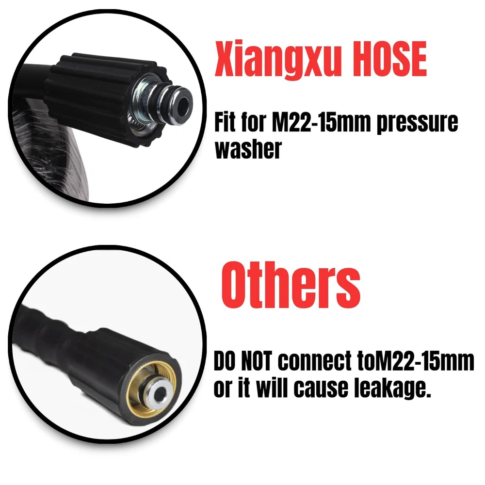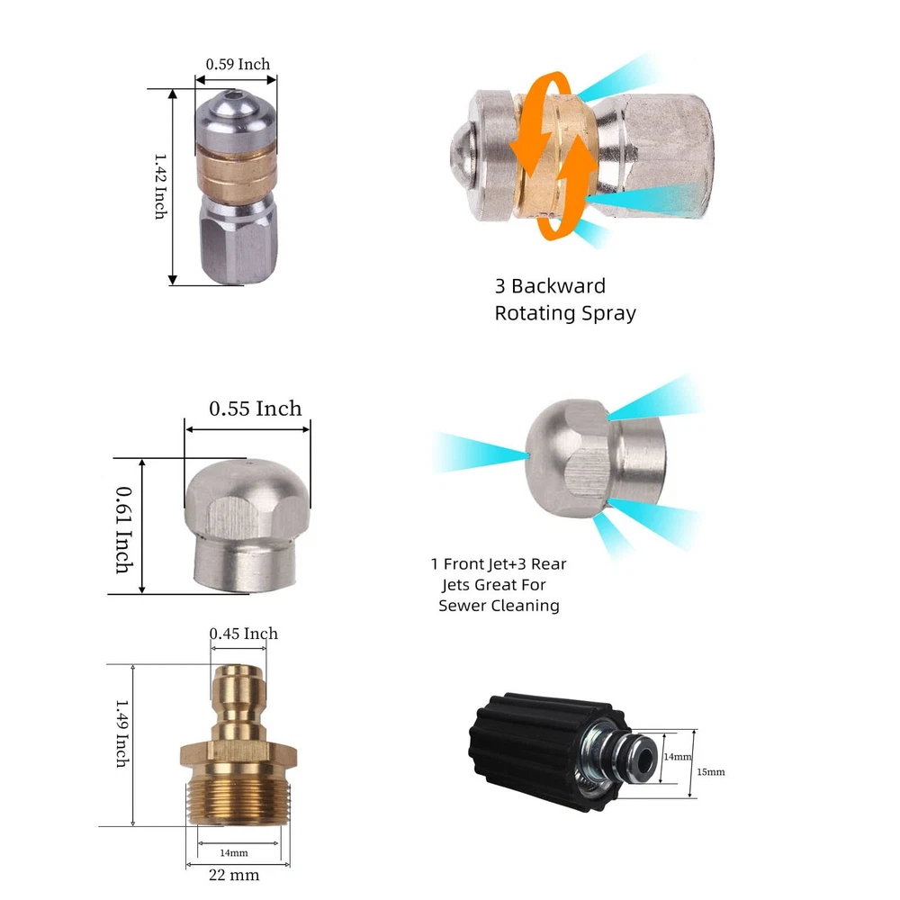 [Material] professional high pressure cleaning machine drainage pipe cleaner is composed of inner pipe, outer pipe.The inner tube is made of a thermoplastic polyester.The overlay is made of a thermoplastic polyurethane.Strong toughness, can be stretched without breaking.Aging resistance, durable can resist all kinds of oil, stains bad environment corrosion. [With two types of spray nozzles a M22 to 1/8” Quick Connect ]The cleaning sewer kit has a total of 2 nozzles alternating with the first button injector nozzle: 1 front injector with an injection angle of 0 to remove the blockage.Three rear injectors (injection angle of 33) can wash off the front 0 injector washed debris A second backward rotating injector, spray sideways to remove blockage and loose debris from the pipe wall. [Suitable for various brands of interface wire M22 pressure washer]The Sewer injector hose can be connected to the HP washer pump M22 outer thread via the M22-14 / 15mm twin-bar thread. [Suitable for cleaning a variety of places]High pressure washer hose can be used for clean dredge, roof, siding, sink, toilet, toilet, windows, gutter, motorcycle, car, driveway, etc. [100% Customer Technical Service] If we have any questions for help, we are online 24 hours a day and always contact us.