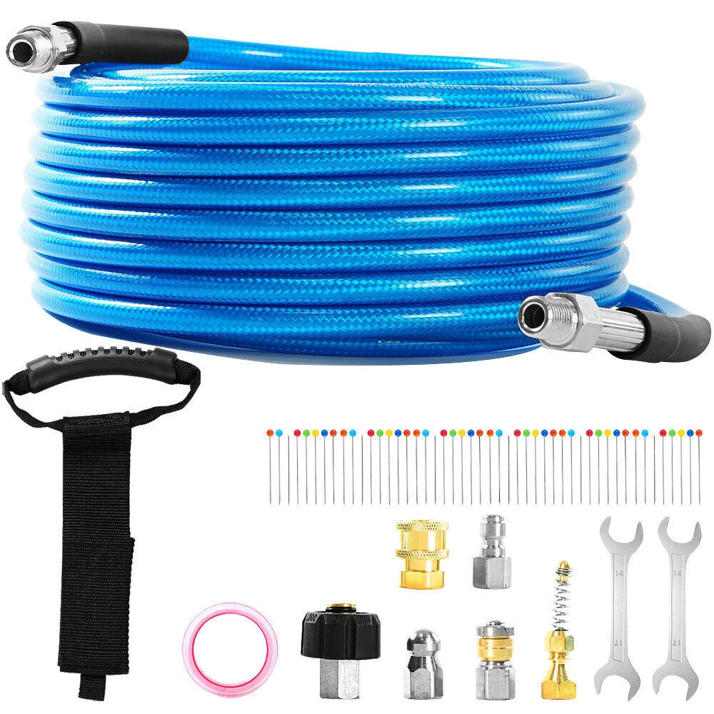 Features 【High Quality Hose】 【Utility Tools】 【Sewer Jetting Nozzles】 【Drain Jetter Nozzle】 【Quick Connect Plug】 Package include 1 X Sewer Jetter Kit, 1x Handle Strap For Storage, 1 X 1/4 Quick Connect Plug, 1 × M22 Female To 1/4'' Female Npt Coupler 1 X M22 Coupler 1 X Button Nose Nozzle 1x Rotating Sewer Jetter Nozzle, 1x Corner Sewer Jetter Nozzle 1 X Thread Seal Tape 1 X Box Of Pearl Corsage Pin, 2 X Spanners 50FT 5800 PSI Sewer Jetter Nozzles Kit Pressure Washer Drain Cleaning Hose Set Features 【High Quality Hose】 High pressure washer hose with working pressure up to 5800PSI, inner hose made of thermoplastic polyester tubing reinforced with chemically bonded 1/4" high tenacity polyester braid, outer hose made of thermoplastic polyester tubing, all materials are of high quality to withstand the effects of sunlight, oils, ozone, and abrasion to prolong the product's lifespan. 【Utility Tools】: The pressure washer drain jetter can be used indoors and outdoors to clean cars, motorcycles, driveways, roofs, bathrooms, swimming pools, siding, windows, floors, gutters and more. We added 2 wrenches for installing nozzles or accessories, 1 box of pearl brooches to help clear clogged nozzles, waterproof tape to prevent nozzles from leaking, and equipped with a handle storage strap for easy carrying and storage. Thoughtful accessories make your use stress-free to use. 【Sewer Jetting Nozzles】: Button Nose Sewer Jet Nozzle clears clogs and flushes away debris by spraying 0° in the front and driving 3 33° jets in the back; Corner Sewer Jet Nozzle clears clogs in corners by spraying sideways, and the 3 rear nozzles are angled at a 33° angle to flush out debris and clogs from the front nozzles. 【Drain Jetter Nozzle】The rotating sewer jet nozzle provides even cleaning with 3 backward rotating jets that spray into clogged pipes; the pointed nozzle has 1 front and 6 rear jets, the front jets are good for cutting through debris and removing stubborn materials, and the rear jets drive the nozzle forward to flush out debris and clogs for a more effective cleaning. 【Quick Connect Plug】: Quick Connect Plug for Sewer Jetter Hose (Female M22 to Female 1/4'' NPT) is used in many high pressure connections that are often assembled or disassembled, and is ideal for quick replacement of sewer jetter hoses, medium/high pressure washer pumps, lances and nozzles, each time it makes a solid connection to the quick connect, allowing easy flushing of obstructions and Increase your cleaning efficiency. Package include 1 X Sewer Jetter Kit, 1x Handle Strap For Storage, 1 X 1/4 Quick Connect Plug, 1 × M22 Female To 1/4'' Female Npt Coupler 1 X M22 Coupler 1 X Button Nose Nozzle 1x Rotating Sewer Jetter Nozzle, 1x Corner Sewer Jetter Nozzle 1 X Thread Seal Tape 1 X Box Of Pearl Corsage Pin, 2 X Spanners Payment Shipping Return Contact us About us Payment 1.Paypal, Credit Card, G Pay etc, many payment way is accepted. 2.Please be sure your shipping address is correct before make a payment. Shipping 1.We are shipping from multiple warehouses (Houston, Texas/ Corona, California) , please note before placing an order 2.We will ship out the item within 1-3 business days after comfirming the payment, appreciate your patience. 3.If the items are broken on the way( we will check the orders clearly before we sent them ),please contact us in 3 days you received it. We will send you a new one or refund your payment. Return 1.We stand behind every buyer.Items can be returned for exchange or refund within 30 days. 2.Please contact us when you have any confusion of our item, we will solve the trouble for you as soon as possible. Contact us 1.This is professional Seller.We will reply your message within 24 hours. 2.Please contact us whenever you have any question about the item. We will deal with it as soon as possible. 3. If you are unhappy with the item or our service,please Contact Us before leave feedback,just give me a chance,thank you! About us 1. Unless specified otherwise, all our products are IN STOCK and are shipped from Local warehouse - Not Overseas! 2. We provide a 30 day Satisfaction Guarantee or your money back (provided items are in the same new and resaleable condition.) 3. We have a PayPal Verified Business Account, please buy with Confidence! 4. Every item will be tesrted before send.We know our products well and if we don't have the answers we will do our best to find them for you! 5. Our friendly team look forward to serving you! Your satisfaction is our No.1 Priority We will do our best to satisfacy you.