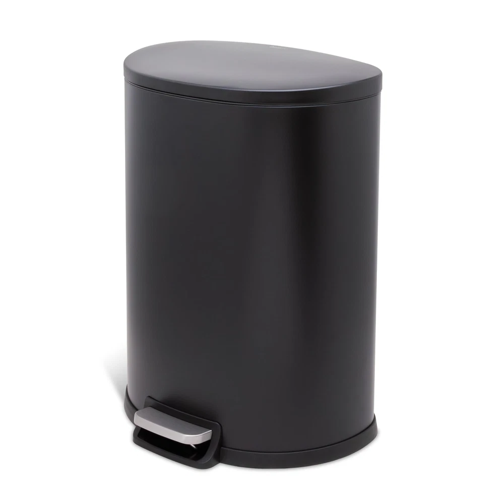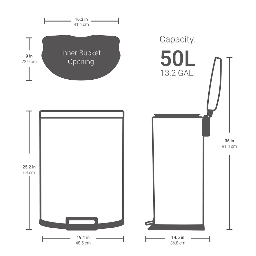 Well Designed and Engineered 50L Stainless Steel Step-On Trashcan Suitable for any area of your home, this well-designed and engineered 50L Matte Black Stainless Steel Step-On Trashcan is versatile and fits seamlessly in various spaces. The D Shape design allows it to blend in perfectly in areas such as kitchens, offices, living rooms, restaurant bathrooms, bedrooms, dorm rooms, or any open space . The removable bucket liner feature allows you to keep the bag hidden from public view, maintaining a neat and clean appearance. 50L capacity with easy step-on mechanism Stainless steel construction with soft close lid closer Removable bucket liner keeps the bag hidden from sight Keeps trash orderly for a tidy space Versatile slim design suitable for many areas Make trash disposal easy and stylish with this Stainless Steel Step-On Trashcan. The removable bucket liner ensures that the bag remains hidden, contributing to a neat and organized space. The easy step-on mechanism and soft close lid closer add convenience to your waste management. OUR QUALITY: High-Quality 430 Stainless Steel and ABS Construted. Our Trashcan is Build to Last! Fingerprint and Smudge Resistant Coating Make Cleaning a Breeze. OUR CRAFTSMANSHIP: Large, Wide Opening Area. Provides Easy Access for Daily Chore Work. OUR DESIGN: Modern, Stylish, Elegant, Completes and Show Case Your Home With This Missing Piece. OUR VISION: Multi-Purpose, Suitable for Kitchen, Bath, School, Hotel, Airport, Construction Site, Office Space, Indoor/Outdoor, Boat, RV, and More.. OUR PROMISE: 100% Satisfaction Backed by Dedicated Customer Support Team, Worry Free Defective Replacement at No Additional Charges to You.