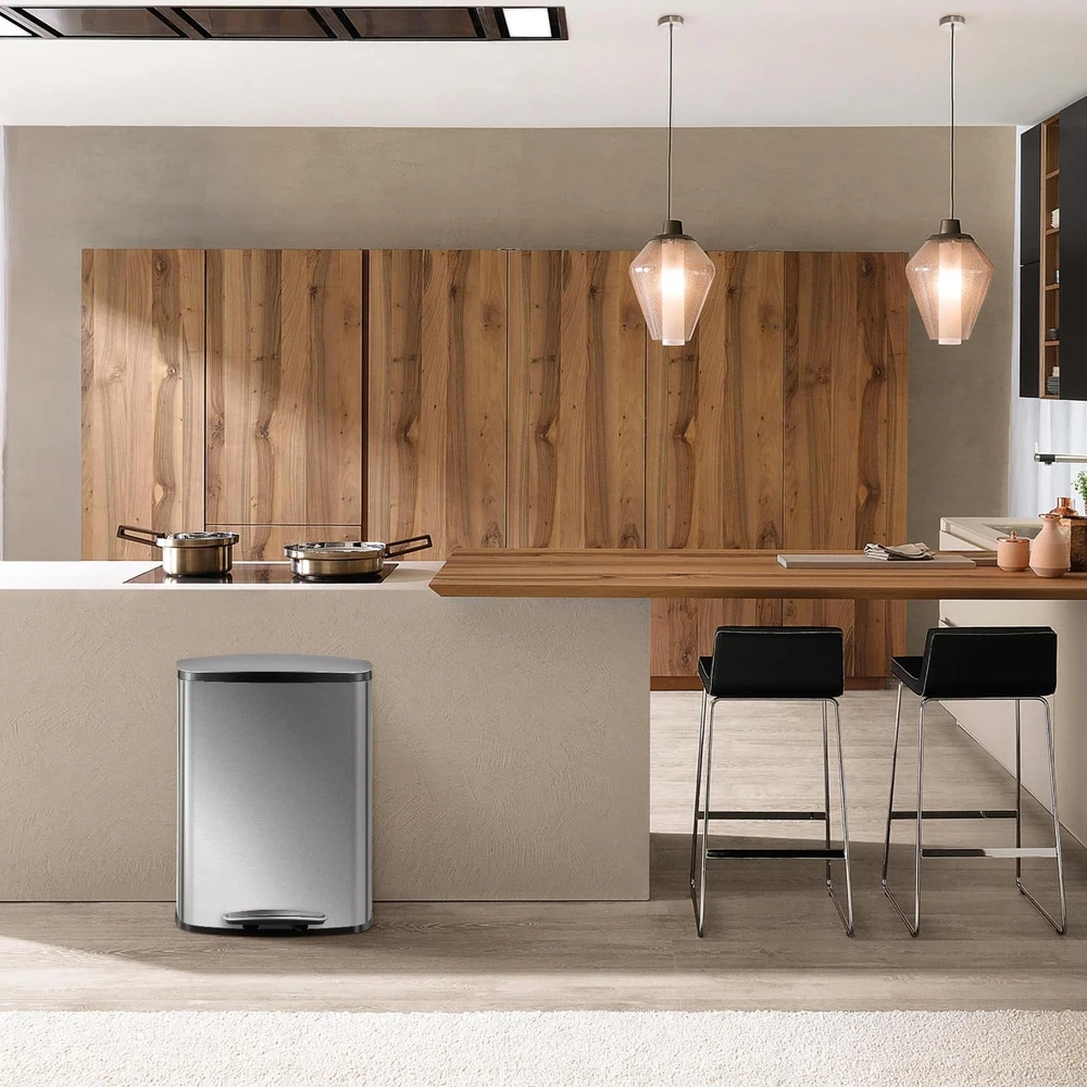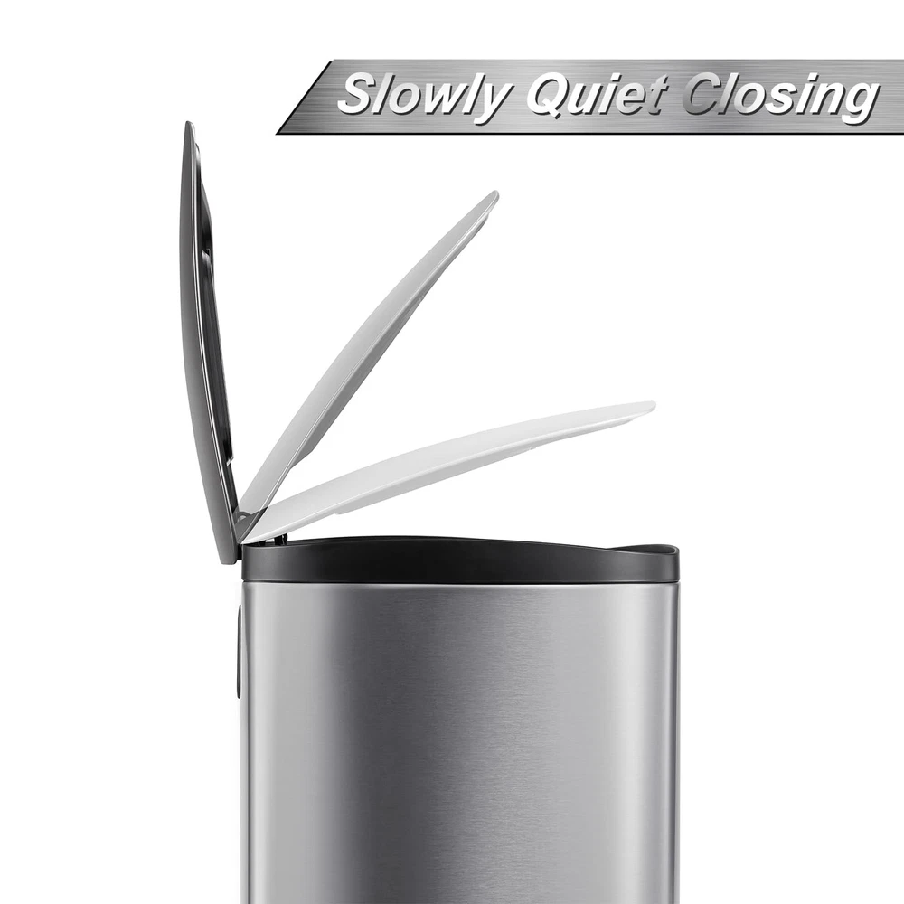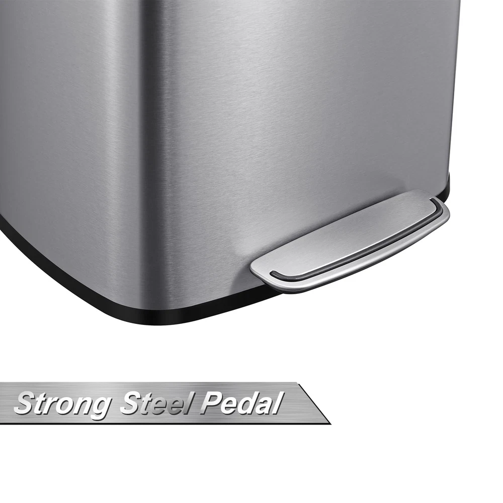 50L/13Gal Heavy Duty Hands-Free Stainless Steel Kitchen Trash Can, Commercial Rectangular Kitchen Waste Bin, with Soft Close Lid & Inner Liner, Fingerprint-Resistant Premium Stainless Steel: Our trash can is crafted from high-quality stainless steel, offering exceptional rust resistance and a fingerprint-proof surface for a sleek appearance. Its easy-to-clean design adds a touch of sophistication and style to your kitchen decor while ensuring long-lasting durability. With this premium material, you can enjoy a functional and attractive solution for waste disposal that complements your home's aesthetic. Hands-Free Foot Pedal Opening: This trash can features a user-friendly foot pedal design that allows for easy access without manual contact, providing hands-free operation for enhanced hygiene. This convenient feature is especially ideal for busy kitchens, where quick and efficient waste disposal is essential. Enjoy the convenience of disposing of trash effortlessly while maintaining a cleaner, more sanitary environment. Detachable Inner Bucket: This trash can features a removable inner bucket that simplifies the cleaning process and makes bag replacement effortless. Designed to help maintain cleanliness, it prevents leaks and keeps the interior spotless. Enjoy a convenient and hassle-free waste management solution that takes the hassle out of disposal, ensuring your space remains tidy and organized with minimal effort. Stylish & Spacious: This stainless steel trash can boasts a contemporary and elegant design that enhances any setting while being easy to clean. With a generous 13-gallon capacity, it offers plenty of space for waste disposal and is compatible with standard 13-gallon trash bags available at supermarkets, making it functional and convenient for everyday use. Wide Application: Our automatic trash can is designed to seamlessly integrate into nearly any environment. Whether it's positioned in the kitchen, bedroom, bathroom, office, or study, this trash can provides an effective and aesthetically pleasing solution for waste disposal. Its modern design and versatile functionality make it an ideal addition to your home or workspace, enhancing both practicality and style.
