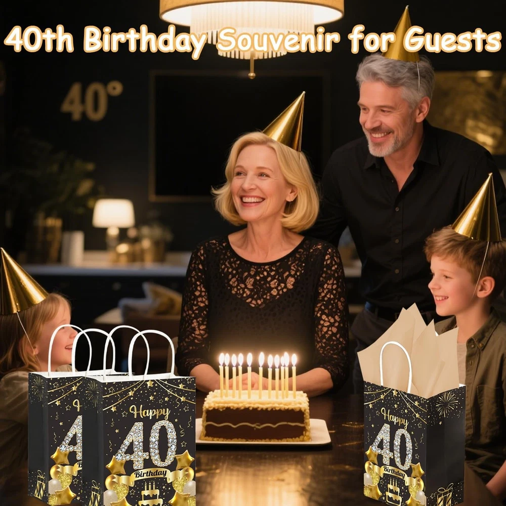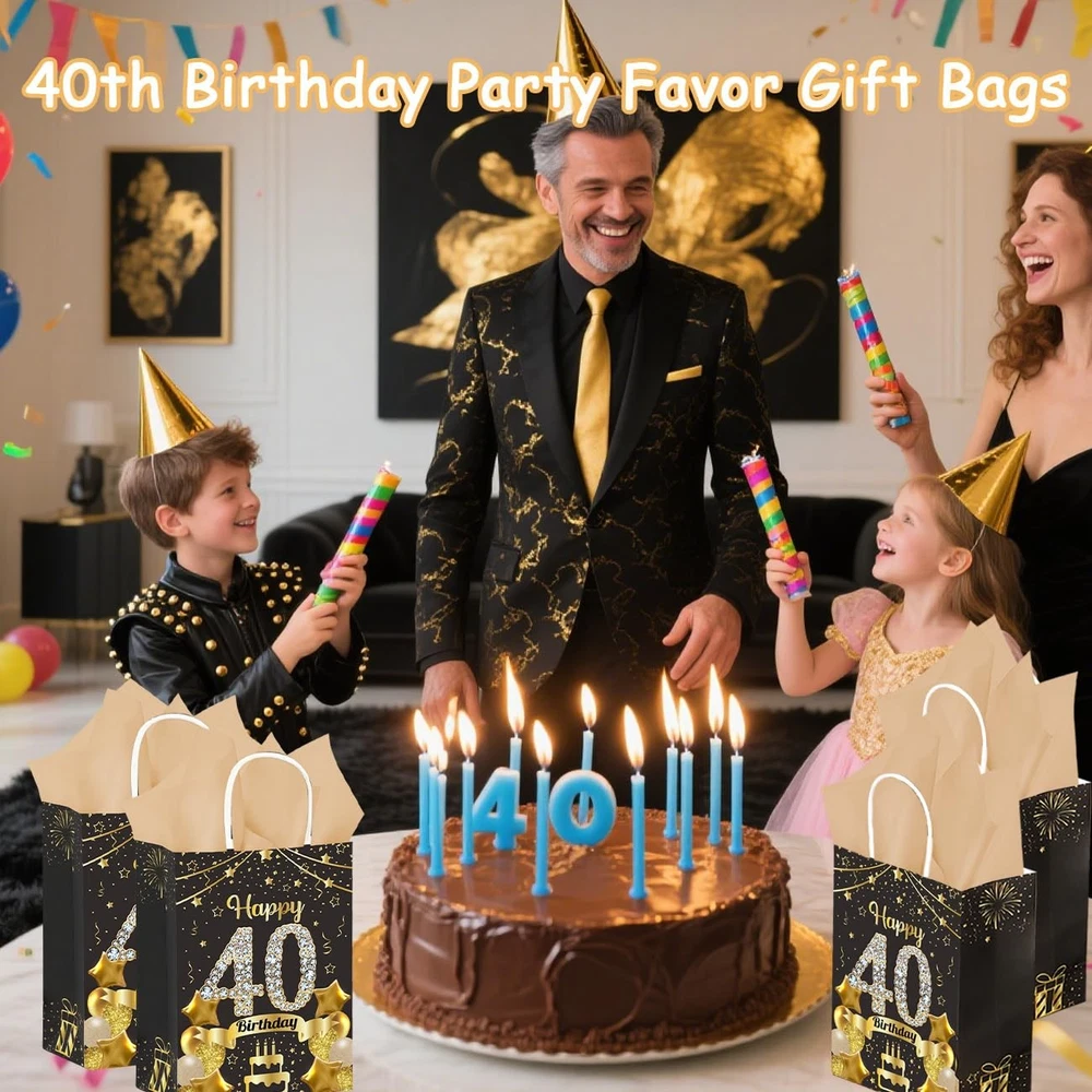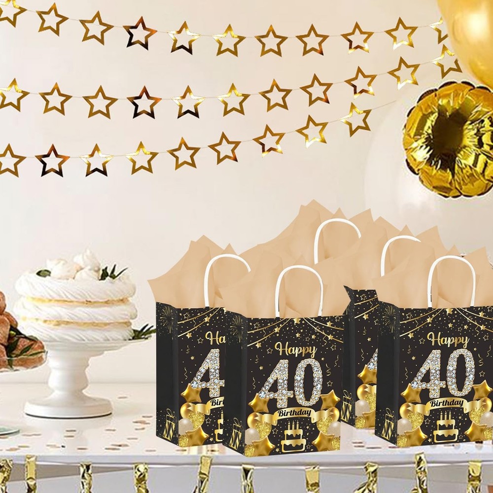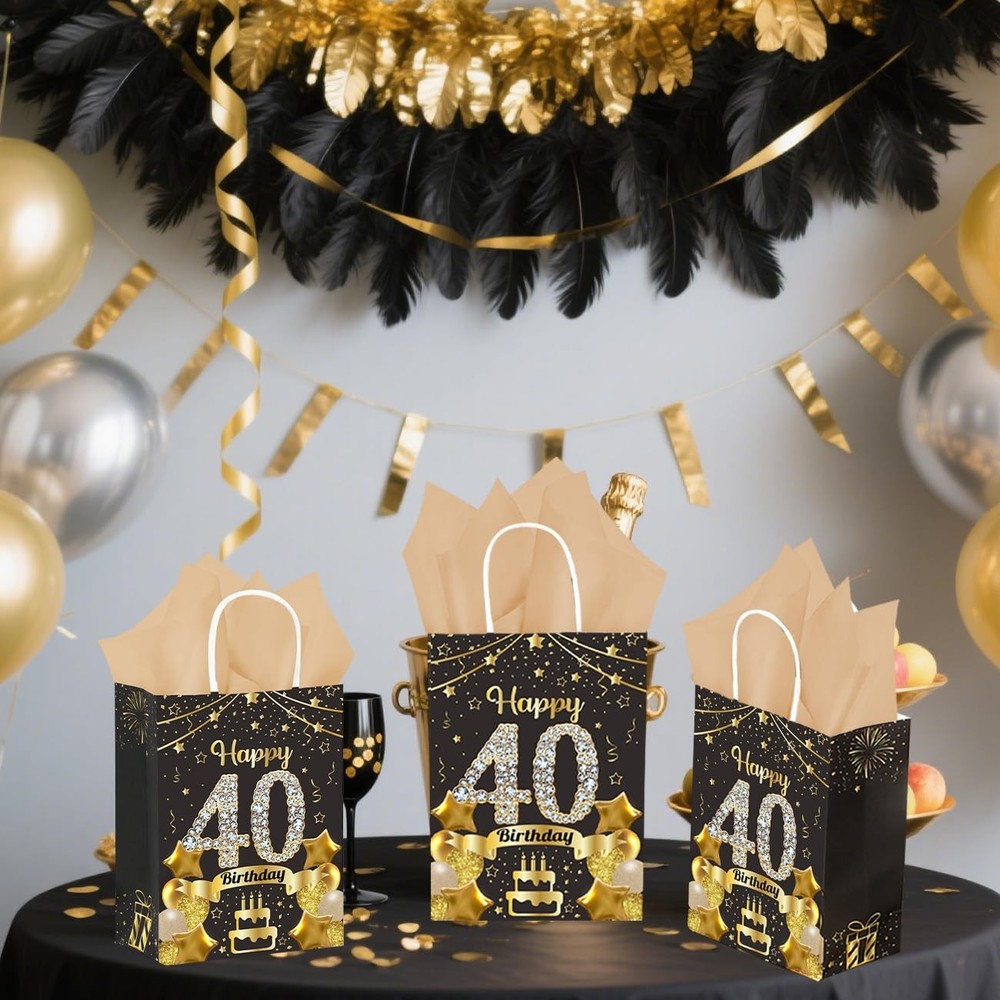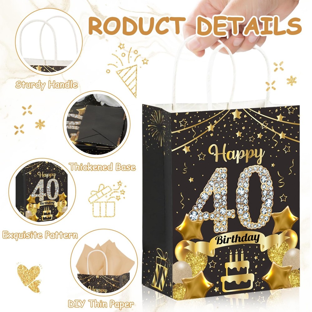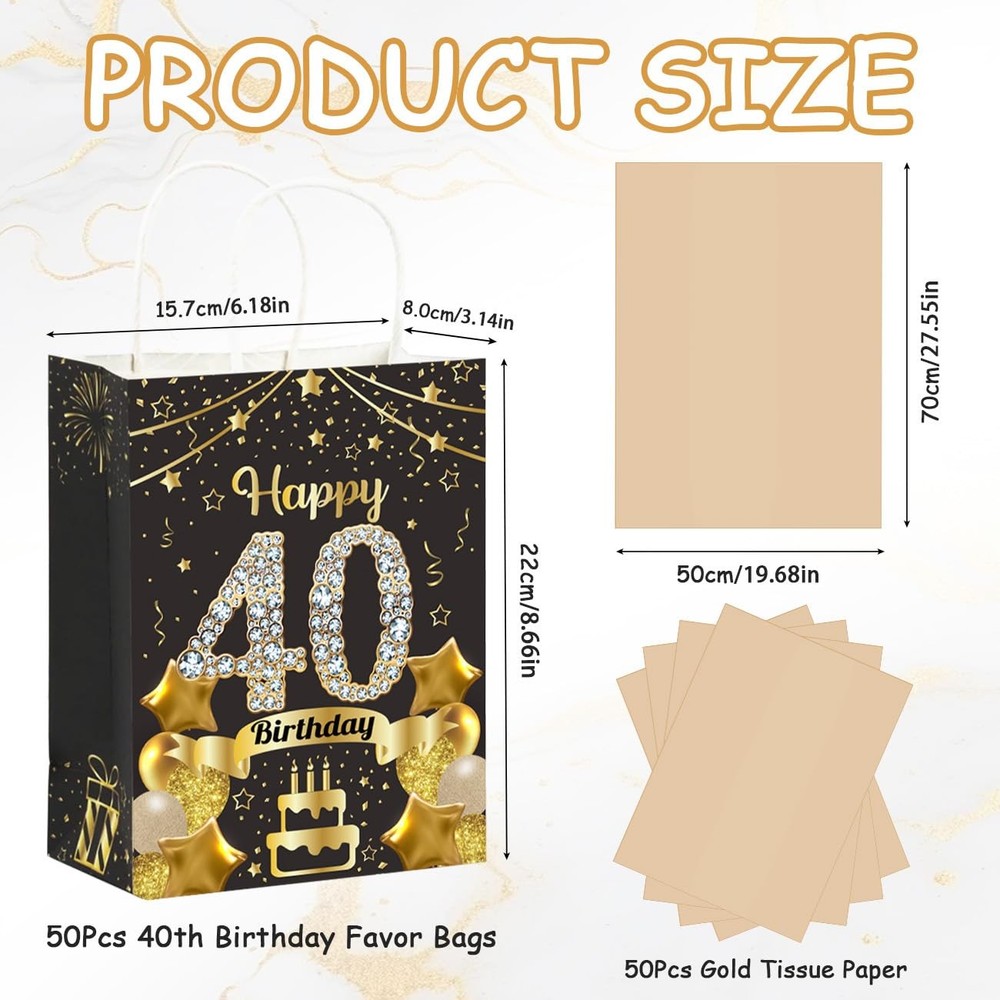 Specifications: Package includes: 50Pcs 40th Birthday Gift Bags 50Pcs Gold Tissue Paper Material: High Quality Paper Gift Bag Size: 8.54 x 3.14 x 2.28inch/21.7 x 8 x 5.8cm Tissue Paper Size: 27 x 19.5inch/69.7 x 49.5cm Color: Black Gold Product Characteristics: These black and gold 40th birthday paper gift bags are made of high-quality cardboard, which is sturdy, durable, not easily damaged and reusable. The happy 40th birthday gift bag features a double-sided printed design, paired with thin paper for a more exquisite packaging, adding more charm to your party. 40th birthday gift bags all have handle designs, reinforced handles provide comfortable grip and are easy to carry. The thickened bottom design increases the bag's load-bearing capacity. The accompanying thin paper not only provides extra protection for your gift, but also unleashes your creativity by using them for DIY gift baskets, paper flowers, and elegant flower arrangements. Thank you for providing the right size birthday gift bag, suitable for storing various small gifts, it can not only be used to celebrate various events, but also can be used as the centerpiece of the party table, providing a pleasant visual experience for your guests. Notes: Manual measurement, please allow slight errors on size. The color may exist a slight difference due to different screen displays. Birthday Favor Gift Bag: Our black and gold birthday party set includes 50Pcs Happy 40th Birthday gift bags and 50 pieces of gold tissue paper. With sufficient quantity and exquisite craftsmanship, it can meet your various styles of birthday party needs and leave a deep impression on your family and guests Reliable Quality: These black gold 40th birthday gift bags are made of high-quality thick cardboard, sturdy, durable, not easily damaged, reusable, with a thick bottom design that increases the bag's load-bearing capacity. The reinforced handle provides comfortable grip and is easy to carry. The accompanying tissue paper provides additional protection for your gift Fashionable Black Gold Design: The 40th birthday gift bag adopts double-sided printing and ironing technology, paired with classic black gold color scheme, decorated with elements such as balloon cake, exquisite and elegant. Your guests will be attracted by your carefully prepared welcome gift, adding more charm to your party and bringing unforgettable party experience to your guests Suitable Size: The size of the 40th birthday party gift bag we provide you is 8.54×3.14×2.28inch/21.7×8×5.8cm, which can safely accommodate your gifts, such as candies, snacks, souvenirs, small gifts, etc. The gold tissue paper measures 27x19.5 inches/69.7x49.5cm and makes a great gift wrapping companion, perfect for wrapping gifts at parties Widely Used: Whether for indoor or outdoor 40th birthday parties, our black gold 40th birthday gift bag will bring joy to your friends, loved ones, mothers, fathers, colleagues, and neighbors. This 40th birthday gift bag can not only be used to hold birthday gifts, but also to decorate 40th birthday parties, easily attracting the attention of everyone at the party. When guests are about to leave the party, you can fill the bag with gifts and let them feel your full love