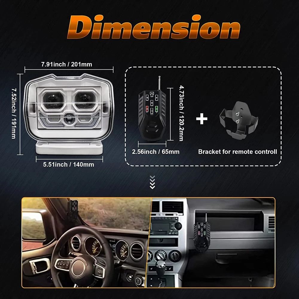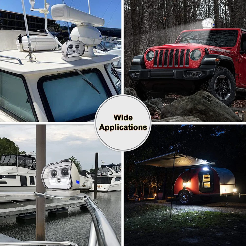 Product description: Type: led search light Color: White Input Voltage: 12/24V Power: 60W Size: 7 Inch Material: Diecast Aluminum Alloy and Plastic Lamp Body Material: Aluminum alloy and Plastic Working Temperature: -45 ℃ to 80℃ Working Lifetime: 50000Hour Lamp Luminous Flux: 5400LM Color Temperature: 6000K Beam Angle: 120° IP Rating: IP67 Feature: magnetic mount searchlight Function: portable searchlight marine Control mode: remote control *The up and down flip angle of the LED searchlight is about: 45 degrees *The left and right rotation angle of the vehicle searchlight is about: 360 degrees Feature -Unbreakable lens -360 degree rotation remotable -Premium heat dissipation design -High intensity ultra bright LEDs -Different light pattern from spot beam. -Aluminum casing, shock-proof waterproof better. -IP67 High-grade anti-corruption diecast aluminium,housing -100% waterproof, dustproof & quakeproof for extreme environment -Long life: more than ordinary advanced LED light bulbs -50 meters remote control -200-500 meters lighting distance Package: 1x 60W 360 Degree LED Searchlight+ 1x Remote Controller (battery is not included ) Notes: 1. This searchlight has 2 standard magnets. If you want more magnets, you can search for product ID: 32968555662 on AliExpress to buy. Or search ID: 1005001609527925 to buy with complete magnet specifications 2. The remote control usually does not include batteries. Delivery of batteries from Russian warehouses. 3. You can also buy it at a local store. 4. If you find that the remote control can't control the lights after the battery is installed, don't worry, it's normal. At this time, you only need to reset the connection. If you don't know how to reset, you can contact me and I will send you the details method.