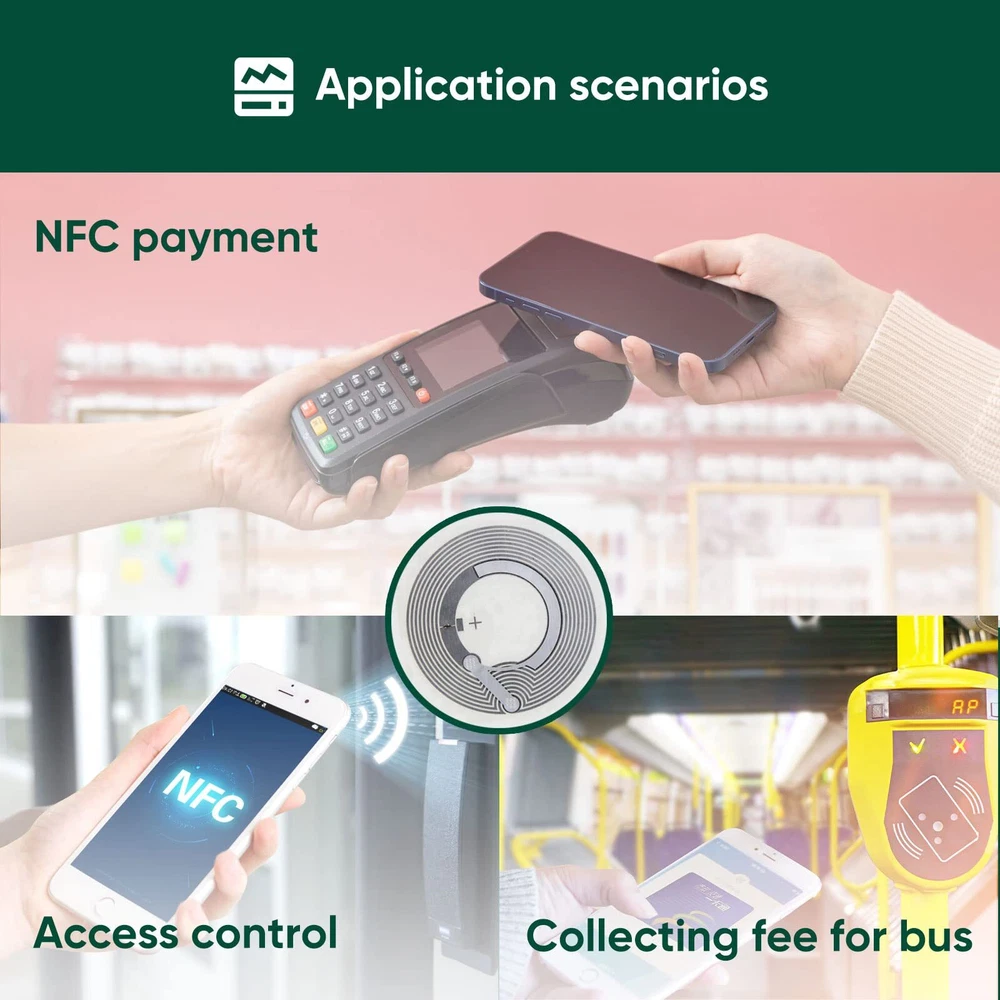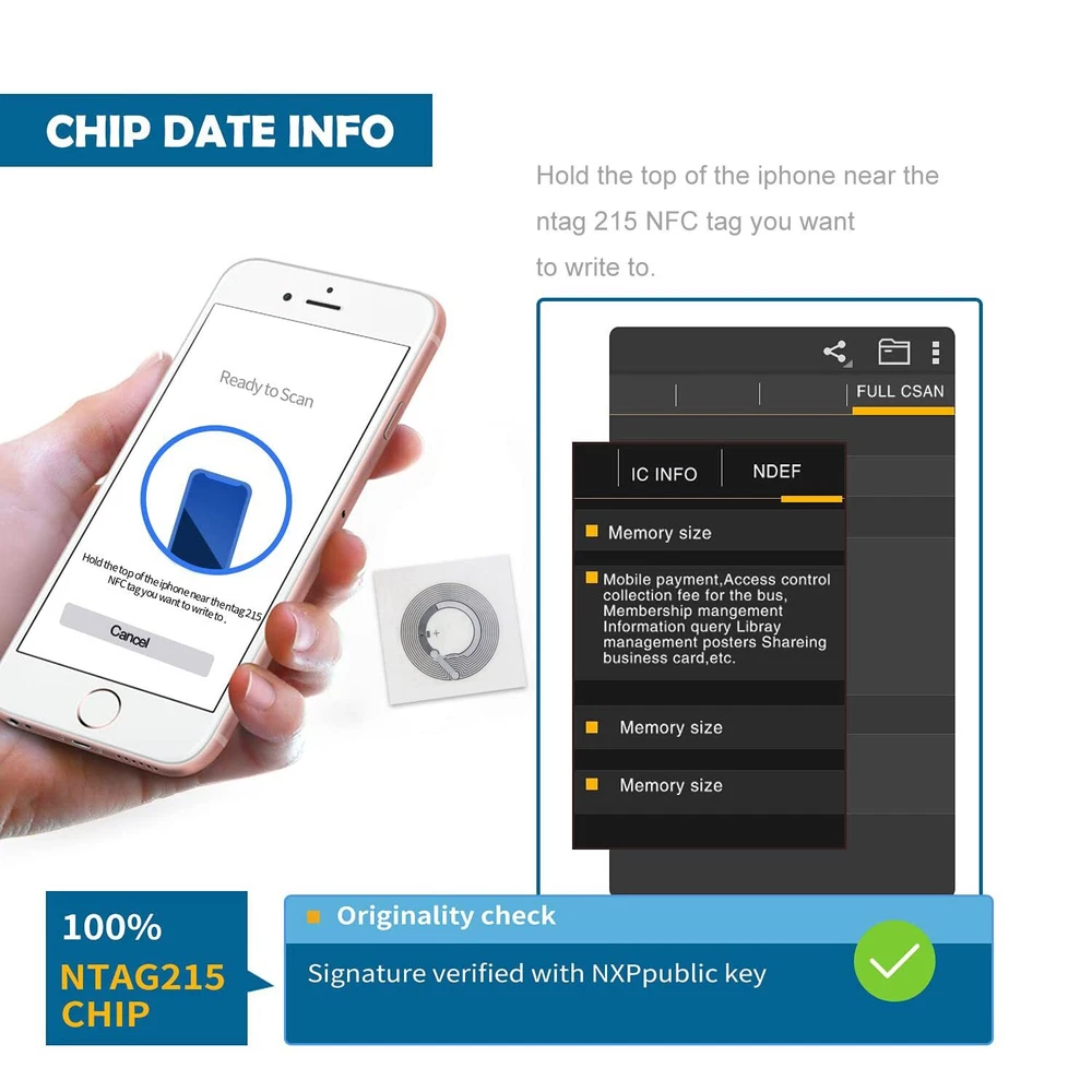 NTAG215 tag is an adhesive nfc sticker working on 13.56MHz. With 504 bytes programmable memory, this tag supports Read/ Write/ Encrypt/ Lock functions. It is only 25mm diameter and users can stick it on the surfaces of objects. Features Contactless transmission of data and supply memory Operating frequency of 13.56MHz Data transfer of 106 kbit/s Operating distance up to 100mm(depending on various parameters as e.g. filed strength and antenna geometry) Fast command True anticollision Note: The tag is not anti-metal, so make sure that it is not attached on metal surface. The applications of the tag includes Nintendo game tags, Lego dimentions, smart home trigger, digital business card, product authentification, smart advertisement and so on. 【Chip Type】Original NTAG215 chip, support Read/ Write/ Rewrite/ Encrypt commands 【Specifications】Frequency: 13.56Mhz; Memory: 540 bytes EEPROM(504 bytes user memory); Size: 25mm/1 inch (diameter); Reading Distance: 0-5 cm 【Compatiblity】Compatible with NFC-enabled cellphones and devices. For iPhones, please check if your model supports NTAG before your purchase. This nfc sticker is not anti-metal, so please do not attach it on metal surface. 【Perfect for Games】The NTAG215 tags work well to make your favorite figures in games like Animal Crossing, the Legend of Zelda, New Horizon, Mario Kart. Note: They are are editable once for games. 【Applications】Game tags, smart home, Lego Dimensions, Digital business card, Product autentification, Smart advertisement etc.