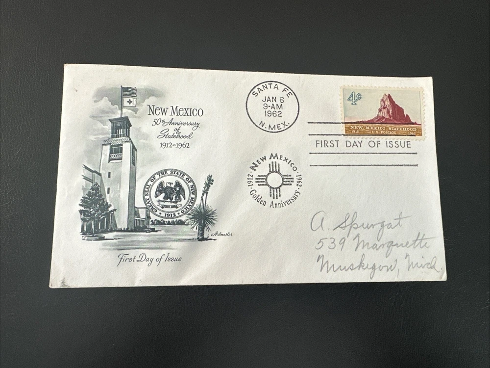 Beautifully Crafted -- Good Condition -- Comes in Envelope Sleeve New Mexico - 50th Anniversary of Statehood - 1912-1962 First Day of Issue -- January 6, 1962 Artmaster Cachet *** Some Cachets may have slight discoloration or marks due to aging over time. Please message me with any questions! ***
