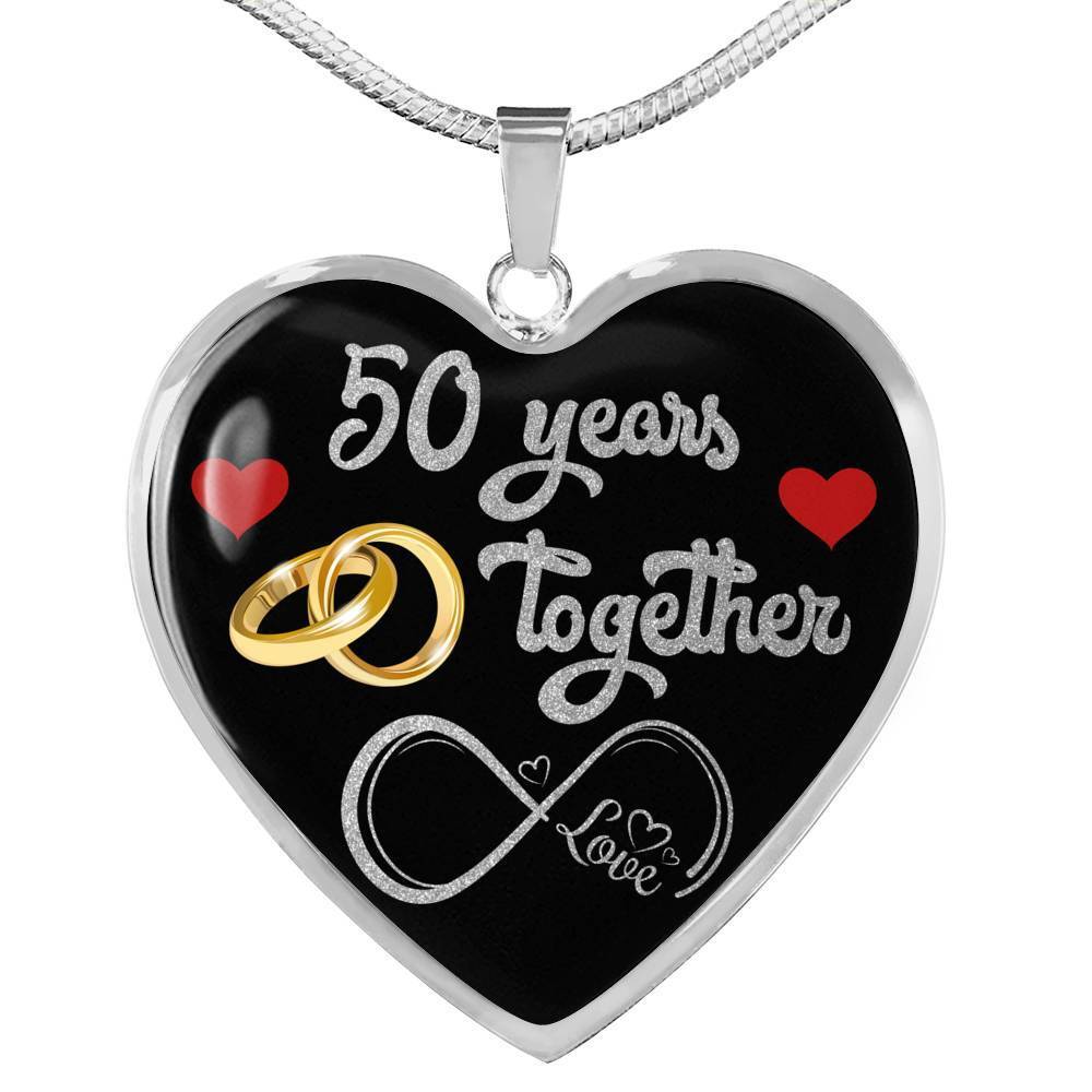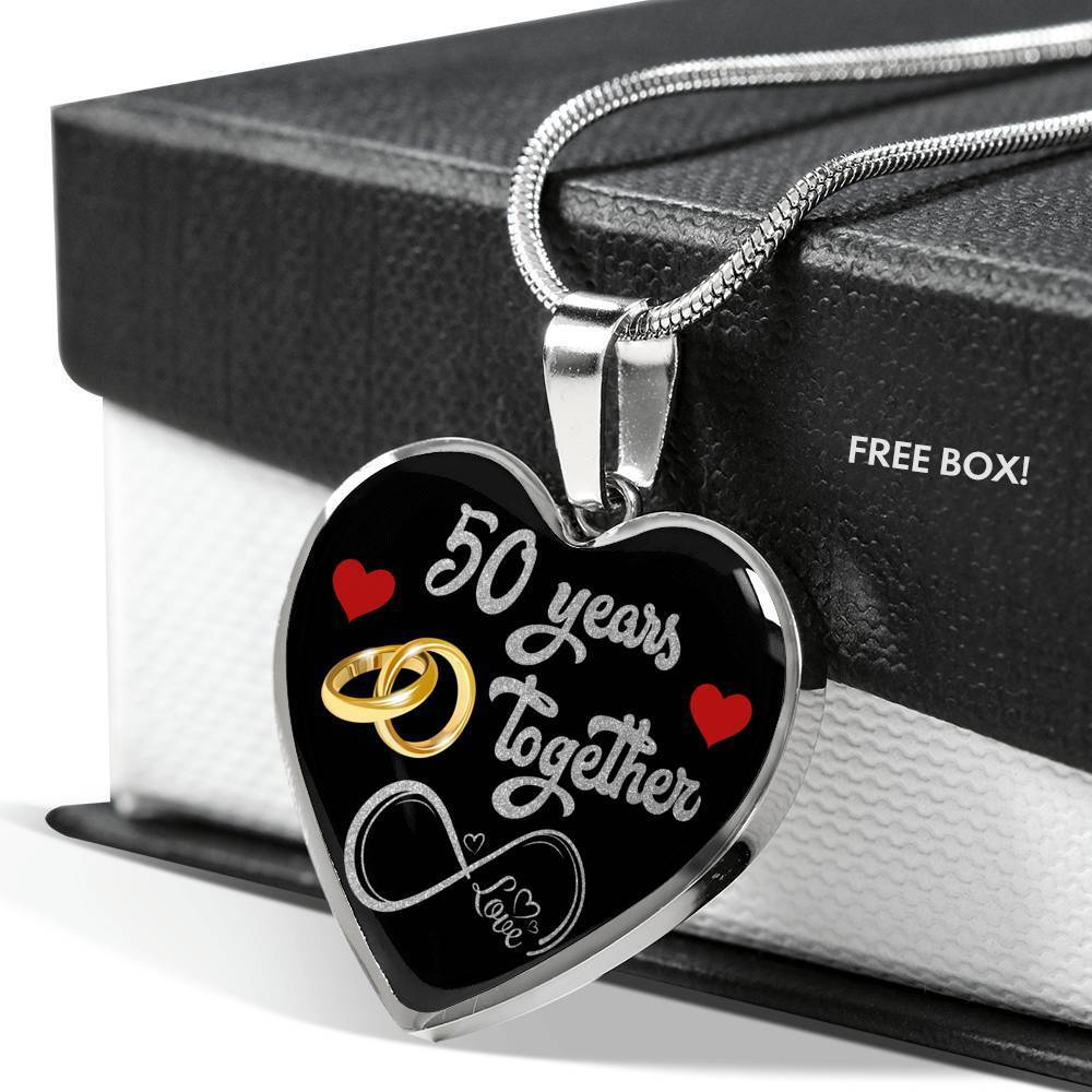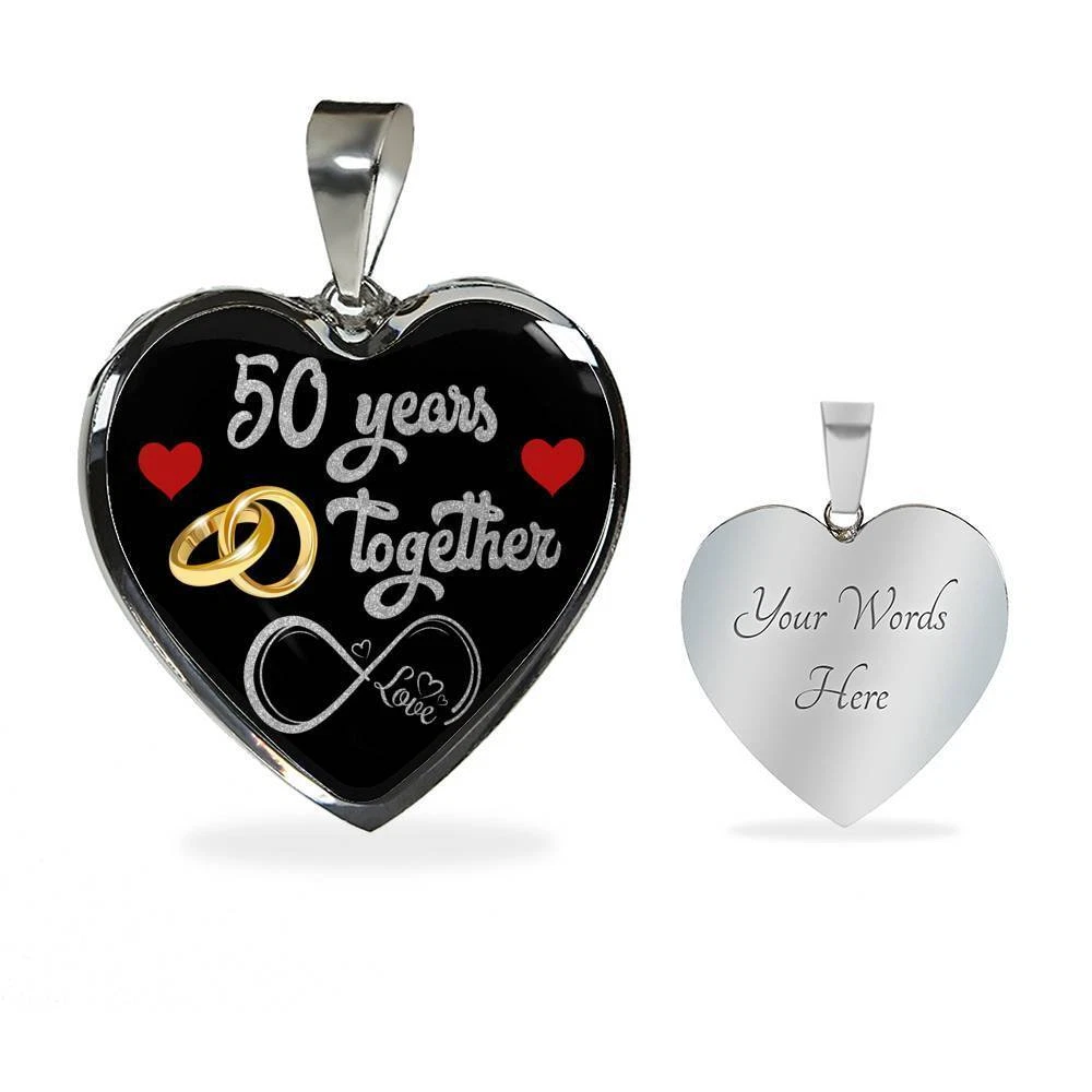 personalized 50th anniversary custom pendant necklace, 50 years wife anniversary gift, 50 years marriage anniversary, best necklace for wife, happy anniversary gift, 50 years together, married 50 years with her, fifty years wedding couple, valentines day romantic necklace, mrs anniversary, custom engraving jewelry, personal keepsake, memory necklace, valentine jewelry gift Add your custom engraving content (the back of the pendant) to create a truly unique piece of jewelry! Purchase this pendant necklace and we guarantee it will exceed your highest expectations! Note: If you want engraved message onto the back of the pendant, leave us a message. Enter up to 40 characters ( up to 20 in every line - including spaces ) for engraving onto the back of the charm. You can choose engraved or ordinary necklace. Our patent-pending jewelry is made of high-quality surgical steel with a shatterproof liquid glass coating and/or 18k gold plating. Our jewelry is hand-made in the U.S.A by awesome working moms just like yours! We hire and train working mothers and pay a living wage. We are proud to support strong communities and keep jobs in America! This Jewelry Item Is the Perfect Keepsake! Whether for Yourself or a Loved One. If the custom engraving option is available, engrave onto the back of the pendant your loved one's name, your wedding date, an anniversary, or anything else you want to remember and keep you close to her heart. Each personalized piece offers exceptional craftsmanship that is fit to be an instant classic in your family. We Offer a 100% Happiness Guarantee If you’re not 100% satisfied with your purchase for any reason, please contact us and we will make it right. Your satisfaction is our ultimate goal. Delivery time: US Delivery Time: 5-8 Days International Delivery Time: 2 - 3 Weeks Product Dimensions: Luxury Necklace: 18-22" (45-56cm) adjustable Heart Pendant: 24mm x 24mm Free Gift Box included