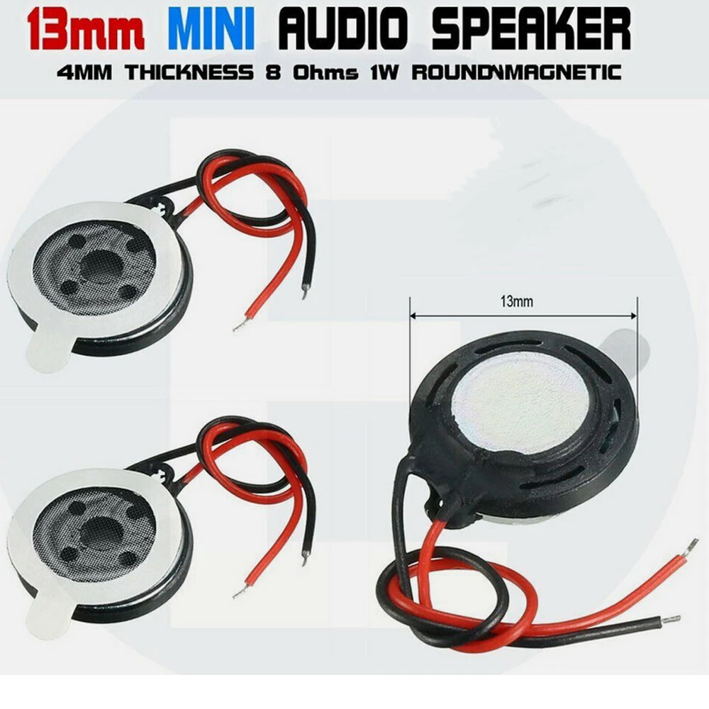 Description: This internal magnet speaker is designed with metal shell, internal magnetic type, easy to install. Application: Mini speakers, GPS Navigator, DVD, EVD, music player, doorbell, computer, multimedia speakers, etc. Specification: Power 1W Resistance 8 Ohm Type Magnet Size 13 x 4mm Wire Length 5cm/1.97" Color Red, Black Material Magnet, Metal, Plastic Weight 5g Note: the red wire is (+), black wire is (-). Package Included:(as your choice) 5PCS/10PCS Internal Magnet Speaker Accessories On Mar 21, 2024 at 04:56:41 PDT, seller added the following information: