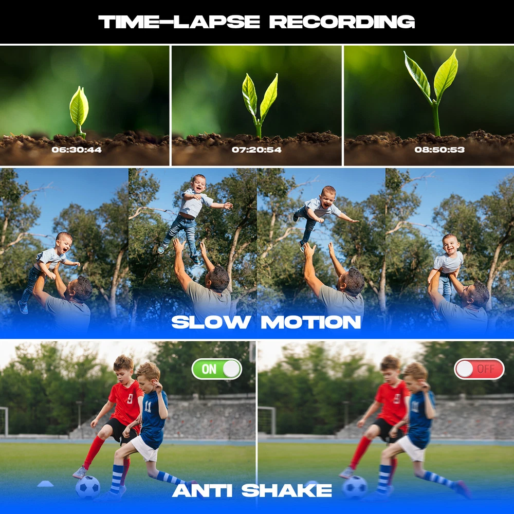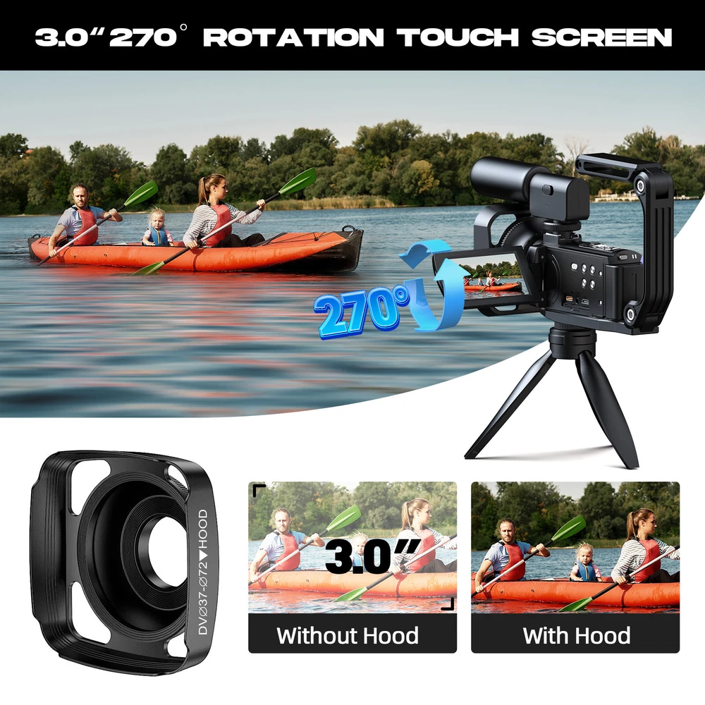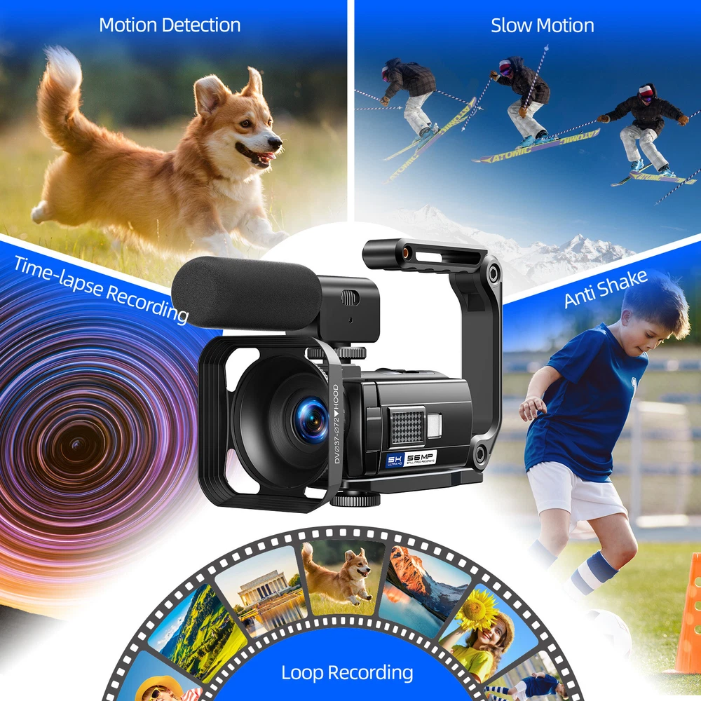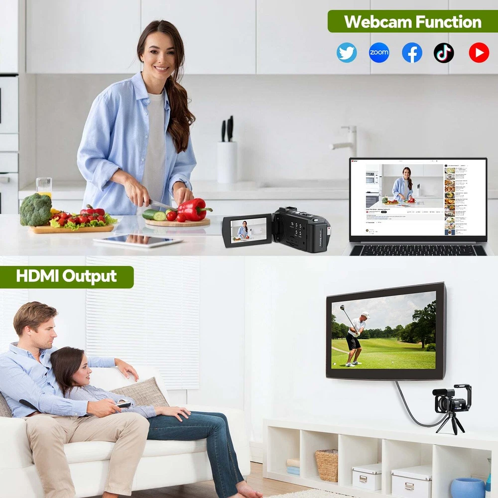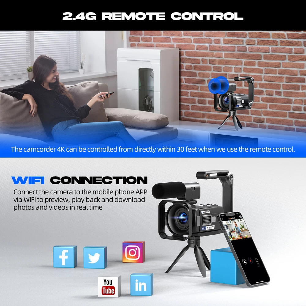 You may also like 4K Video Camera Camcorder Digital Camera Recorder 18XZoom with Flash&Dual Lens 88.99 USD Free shipping Video Camera Camcorder 5K 56MP Vlogging Camera YouTube WiFi Night Vision 3” 270° Rotatable Touchscreen Podcast Camera Recorder with Microphone,Handheld Stabilizer,Hood,Remote,2 Batteries,Tripod with 64GB SD Card CAMPARK 5K 56MP Video Camera Camcorder IR Night Vision YouTube Vlogging Podcast Camera 【UHD 5K Video Camera】 - 5K & 56MP Camcorders can capture video footage with a resolution of 5K (around 5120 x 2880 pixels) and 56MP image resolution. 3.0 inch touch screen can rotate at 270° allows you to take photos and record videos at any angle. 5K video camera supports WDR, playback, continuous shooting, time-lapse, slow motion, loop recording, ect. 【IR Night Vision & Super Long Battery Life】 -The 5K camcorder comes with 2×1700mAh rechargeable batteries. One full-charged battery can be sustainably used for 90-110 mins. The camcorder video camera supports U3 speed or above up to 256 GB MicroSDHC Card (not included).The vlogging camera youtube with infrared LED light allows you to shoot clear white/black photos or videos in the dark. 【Webcam Function & HDMI】 -The camcarders video camera 5K supports for video chatting and live streaming when used as webcam. Just connect with PC via USB cable, choose 'PC Camera' mode to enter webcam function. This digital video camera camcorder can be connected to TV by HDMI cable,share your videos with families and friends. 【Video Camera with Microphone & 2.4G Remote Control】 -The external microphone can effectively eliminate noise, improve stability of audio and receive clear, precise stereo. The Youtube Camera with a 2.4G 360° wireless remote control with a range of up to 20 ft.You can download and share photos and videos with your friends and family via your mobile device by using the WiFi function. 【Lens Hood & Stabilizer Holder】 -This 5K digital video camera comes with lens hood to block excess light and protect your podcast camera lens from accidental damage. Foldable handheld Stabilizer holder keep the 5K camera video stable when recording. If you have any question with vlog camera,please kindly contact to us,we will reply you within 8 hours. Package include: 1×Video Camera Camcorder 1×USB Cable, 1×HDMI Cable,2×Batteries 1×Camcorder Bag, 1×Handheld Stabilizer 1×Microphone, 1×Tripod, 1×Remote Control 1×User Manual 1x64GB SD Card Warm Tips: 1.The 5K camera video Supports U3 speed 64 GB SDHC Card(included). 2.Do not insert or remove the memory card during as this will damage the memory card lose date. 3.Before using the remote control, please remove the battery protection sheet of the remote control. PIease aim the remote control at the remote control receiver, and do not block it. 4.If choose "PC camera", you need to do download the corresponding software. 5.Once EIS is turned on, 5K/25fps resolution cannot be chosen. Once EIS is turned on, the "W/T" zoom function cannot used. 6.Once loop recording is turned on, new videos will overwrite old videos. Please save important files in time. 7.Loop Reording, Slow Motion and Time-lapse Record cannot work at the same time. After turning on the special recording mode, you need to press"REC" to make the camera work in the specified mode. 8.When Slow Motion or Time-lapse is enabled, the Reord Audio is turned off by default and this setting does not work. 9.The camera WiFi can only be connected to a mobile and cannot access the internet. 10.The digital video camera with night vision has a 16x digital zoom function, but it does not support the focus function. You should therefore keep the recording distance more than 0.6 m. 11.The 5K camcorders is design for the amateurs,not for the Professional users.(Auto focus is not supported, optical zoom is not supported) Webcam Function & HDMI Output The 5K vlogging camera for Youtbe can be used as a webcam to conduct video and audio conversations and communications on the network through the podcast camera. You can also connect the vlog camera to the TV with an HDMI cable, and you can playback videos or photos with your family or friends. 5K 25FPS & 56MP &16X Digital Zoom Video Resolution: MP4, 5K 25fps; 4K 30fps; 2.7K30fps; 1080p60fps; 1080p30fps; 720p60fps; 720p30fps Photo Resolution :JPG, 5M; 8M; 12M; 16M; 20M; 24M; 36M; 48M; 56M The Youtube camera support 4x,8x,16x digital zoom 3 Inch 270° Rotation IPS Touch Screen The video camera camcorder 5K has a 3.0” LCD 270° rotatable Touch Screen which you can swivel for selfies and see exactly what you're filming. Handheld Stabilizer The foldable handheld stabilizer saves space and easy to install.Suits for recording moving objects, reducing filming camera shake and shooting clearer pictures and videos. Video Camera with Microphone There is a hot shoe mount on the top of video camera for filming, and an external microphone is installed to eliminate surrounding noise during use, and the sound quality is clearer. WiFi Connection Downloading "Lercenker" APP, easy to connect the camcorders night vision with Android/iOS smartphones and tablets. 5K WiFi camcorder enable remote view, image capture and video shooting. Adjustable Camera Tripod The digital camcorder tripod can be rotated 360° to keep the 5K camcorder video camera for youtube stable at different shooting angles.