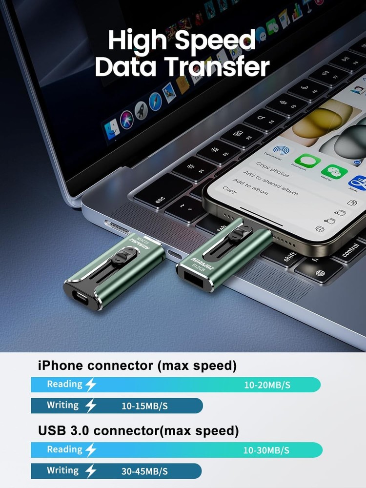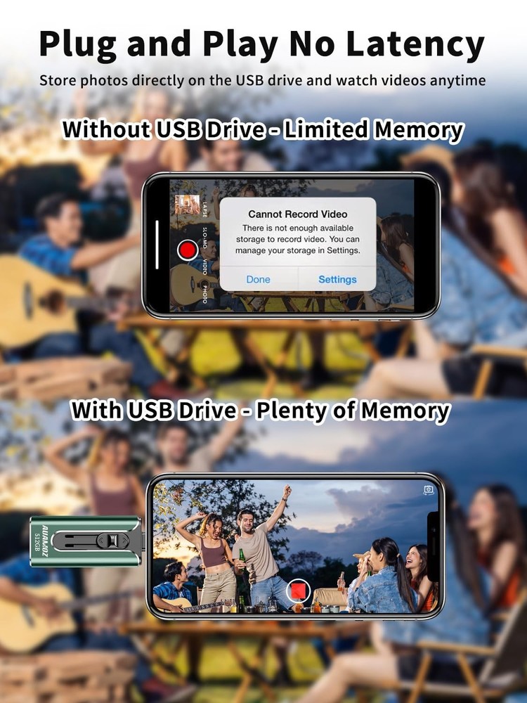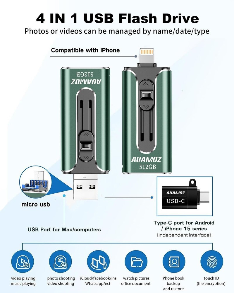 Do you want to make your Phone more convenient? Are you tired of your Phone running out of memory? Do you want to keep enough Phone memory during your trip? Plug and Play, No Application Required! Never lose important documents, videos, photos again thanks to large and reliable Phone flash drives. Free up iPhone and iPad Memory Space Immediately If your iPhone or iPad has almost used up all the memory space, this iPhone USB storage flash drive can help alleviate 512GB of storage space. Whether you like to shoot short videos or take selfies, our iPhone memory stick are perfect for you. One-Click Backup With the phone drive 512GB, easily backup and manage files without relying on iTunes. Use our mobile app to conveniently manage files, contacts, photos, and videos on your phone, and quickly backup to the mini flash drive, saving space on your device. Additionally, share files on the usb thumb drive and store captured videos, photos, or favorite movies directly on the usb memory stick for instant viewing. Plug and Play Share your photos, videos, songs and other files between iPhone picture stick easily. You don't have to pay extra for additional storage, just insert iPhone external storage and enjoy the extra space of your flash drive. High Transfer Speed Smart and upgraded chip with high efficiency and stability. read speed up to 30MB/s and write speed up to 20MB/s. The upgraded chip provides you with more efficient storage experience. How to transfer in iPhone iPad Requires iOS 13 and higher: Simply insert the flash drive into your iPhone iPad, then go to the "Files" app to find "NoName" and move files to your iPad or iPhone as needed. How to transfer in Android Phones Android phones need to support OTG, and flash drives can be found in the “File Manager” of most Android devices. 【Plug and Play, No Application Required, Instantly Increases iPhone and iPad Memory Space】If you almost used up all space on your iPhone or iPad, this photo stick for iPhone helps to expand your memory at full storage with 512GB. And usb memory stick for photos is also a great partner for traveling photographers editing on iPad. Using this memory device for your iPhone, iPad or Computers, no worries with the iPhone storage anymore! 【Universal Compatibility】The phone usb stick has a USB Port/ L Port/Micro USB Port/ USB C (independent adapter) interface, which is convenient for data transmission between different devices and gets rid of the shackles of data cables and iCloud. You can store your favorite videos, photos, movies, and music directly on the memory stick and watch them on your mobile phone at any time. Compatibility iPhone 16/15/14/13/12/11/8/7/6/SE/XR/XS/XS Max/X Series, iPad Air/iPad Pro Series/Android smartphones Series. (Tip: For iPhone/iPad System Version Requires iOS 13 or Higher. For Android smartphones Need to open OTG function) 【High Transfer Speed】Transfer photos, videos, and files in seconds with our USB stick. With a write speed of up to 20 MB/s and a read speed of up to 30 MB/s, our flash drive for iphone have higher performance than conventional usb storage flash drive. Save time and get more done with iphone photo storage stick. Enjoy the whole relaxing trip with never stuttering or buffering video play on the go. (Tip: No Third-Party Apps Required, Simply insert the flash drive into the iPhone iPad and go to "Files" app) 【Watch Movies, Photos and Play Music Directly From Phone Flash Drive】Store your favorite videos, audios and music on your iPhone's Photo Stick, then seamlessly plug and play on your iPhone or iPad anytime, anywhere. No more need for Internet or WiFi. This iPhone storage device plays videos in many different formats. Pictures stored on the Phone storage device also support different formats. Great way to store all your pictures and videos on an phone external storage device. 【How to transfer in iPhone iPad】Requires iOS 13 and higher: Simply insert the flash drive into your iPhone iPad, then go to the "Files" app to find "NoName" and move files to your iPad or iPhone as needed. 【How to transfer in Android Phones】Android phones need to support OTG, and flash drives can be found in the “File Manager” of most Android devices. 【Kindly Note】The phone case may prevent the proper connection between a phone and a USB flash drive, which could result in the phone being unable to recognize the USB flash drive. In this situation, please do not conclude that the usb flash drive cannot be used, remove the phone case and try again. 【Kindly Note】Up to 30MB/s read speed, write speed is lower. Based on internal testing; performance may be lower depending on the host devices and user’s settings and configurations. 【Kindly Note】For Flash Media Devices, 1 megabyte = 1 million bytes; 1 gigabyte = 1 billion bytes. Actual useable capacity may vary. Some of the listed capacity is used for formatting and other functions, and thus is not available for data storage.