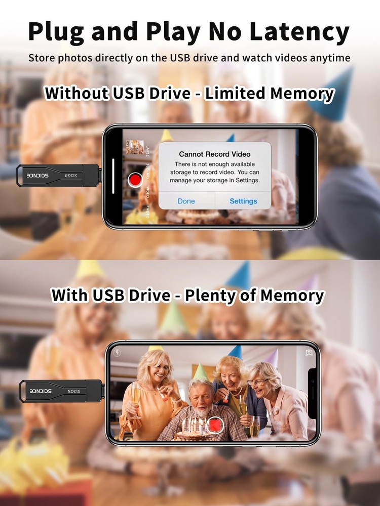Do you want to make your Phone more convenient? Are you tired of your Phone running out of memory? Do you want to keep enough Phone memory during your trip? Plug and Play, No Application Required! Never lose important documents, videos, photos again thanks to large and reliable Phone flash drives. Free up iPhone and iPad Memory Space Immediately If your iPhone or iPad has almost used up all the memory space, this iPhone USB storage flash drive can help alleviate 512GB of storage space. Whether you like to shoot short videos or take selfies, our iPhone memory stick are perfect for you. One-Click Backup You can easily backup with one click and manage files at any time. No need of iTunes, manage files, pictures and videos through the mobile app to quickly backup to iPhone flash drive, save the storage space of the mobile phone, and at the same time, operations such as forwarding files on the USB drive can be performed. Plug and Play Share your photos, videos, songs and other files between iPhone picture stick easily. You don't have to pay extra for additional storage, just insert iPhone external storage and enjoy the extra space of your flash drive. High Transfer Speed Smart and upgraded chip with high efficiency and stability. read speed up to 30MB/s and write speed up to 20MB/s. The upgraded chip provides you with more efficient storage experience. How to transfer in iPhone iPad Requires iOS 13 and higher: Simply insert the flash drive into your iPhone iPad, then go to the "Files" app to find "NoName" and move files to your iPad or iPhone as needed. How to transfer in Android Phones Android phones need to support OTG, and flash drives can be found in the “File Manager” of most Android devices. 【Plug and Play, No Application Required, Instantly Increases iPhone and iPad Memory Space】If you almost used up all space on your iPhone or iPad, this photo stick for iPhone helps to expand your memory at full storage with 512GB. And usb memory stick for photos is also a great partner for traveling photographers editing on iPad. Using this memory device for your iPhone, iPad or Computers, no worries with the iPhone storage anymore! 【Multi-Port USB Drive】The 3 IN 1 phone photo stick with USB-C Port/ USB-L Port/ USB Port (Independent interface), which is more convenient for data transfer between different devices, so as to get rid of the data cable and iTunes and iCloud, let you switch easily storage space. The Phone thumb drive is designed for use with a wide range of devices, Compatibility iPhone 16/15/14/13/12/11/8/7/6S/SE/XR/XS/XS Max/X Series/iPad Air Series/iPad Pro Series. Also support Android smartphones/Computers and other devices with USB-C Ports. (Tip: For iPhone system version requires iOS 13 or higher, For Android smartphones need to open OTG function) 【Watch Movies, Photos and Play Music Directly From Phone Flash Drive】Store your favorite videos, audios and music on your iPhone's Photo Stick, then seamlessly plug and play on your iPhone or iPad anytime, anywhere. No more need for Internet or WiFi. This iPhone storage device plays videos in many different formats.Pictures stored on the Phone storage device also support different formats. Great way to store all your pictures and videos on an phone external storage device. 【High Transfer Speed】Transfer photos, videos, and files in seconds with our USB stick. With a write speed of up to 15 MB/s and a read speed of up to 30 MB/s, our flash drive for iphone have higher performance than conventional usb storage flash drive. Save time and get more done with iphone photo storage stick. Enjoy the whole relaxing trip with never stuttering or buffering video play on the go. (Tip: No Third-Party Apps Required, Simply insert the flash drive into the iPhone iPad and go to "Files" app) 【How to transfer in iPhone iPad】Requires iOS 13 and higher: Simply insert the flash drive into your iPhone iPad, then go to the "Files" app to find "Untitled" and move files to your iPad or iPhone as needed. 【How to transfer in Android Phones】Android phones need to support OTG, and flash drives can be found in the “File Manager” of most Android devices. 【Kindly Note】1) For Flash Media Devices, 1 megabyte = 1 million bytes; 1 gigabyte = 1 billion bytes. Actual useable capacity may vary. Some of the listed capacity is used for formatting and other functions, and thus is not available for data storage. 2) Up to 30MB/s read speed, write speed is lower. Based on internal testing; performance may be lower depending on the host devices and user’s settings and configurations. 【Kindly Note】The phone case may prevent the proper connection between a phone and a usb flash drive, which could result in the phone being unable to recognize the usb flash drive. In this situation, please do not conclude that the usb flash drive cannot be used, remove the phone case and try again. 【Reliable After-Sales Service】Experience the convenience of high-quality USB memory stick and enjoy our premium customer service at the same time. For the phone flash drive, if you have any questions, we are willing to provide help.
