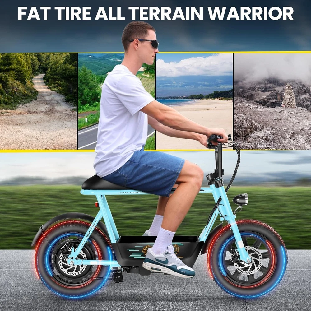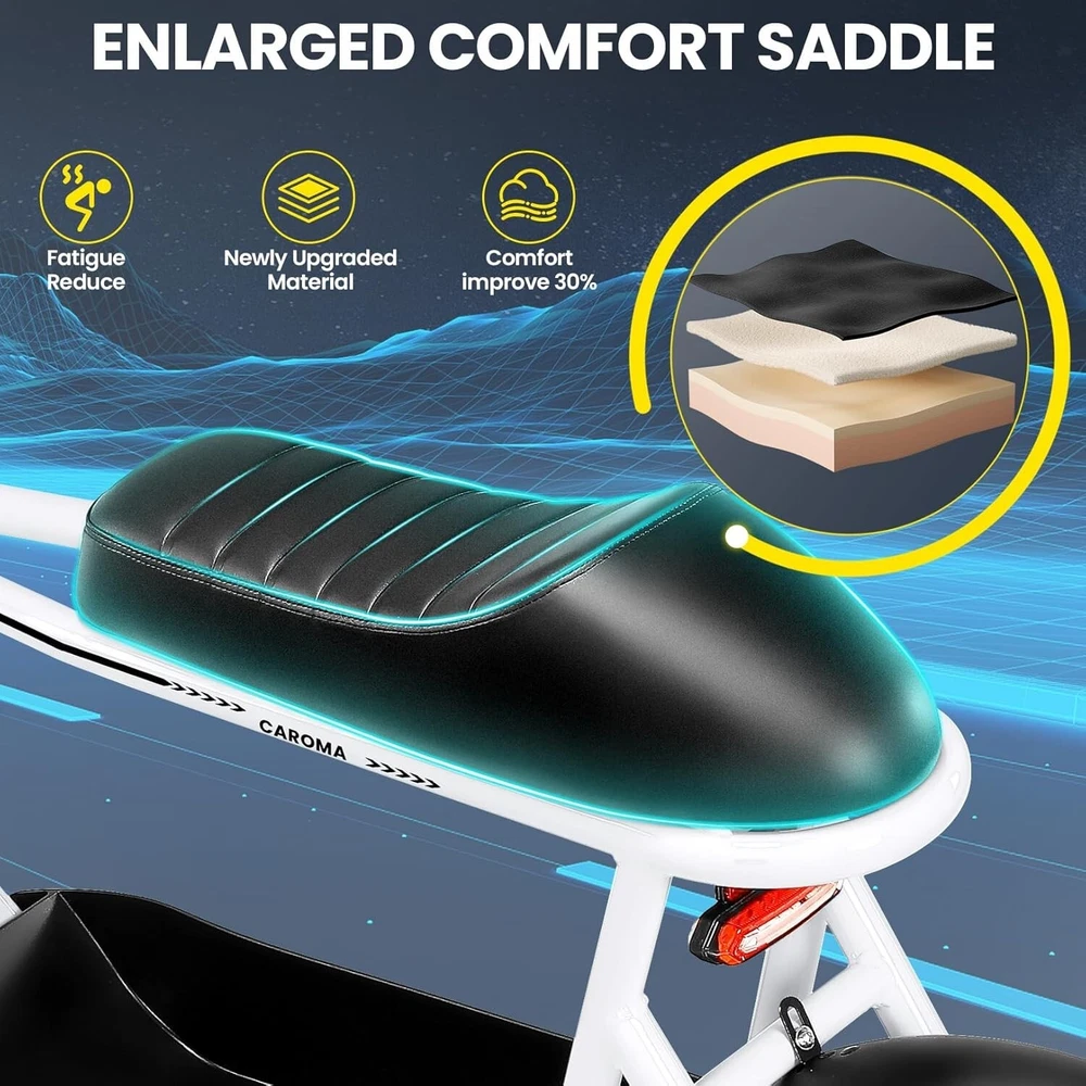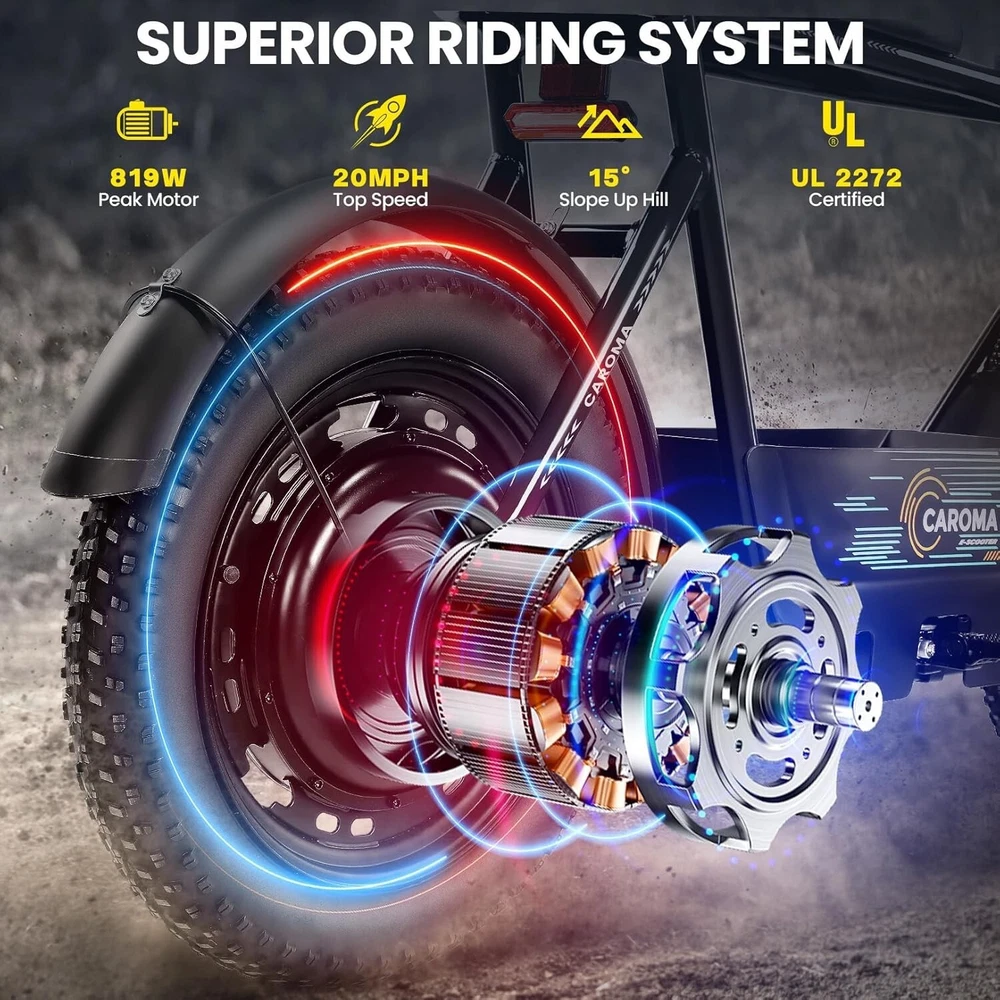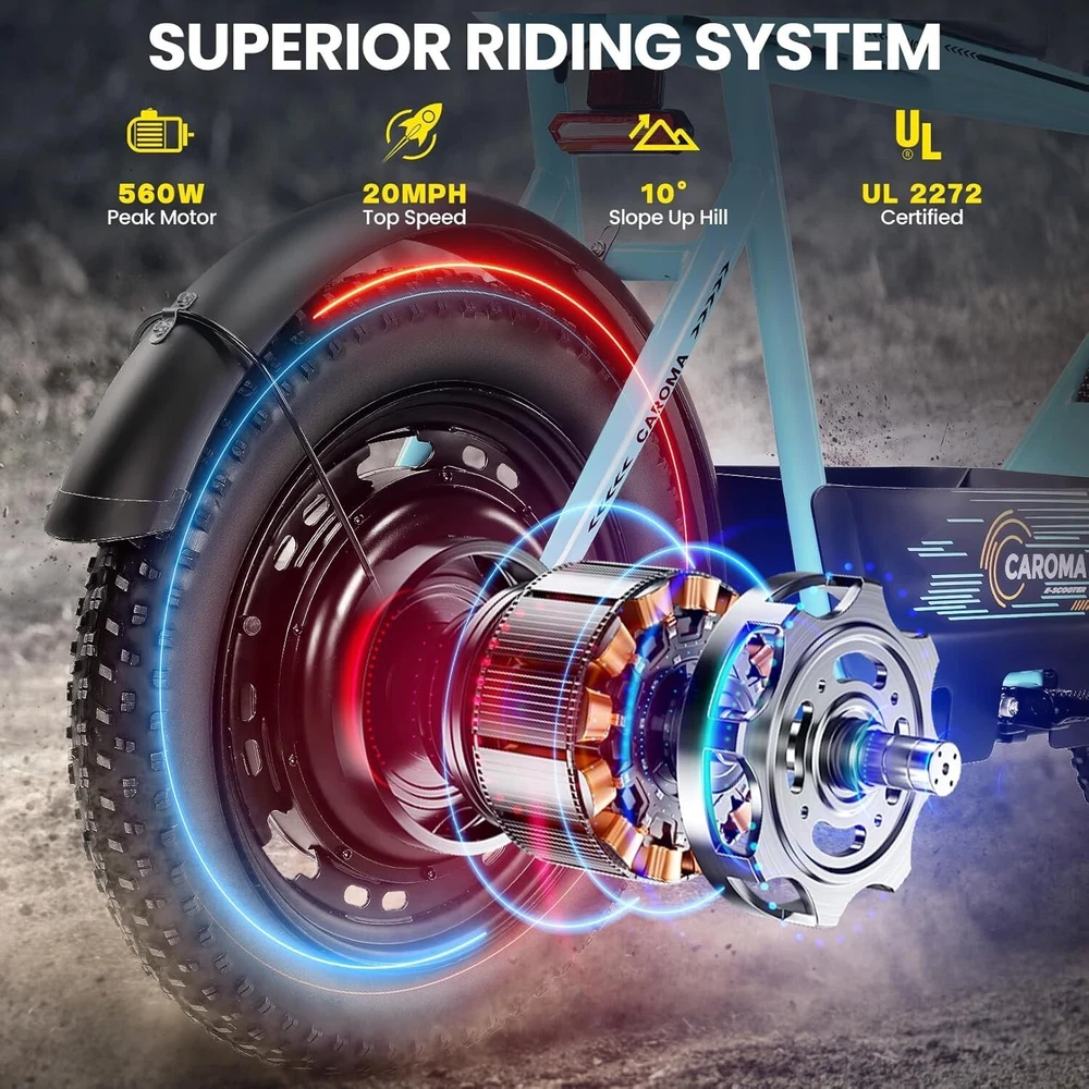 Product Description About this item ใ€๐™๐™ฃ๐™ž๐™ฆ๐™ช๐™š ๐™Ž๐™ฉ๐™ฎ๐™ก๐™š & ๐™Ž๐™ฅ๐™ค๐™ง๐™ฉ๐™จ ๐™‘๐™ž๐™จ๐™ž๐™ค๐™ฃใ€‘:This ๐—บ๐—ผ๐˜๐—ผ๐—ฟ๐—ฐ๐˜†๐—ฐ๐—น๐—ฒ ๐˜€๐˜๐˜†๐—น๐—ฒ electric scooter for adults features a ๐˜‚๐—ป๐—ถ๐—พ๐˜‚๐—ฒ ๐—ฎ๐—ป๐—ฑ ๐—ถ๐—บ๐—ฎ๐—ด๐—ถ๐—ป๐—ฎ๐˜๐—ถ๐˜ƒ๐—ฒ ๐—ฑ๐—ฒ๐˜€๐—ถ๐—ด๐—ป. The saddle is both delicate and soft, with a strengthened pole that creates a thrilling sports adventure experience. You'll turn heads with this bike and be the envy of others. Join us and try out the latest fashion trend. ใ€๐˜ผ๐™ก๐™ก-๐™๐™š๐™ง๐™ง๐™–๐™ž๐™ฃ ๐™ˆ๐™–๐™จ๐™ฉ๐™š๐™ง๐™ฎใ€‘:๐Ÿญ๐Ÿฒ*๐Ÿฏ" ๐—ณ๐—ฎ๐˜ ๐˜๐—ถ๐—ฟ๐—ฒ๐˜€ provide a larger contact area, giving the scooter better stability and grip on a variety of surfaces. Fat tires better absorb vibrations on the road, providing a smooth and comfortable ride even on uneven roads,๐—ฟ๐—ฒ๐—ฑ๐˜‚๐—ฐ๐—ถ๐—ป๐—ด ๐˜๐—ต๐—ฒ ๐—ฟ๐—ถ๐˜€๐—ธ of a blowout when driving over sharp objects, more suitable for extreme or irregular terrain, such as off-road mountain or beach, expanding the range of riding environments. ใ€๐™‹๐™š๐™–๐™  ๐Ÿญ๐Ÿฎ๐Ÿฌ๐Ÿฌ๐—ช ๐™ˆ๐™ค๐™ฉ๐™ค๐™ง & ๐Ÿฑ๐Ÿฌ๐Ÿฌ๐™’๐™ ๐˜ฝ๐™–๐™ฉ๐™ฉ๐™š๐™ง๐™ฎใ€‘: ๐—–๐—”๐—ฅ๐—ข๐— ๐—” ๐——๐Ÿฏ ๐—ฒ๐—น๐—ฒ๐—ฐ๐˜๐—ฟ๐—ถ๐—ฐ ๐˜€๐—ฐ๐—ผ๐—ผ๐˜๐—ฒ๐—ฟ with seat is equipped with a ๐Ÿณ๐Ÿฑ๐Ÿฌ๐—ช(๐—ฃ๐—ฒ๐—ฎ๐—ธ ๐Ÿญ๐Ÿฎ๐Ÿฌ๐Ÿฌ๐—ช) brushless hub motor and ๐Ÿฑ๐Ÿฌ๐Ÿฌ๐—ช๐—ต long lasting battery, so that it can reach ๐Ÿฎ๐Ÿฌ๐— ๐—ฃ๐—› top speed and travel up to ๐Ÿฏ๐Ÿฌ ๐—บ๐—ถ๐—น๐—ฒ๐˜€ on a single charge. The E sooter can run smoothly even on a ๐Ÿฎ๐Ÿฌยฐ road. ใ€๐™‹๐™š๐™ง๐™›๐™š๐™˜๐™ฉ ๐™€๐™ก๐™š๐™˜๐™ฉ๐™ง๐™ž๐™˜ ๐˜ฝ๐™ž๐™ ๐™š ๐™›๐™ค๐™ง ๐˜ผ๐™™๐™ช๐™ก๐™ฉ๐™จ ๐™๐™ฃ๐™™๐™š๐™ง $๐Ÿฑ๐Ÿญ๐Ÿฌใ€‘:๐—–๐—”๐—ฅ๐—ข๐— ๐—” ๐——๐Ÿฏ ๐—ฒ๐—น๐—ฒ๐—ฐ๐˜๐—ฟ๐—ถ๐—ฐ ๐˜€๐—ฐ๐—ผ๐—ผ๐˜๐—ฒ๐—ฟ is a standout choice with its unbeatable price/performance ratio. Not only does it excel in its price range, but its unique design ensuring you turn heads wherever you go. Electric scooter arrives ๐Ÿด๐Ÿฑ% ๐—ฝ๐—ฟ๐—ฒ-๐—ฎ๐˜€๐˜€๐—ฒ๐—บ๐—ฏ๐—น๐—ฒ๐—ฑ. Simply install the front wheel, handlebars, pedal and basket, you're ready to hit the road with ease. ใ€๐™๐™ง๐™ช๐™จ๐™ฉ๐™š๐™™ ๐™Œ๐™ช๐™–๐™ก๐™ž๐™ฉ๐™ฎ ๐˜ผ๐™จ๐™จ๐™ช๐™ง๐™–๐™ฃ๐™˜๐™šใ€‘:The caroma electric scooter is UL 2272 certified. We provide a ๐Ÿญ๐Ÿฎ-๐—บ๐—ผ๐—ป๐˜๐—ต ๐˜„๐—ฎ๐—ฟ๐—ฟ๐—ฎ๐—ป๐˜๐˜† for this electric scooter. If you encounter problems when using the product, please refer to the manual. If the problem cannot be solved, feel free to contact our customer service. ใ€๐™‡๐˜พ๐˜ฟ ๐˜ฟ๐™ž๐™จ๐™ฅ๐™ก๐™–๐™ฎ & ๐™Ž๐™–๐™›๐™š ๐™ฉ๐™ค ๐™๐™ž๐™™๐™šใ€‘:The LCD monitor shows the ๐—ฏ๐—ฎ๐˜๐˜๐—ฒ๐—ฟ๐˜† ๐—น๐—ฒ๐˜ƒ๐—ฒ๐—น of the e scooter, so you can get a clear picture of your riding. The effective front and rear disc brake on the e-scooters provide excellent stability and control. Complete with a ๐—ฐ๐—ผ๐—ผ๐—น ๐—ต๐—ฒ๐—ฎ๐—ฑ๐—น๐—ถ๐—ด๐—ต๐˜ for optimal safety during night rides. The high-brightness headlight and rear brake light ๐—ธ๐—ฒ๐—ฒ๐—ฝ ๐˜†๐—ผ๐˜‚๐—ฟ ๐—ฟ๐—ถ๐—ฑ๐—ถ๐—ป๐—ด ๐˜€๐—ฎ๐—ณ๐—ฒ at night.