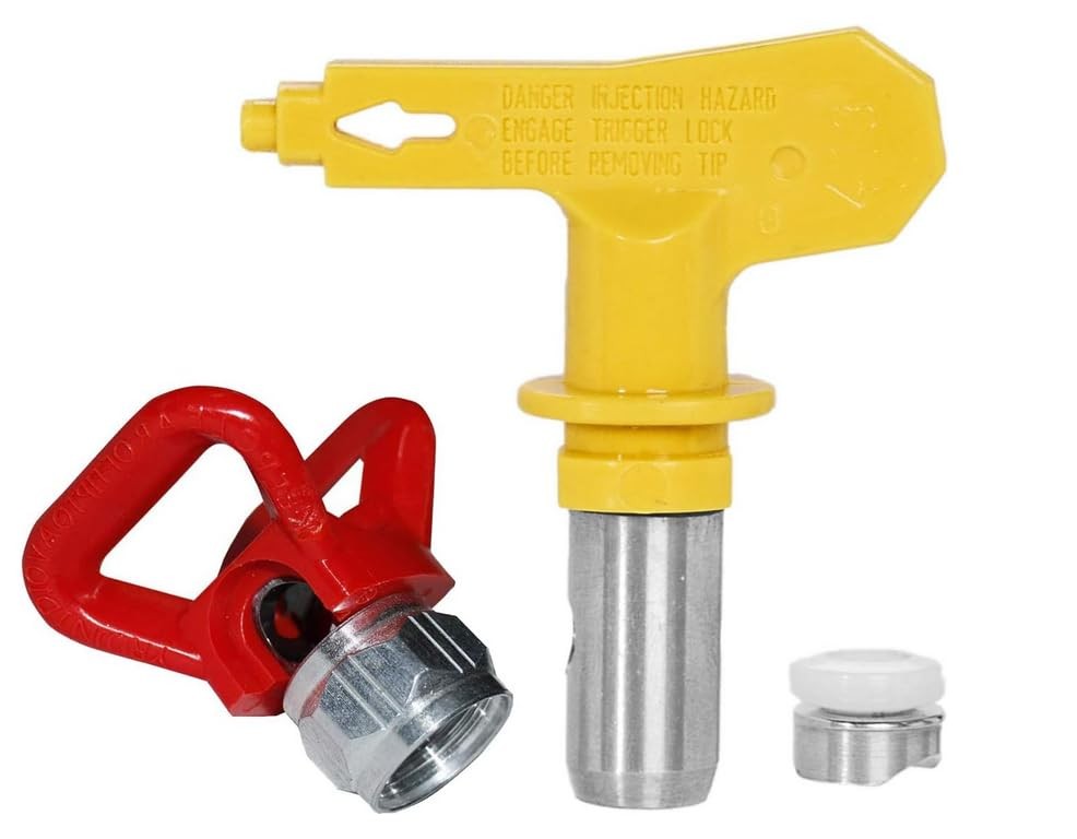 Model:243611,Nozzle:517 Product Size: Approx. 2.6X 2.4 X 1.8 IN Package Weight: 0.23 IBS Material: brass, hard aluminum,strength plastic. 517 tip Composed of 304 stainless steel handle and tungsten carbide orifice. Color: red and yellow Suitable places:“Frac 5” spray tip is a wide pattern. Suitable for most mainstream airless spray guns and coatings,small to medium-sized and large residential, commercial buildings spraying works, sprayable interior and exterior paint, oil paint. It can be used for paint, furniture, fence, home decoration and industrial fine paint and decoration Strong Fogging & Cleaning Power:Perfect atomization and antiswitched from cleaning ability, depending on the size of the aperture, the range will be different. The sprayer tips make an easier preparation of the surface, painting, and other coatings as well as the cleaning after painting Easy to Install: The airless sprayer nozzle is designed for airless spraying machine,easy to install without tools, easy to operate in a few moments. Thread clear and easy removal. Tips :The first number represents the width of the spray stream the bigger the number,the larger the spray pattern. two followed numbers representing the amount of flow the larger the number the greater the flow 【Professional Precision Spraying】Clog-resistant tip for smooth, streak-free finishes with latex, oil paint, stains & primers. 【Heavy-Duty Metal & Plastic Guard Combo】Built to last with a corrosion-resistant metal nozzle and impact-resistant plastic guard. The sturdy design protects the tip from damage and extends the lifespan of your airless spray gun accessories 【Perfect Fit for 7/8" Thread Spray Guns】Note: Only compatible with spray guns featuring 7/8" threaded joints (check your model before purchase). 【Versatile Applications】- Ideal for interior walls, exterior fences, furniture refinishing, and decks. Works with stains (oil/water-based), primers, and epoxy coatings up to 0.021" viscosity." 【90-Day Satisfaction Guarantee】We focuses on providing high-quality products and first-class services at reasonable prices. If you are not satisfied with our products, you can return them within 90 days