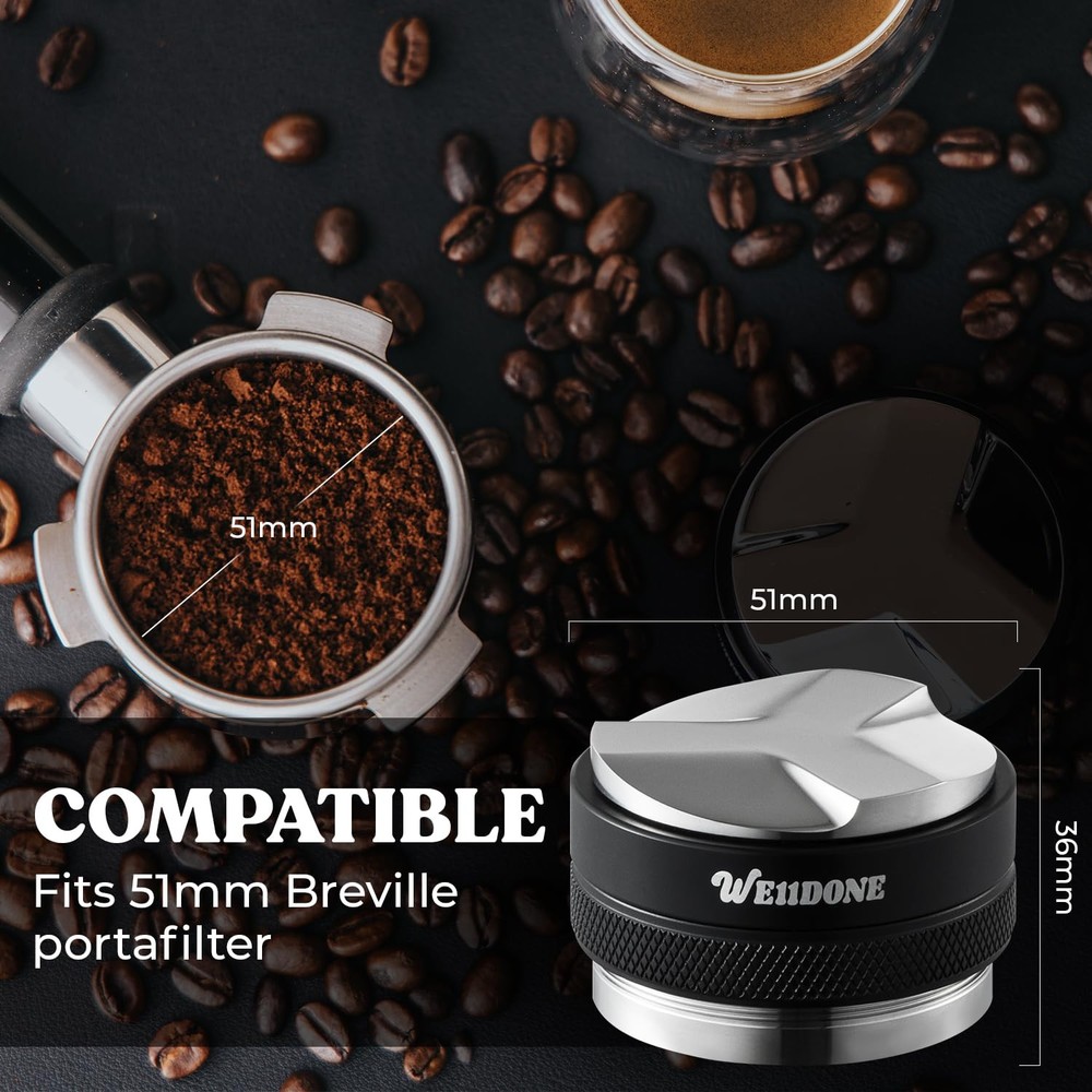 Crafted for Multi-brand Compatibility:The 51mm espresso tamper, designed with an adjustable distributor and base, is meticulously tailored to harmonize with various portafilters and espresso machines. Compatible brands include Delonghi pump machine series, Capresso PRO and Breville 800 Series and other espresso machines with 51mm portafilter Consistent Brewing Stability:assures a stable brewing experience by delivering uniform distribution and pressure every time. Pulling a perfect shot at home is effortless, thanks to the consistent tamp achieved by leveling the coffee grounds before tamping. Adjustable Depth and Comfortable Grip:With height adjustability catering to any portafilter basket depth, our 51mm espresso tamper ensures consistent tamping pressure, resulting in an exceptional cup every time. The diamond-patterned grip provides a non-slip, incredibly comfortable feel in your hand. Dual-Head Design for Unmatched Versatility:Experience unparalleled versatility with our dual-sided distributor/leveler and tamper. The ingeniously designed unit offers flexibility, making it a versatile tool for various coffee-making techniques. Pro Tips for Enhanced Enjoyment:shares professional insights to elevate your experience. Ensure the portafilter basket is fully dosed with coffee grinds for optimal tamper pressure, creating a tighter pack and richer flavor. Groom the basket's top with a finger or flat edge before leveling and tamping. Brew with high-quality, filtered water for an exceptional result.