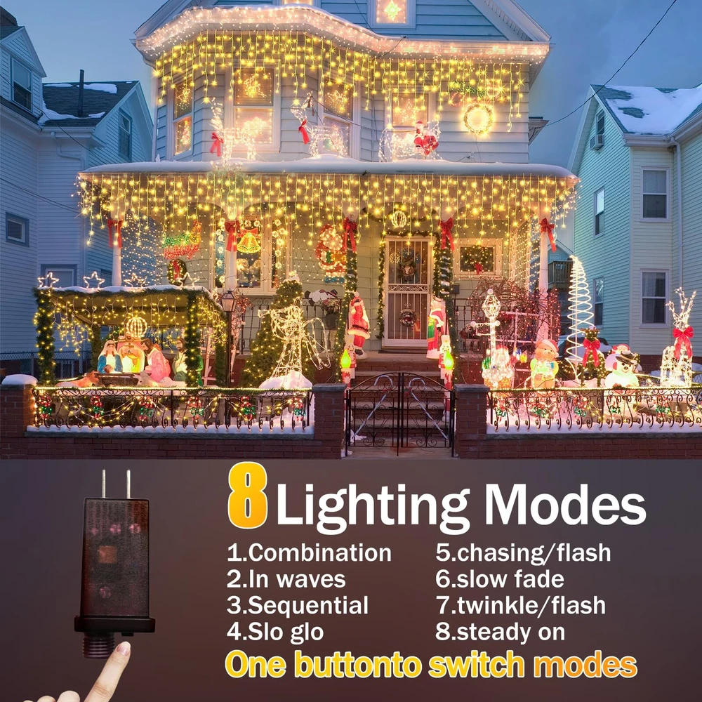 【High Specification Configuration】Outdoor Christmas lights up to 52 feet long, hanging 480 LEDs, a total of 80 drops, coupled with 11.5 feet of lead wires, equipped with low voltage plugs and multi-functional to give you a safe and convenient experience. 【Low Voltage Safety】Using low voltage and low power adapter, safe 30V working voltage and 6W low voltage output, maximize the brightness and also ensure the safety of the power supply, will not cause overheating, overload and other electrical safety issues. Give you a safe outdoor string light. 【Dustproof and Waterproof】 IP44 level of protection, can completely prevent the diameter or thickness greater than 1.0mm of foreign objects invasion and splashing water from all directions, so that the Christmas lights outdoor in storms, snow days and other environmental conditions can still play a role, but need to pay attention to not being immersed in water.Plugs should not enter water. 【Multi-function】Fairy string light have 8 light modes: Combination, Wave, Sequence, Slow Light, Flash, Slow Fade, Flashing, Normal Light. Four levels of brightness adjustment: 100%-75%-50%-25%, timed automatic shutdown, a variety of functions can be used with the one key control. 【Packaging & Quality Assured】You will get: 1x 480LED, 1x UL plug us,1x Instruction manual, any questions about the Outdoor Christmas lights Decorations,You can contact us at any time, We will provide you with a solution as soon as possible,to ensure that the quality of the product as well as the use of your experience..
