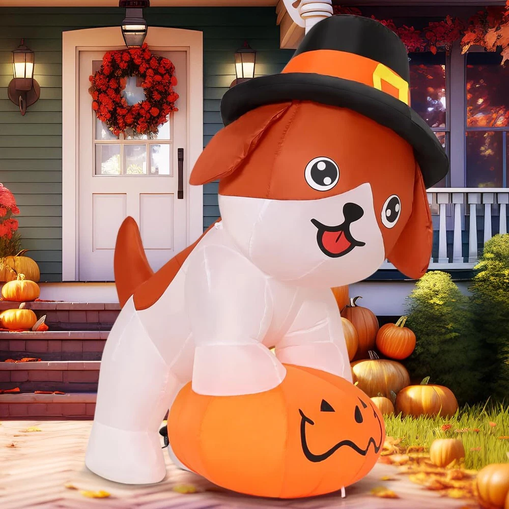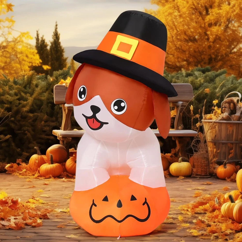 【Cute Thankgiving Decoration】 - The Dog Inflatable standing on a Pumpkin with Pilgrim Hat, and built-in bright LED lights in the cute body, making your inflatble thanksgivig special and attractive, creating a happy Thanksgiving spirit for your home.Beside Thanksgiving, it can be used as any other holiday decoration. 【Fast Inflation & Certified Safety】 - Our Thankgiving decorations outdoor are equipped with a high-performance waterproof fan, which can be itself inflated quickly. Supported by a CE and UL-certified adapter, complemented by a 10-foot power cord. 【Strong Weather-Resistant】 - Crafted of high-quality waterproof polyester, our halloween inflatable blow up decoration is strong for use. Rain or shine,inflatable halloween decorations are strong enough to last throughout the holiday season. 【Easy Use and Storage】 - Our package included everything needed for an easy setup and storage: sandbag,ground stakes,securing ropes,and a storage bag. After the holiday,just deflate,fold,and for the next festive season using the provided storage bag. until there is enough air inside. Then fix the inflatable decoration by the stakes and make sure it is secured on the ground. TIPS: do not put anything into the blower and decorations.