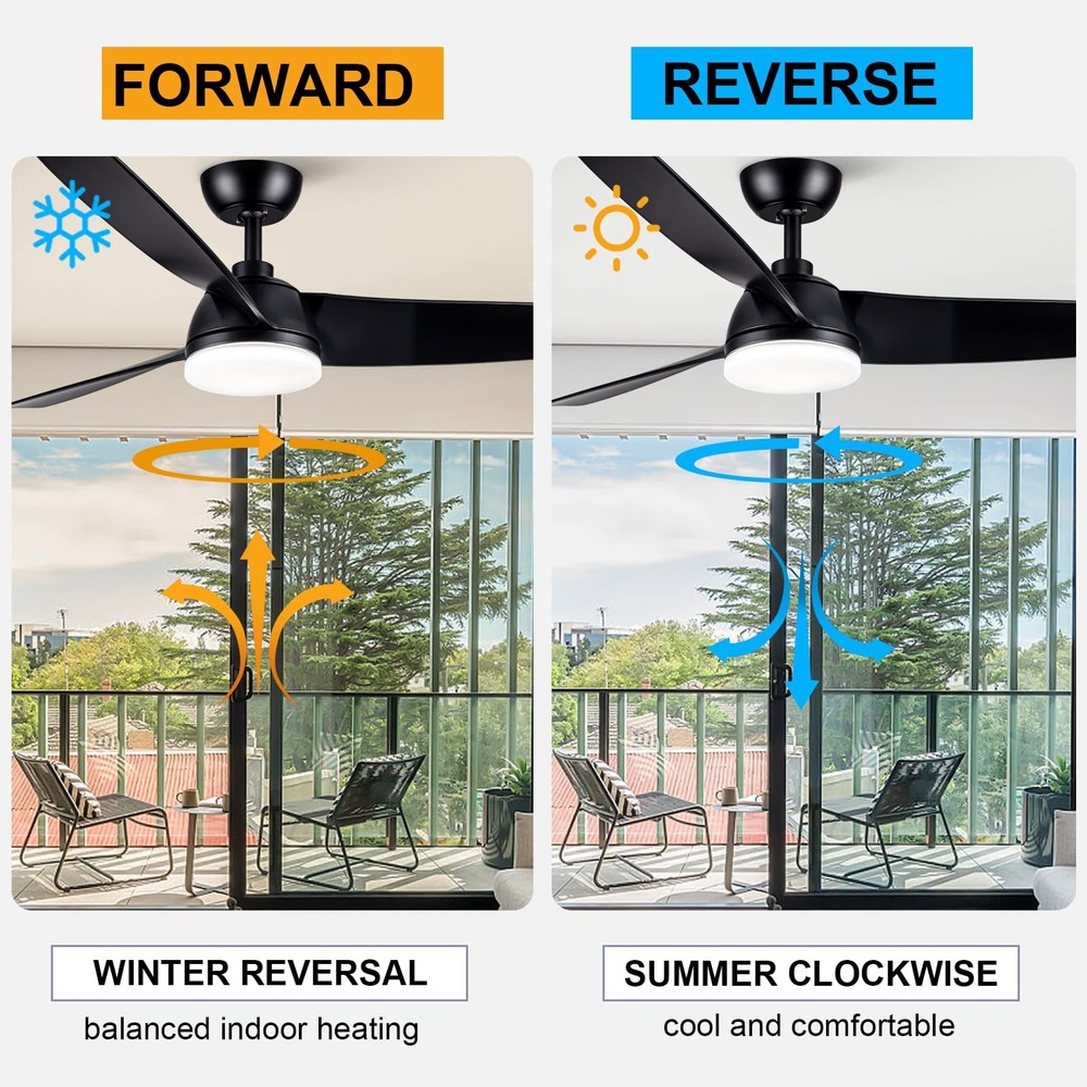 52 Inch Ceiling Fan with Light and Remote Control,6 speed adjustable remote control,3 color Dimmable LED,1/3/6 Hours Timer,Reversible DC motor, Black Modern Design For Living Room Bedroom Kids Room Dining Room Warehouse Patio 52 inch Ceiling Fan with Light and Remote Control,this Minimalist Modern Ceiling Fan is pretty matched with modern home decoration.Comes with both Matte Black Blades;Its medium size matches with most of home scenarios.This low profile ceiling fan makes your home more comfortable,moves more fresh air to your home,brings you bright environment Ceiling fan with LED Light and DC motor, 24W LED can illuminates all home spaces,3 colors dimmable LED, with Cold to Warm(3000/4000/6000K) / Dim to Bright(20%~100%) adjusting; 6 speeds Quiet DC motor with Reversible Function is suitable for all seasons, Double colored/dual sided blades with high quality CMF. It runs ultra quiet(lower than 30dB),makes all family members can enjoy peace,coolness and fresh air absolutely New Generation Remote Control, attached bracket kit, could be fixed on wall as wall-switch.Comes with richer functionality :Light ON/OFF, supports 3-color temperature + adjustable brightness. Supports adjustable Speed levels: 1-2 Soft,3-4 Natural,5-6 Cooling, and One-click FAN OFF; Control Forward/Reversible dual-mode air circulation for all seasons;1/3/6 Hours Timer for your choice;One-click sleep mode for more convenience Modularity design, makes installation very easy.Packaging with Easy-assemble 3 Blades,plug-in LED light Module and Remote Control Module,DC Motor Kit and User Guide inside.Downrod Ceiling Fan with Low profile design,it could be installed in dining room,living room,bedroom,warehouse,kitchen and all indoor spaces,even outdoor as patio ceiling fans are designed for your home life and beneficial for household expense.Energy-efficient DC Motor makes air circulation(Max to 6000 CFM) in all seasons but less power consumption.LED lighting your home also with low power consumption.ETL certified and listed relying powerful factory provides a wide range of products, also provides professional After Sales Service and support includes return service and spare part supplying for repair