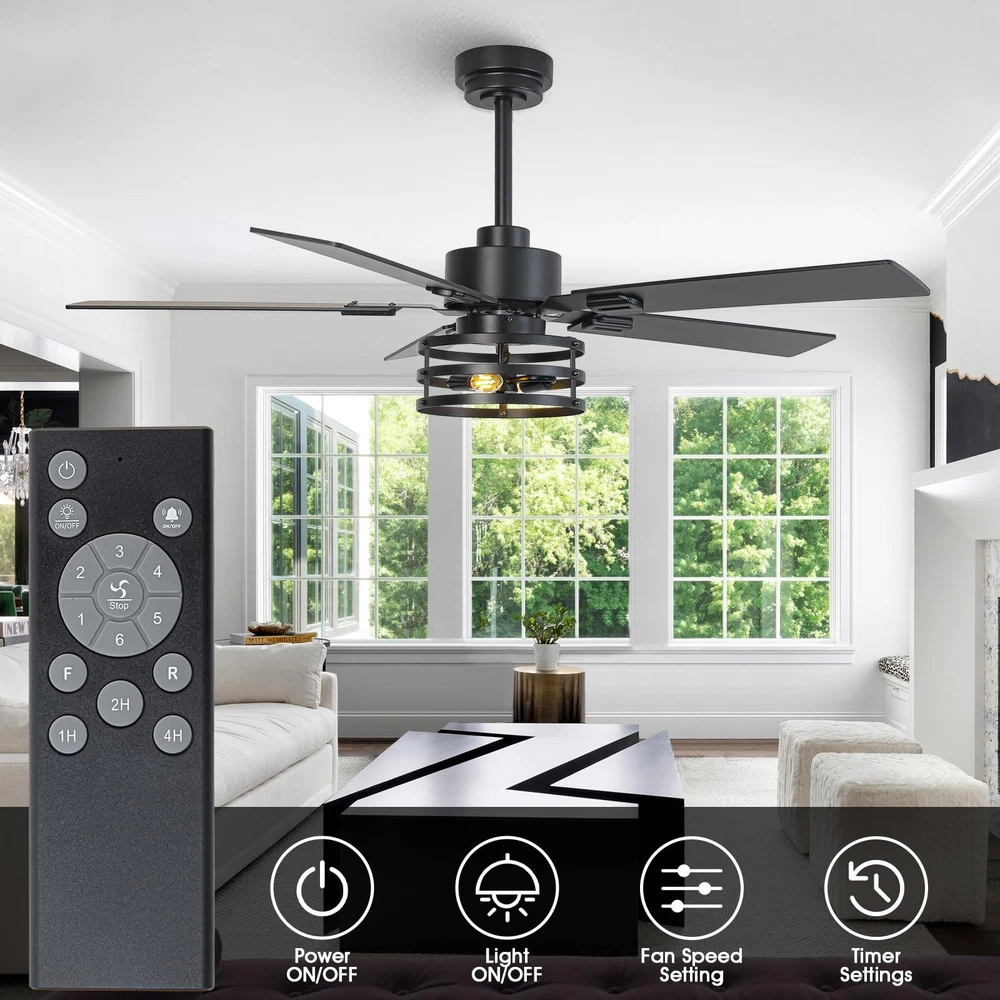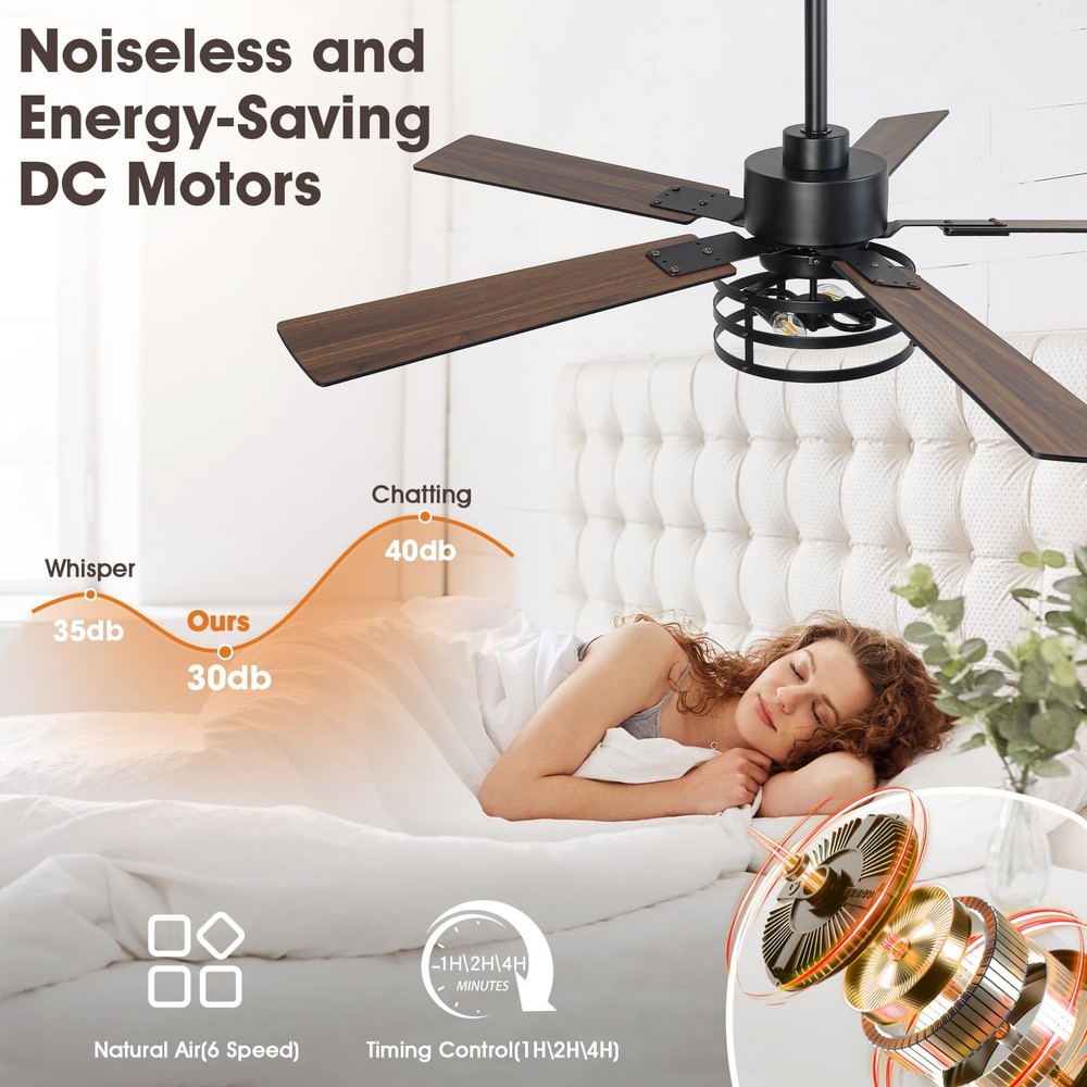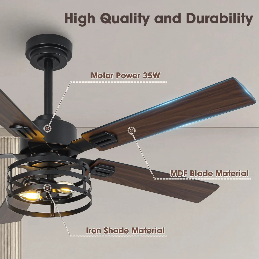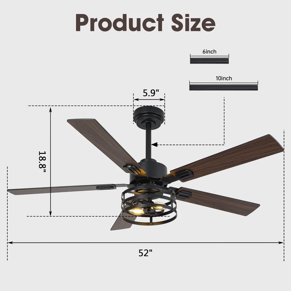 Product Parameters: Maximum Wind Speed: 5154 CFM Wind Speed Gear: 6 speed Adjustable Light Source Type: LED Lights Low Noise: 30dB Color: black and natural walnut Size: 52 inch Timer: 1/2/4-hour timer Weight: 13.22 Pounds Product Material: Iron+MDF+Plywood Product Safety Certification: FCC, DOE, ETL Control Mode: Remote Control (easy install ceiling fan supports wall control, but does not include control switches. App control is not supported yet) Suitable For Various Scenes: LED ceiling fans for bedroom,indoor/outdoor patio use. Warm Reminder: To extend the service life of your ceiling fans with lights,Cavoid direct exposure to rain or sunlight. VINTAGE AND ELEGANT 52 INCH CEILING FAN LIGHT: Elegant farmhouse style design of the 52 inch ceiling fan with light fan blade both sides of the color can be installed, warm light adds a sense of atmosphere, the ceiling fan with remote enhances the ambiance of your living room, bedroom, kitchen, and more. MULTIFUNCTIONAL DESIGN: This ceiling fans with lights and remote can be 6-speed wind speed, 1/2/4-hour timing off, and can also turn off the light or fan individually, easily adapting to the needs of any scene. EXTRA LARGE AIRFLOW AND QUIET RUNNING: Maximum airflow up to 5,154CMF, high quality DC motor can be turned forward and reverse to meet the needs of different seasons. In addition, the ceiling fans is very energy efficient, consuming up to 65% less power than AC motors, and running quietly. MULTIPLE MOUNTING STYLES: Our black ceiling fan with light come with two different lengths of hanging rods (6 inches and 10 inches), which can be adapted to different height requirements. This ceiling fans with lights can also be installed on ceilings with a 15-degree tilt angle and comes with detailed installation instructions. SAFE AND RELIABLE CEILING FAN: This retro outdoor ceiling fan is made of high quality MDF fan blades and comfortable eye soft light, which makes the process of using it safe and comfortable, and also has the necessary safety certificates (FCC, DOE, ETL), ensuring peace of mind for both indoor and outdoor use.