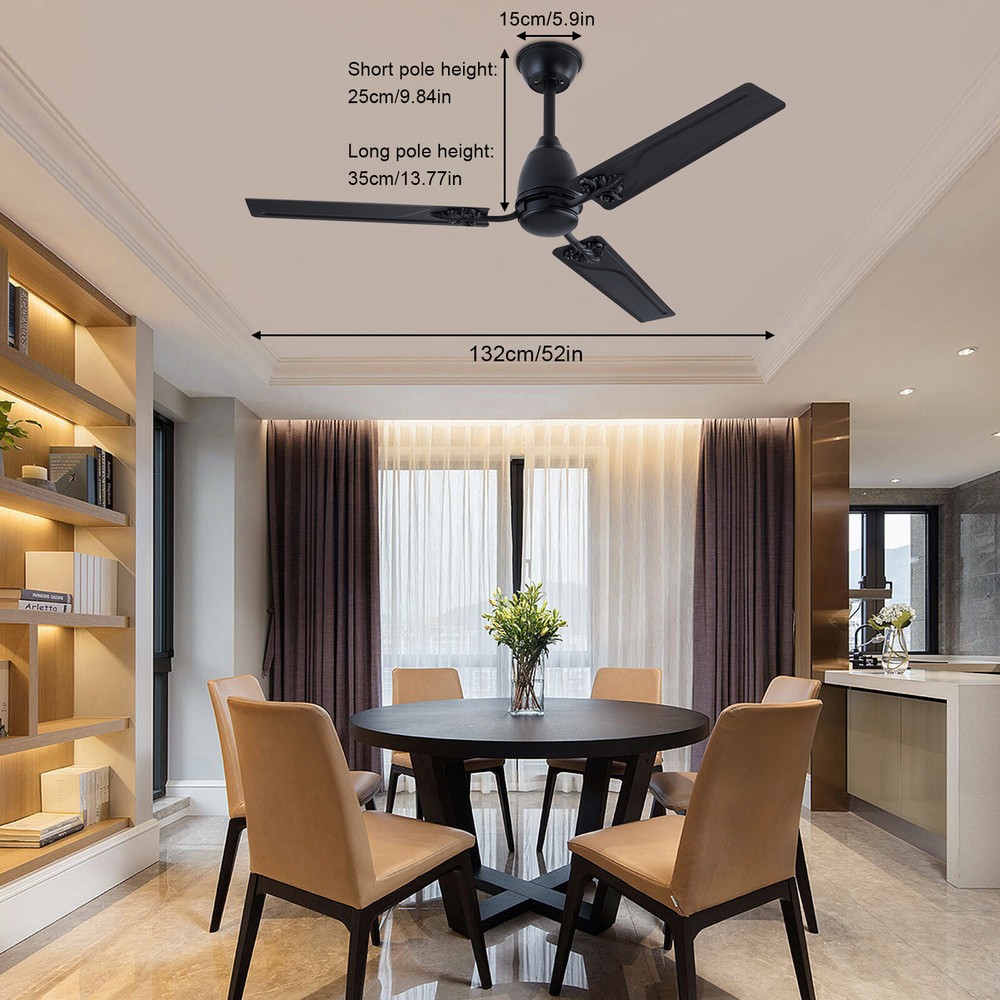Description When a light breeze meets in your living room or bedroom, every ordinary moment of daily life becomes extraordinary. This ceiling fan ensures strong wind coverage and the wind dances with rotation, adding a flowing artistic beauty to the space. It is not only a choice for home appliances, but also a symbol of your pursuit of quality of life. Let it help you explore new dimensions of elegance, making every strand of wind a warm and artistic presence in your home. Specification Material: Iron Style: Modern Color: Black Control Method: Remote Mounting Type: Ceiling Mount Motor: DC Pure Copper Motor Remote Control Battery: 2*AAA Batteries (Included) Waterproof Level: IP44 Wattage: 22W Air Volume: 7230CFM Time Setting: 1/4/8H Noise Level: <30dB Voltage: 85-265V Ceiling Fan - 52 inch Ceiling Fan with Remote Control for Indoor Patio Bedroom Description When a light breeze meets in your living room or bedroom, every ordinary moment of daily life becomes extraordinary. This ceiling fan ensures strong wind coverage and the wind dances with rotation, adding a flowing artistic beauty to the space. It is not only a choice for home appliances, but also a symbol of your pursuit of quality of life. Let it help you explore new dimensions of elegance, making every strand of wind a warm and artistic presence in your home. Key Features Easy to Install: This ceiling fan is easy to install. You only need to follow the simple steps shown in the instructions and install it patiently. It can be put into use soon. Easy to Clean: Due to its metal material, the surface is smooth and easy to clean. You just need to wipe the stains with a cloth to keep it clean and hyg ienic. Excellent Motor: It adopts a DC pure copper motor with silent bearings ( < 30dB), providing a quiet resting environment. Compared with traditional AC motors, it features stable operation, high efficiency, and energy conservation . Built to Last: Its blade is designed with high-quality iron with an IP44 waterproof level, which is sturdy and durable. It has great anti-corrosion capability guaranteeing a long service life. Easy to Operate: It is equipped with a remote control, which can adjust the fan speed (six gears), and has timing and memory functions, making it easy to operate. Efficient Fanning: Its 3 blades and 52in diameter can generate 7230CFM air volume, allowing airflow to cover larger spaces. It can rotate in a forward/reverse direction, allowing you to enjoy a cool natural breeze or make indoor airflow smooth. You can flexibly adjust it according to seasonal changes to improve indoor comfort. Protective Packaging: We use protective foam to avoid damage to the machine during transportation, maximizing its safe arrival. Satisfaction Guarantee: No matter what problem you encounter or have any questions, please contact us. We will reply and solve the problem for you as soon as possible. Details Blade Pattern: The combination of metal blade and pattern design adds a personalized artistic atmosphere to your home space. Two Downrods: The package includes two sizes of downrods (3.93in/7.87in), allowin g for use on both high and low floors. Application It is suitable for installation in living rooms, bedrooms, kitchens, courtyards, offices, restaurants, shops, factories, barns, and other places . Specification Material: Iron Style: Modern Color: Black Control Method: Remote Mounting Type: Ceiling Mount Motor: DC Pure Copper Motor Remote Control Battery: 2*AAA Batteries (Included) Waterproof Level: IP44 Wattage: 22W Air Volume: 7230CFM Time Setting: 1/4/8H Noise Level: <30dB Voltage: 85-265V Wind Speed: 6 Gears Number of Blades: 3 Fan Diameter: 132cm/52in Blade Length: 60cm/23.62in Short Downrod Length: 10cm/3.93in Long Downrod Length: 20cm/7.87in Suspended Ceiling Diameter: 15cm/5.9in Product Height: 25cm/9.84in (with Short Downrod); 35cm/13.77in (with Long Downrod) Package Included 1* Ceiling Fan 1* Remote Control 1* Short Downrod 1* Long Downrod 1* English Manual Other Accessories for Installation Notes Please note that it can only be installed on the ceiling. If inclined installation is required, the inclination angle cannot exceed 15°. Please allow the slight color difference caused by the shooting light and 1-3cm error due to manual measurement, and make sure you do not mind before ordering. Payment Delivery details Terms of sales About us Contact us Payment We accept ebay payment 。 Fees such as import duties, taxes are not included in the item price or shipping costs. These charges are the buyer's responsibility. Delivery details Shipping: 2-9 working days to: USA Terms of sales We maintain high standards of excellence and strive for hundred percent customer satisfaction. Feedback is very important to us. We hope that you contact us immediately before you give neutral or negative feedback, so that we can address your concerns. It is impossible to address issues if we do not know about them! About us Your satis faction is our ultimate goal. We work hard to earn your trust and future business. Our certified technicians have tested each item before shipping. The unit comes with 1 year limited warranty on all manufacturing defects. a) If you receive a defective item, you may return it or ask for a discount. Please contact us within 14 days after you receive the package. b) What you returned must be intact and in its original packaging as re? u. Customer is responsible for shipping costs of the returned item. c) We will cover the cost of shipping back t with the shipping rate indicated in the registration page. We will send you a new unit or refund the full payment you paid. Thank you. Contact us Business Hour Business Hour: Monday To Friday: 8:30 AM to 5:00 PM (Beijing China time) Due to time zones, our reply to your questions may not be immediately. But within above working time, we will reply your email within 24 hours. If it's non-workdays, please kindly be patient and wait till Monday. Please contact us with ebay message. P