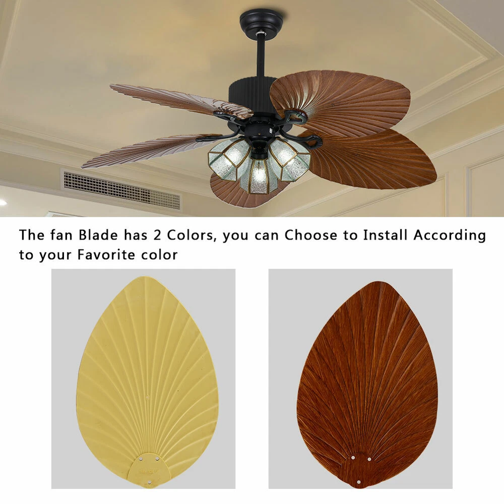 Specifications Material: Glass, Hardware Iron, Acrylic Process: Electroplating Light Source Type: 3* E26/E27 Bulbs(Not Included) Light Applicable Area: 10-15m²/107-161ft ² Assembly Required: Yes Mounting Type: Ceiling Mount Power Source: Corded Electric Number of Fan Blade: 3 Air Supply Range: 10m²/107ft ² Motor Voltage: 110-120V Motor Power: 35W Working Noise: 35Db Controller Type: Remote Control Remote Control Battery: 2*1.5V AAA Batteries(Included) Remote Control Range: 3-5m/9.8-16.4ft Timing Duration: 1/2/4h Base Load-bearing Capacity: About 10kg/22lbs Product Height: 50cm/19.68in Product Length: 132cm/52in Each Fan Blade Length: 52cm/20.47cm Base Diameter: 15cm/5.9in Short Rod Length: 10cm/3.93in Long Rod Length: 20cm/7.87in Package Included 1* Ceiling Fan Light 1* Remote Contro 52" Tropical Ceiling Fan Light Indoor Reversible+ Remote Control 110V Description The ceiling fan light with its quaint color and special shape is not only an excellent tool to light up your room but also embellish your room with unique and beautiful elements. It combines simplicity and practicality, adding adding a touch of resort-style charm to your home decor. Key Features Build to Last: The fan blade is made of Advanced acrylic, which is not easy to deform and has a long service life. The lamp body is made of hardware iron after the plating process, thus having high strength and toughness, corrosion resistance, and high-temperature resistance. User-friendly Design: With 3 adjustable speeds, whether you want a gentle breeze or a more powerful airflow, our ceiling fan light will meet your needs. In addition, it is equipped with a timer function, you can set it to automatically turn off after 1/2/4 hours by the remote control within 16.4ft to save energy. It also has a thoughtful and quiet design, allowing you to have a better sleeping or working experience. Details Standard Lamp Holder: The standard E26/E27 lamp holder can support the use of (Edison bulb/LED/CFL/incandescent lamp), 20-60W is recommended, making it very convenient for you to purchase and replace. Suitable for Summer and Winter: It can rotate both forward and reverse. In summer, it rotates forward to circulate air downward to enjoy the cool natural breeze. In winter, it rotates backward to circulate air upward to enhance indoor air circulation. This beautiful ceiling fan offers such a unique aesthetic, bringing a calming warmth, yet rustic depth into the comfort of your home. Effortless Assembly: Complete installation accessories, a clear instruction, and a simple structure allow you to complete the assembly in a very short time. Ideal Gift: This product is stylish and high-quality and can be used as a housewarming, birthday, or holiday gift for parents, friends, and loved ones. Guaranteed Customer Service: Our friendly customer service team would be happy to solve your issues with our ceiling fan light. If you have any issues, please feel free to contact us. Details Sturdy Base: The hardware iron base with a diameter of 5.9in is sturdy and durable to ensure the stability of the light and can withstand up to 22 lbs without collapsing. Selectable Suspension Rods: The 3.93" and 7.87" suspension rods provide you with the flexibility to install this ceiling fan light according to your needs. Application It's suitable for a living room, bedroom, kitchen, restaurant, bar, hotel, or outdoor patio. Specifications Material: Glass, Hardware Iron, Acrylic Process: Electroplating Light Source Type: 3* E26/E27 Bulbs(Not Included) Light Applicable Area: 10-15m²/107-161ft ² Assembly Required: Yes Mounting Type: Ceiling Mount Power Source: Corded Electric Number of Fan Blade: 3 Air Supply Range: 10m²/107ft ² Motor Voltage: 110-120V Motor Power: 35W Working Noise: 35Db Controller Type: Remote Control Remote Control Battery: 2*1.5V AAA Batteries(Included) Remote Control Range: 3-5m/9.8-16.4ft Timing Duration: 1/2/4h Base Load-bearing Capacity: About 10kg/22lbs Product Height: 50cm/19.68in Product Length: 132cm/52in Each Fan Blade Length: 52cm/20.47cm Base Diameter: 15cm/5.9in Short Rod Length: 10cm/3.93in Long Rod Length: 20cm/7.87in Package Included 1* Ceiling Fan Light 1* Remote Control 2* AAA Batteries 1* English Manual Other Accessories for Installation Notes 1.It is for the ceiling installation requirements: floor height ≥ 8.53ft; ceiling load ≥ 66.14 lbs, wood plate thickness≥ 1.18 inches. To ensure wind power and safety, the distance between the fan blades and the wall should not be greater than 23.62in, the distance to the ceiling should not be less than 7.87in, and the distance to the ground should not be less than 7.55ft. 2.Ceiling installation is recommended for flat ceilings. If there are recessed round and square designed ceilings, please calculate the installation height in conjunction with the surface of the ceiling so as not to cause the ceiling fan to be installed without wind. 3.Generally, it can be installed on inclined surfaces, but the angle of inclination cannot be greater than 30°, so customized hooks (not included) are required to adjust the installation angle. 4.When installing or wiring, please turn off the electric switch and test if the light is on. When chiseling or drilling in the wall, please do not damage the wire and other hidden facilities. We strongly recommend experienced and qualified personnel to install the product. 5.Please do not use any obstacles to block the rotation of the fan blades. Please do not install any external solid-state circuits or speed regulators in this ceiling fan system. 6.Please read the English manual carefully before use, and pay special attention to the safety tips inside. Please do not bend the blades when calibrating and cleaning the fan. 7.Please allow the slight color difference caused by the shooting light and 1-3cm error due to manual measurement, and make sure you do not mind before ordering. Payment Delivery details Terms of sales About us Contact us Payment We accept ebay 