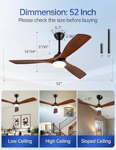 Return Policy Fast Delivery Trusted seller 52 Inch Dimmable Ceiling Fans with Lights Remote Control, 3 Blades Walnut Propeller Wood Ceiling Fans,Quiet Modern Ceiling Fan for Indoor,Outdoor,Bedroom,Living Room,Farmhouse,Patio Product Description 【3 Blades Wood Ceiling Fan】 52 Inch ceiling fan with light uses paulownia wood that has been planted for over 20 years, and the propeller ceiling fan blades are pure solid wood. It is uniquely resistant to corrosion, acid and alkali corrosion to ensure sturdy. Five wood walnut ceiling fan blade is meticulously handcrafted with a clear grain. 52 Inch ceiling fan looks finer,modern and more woodsy.To protect the wood, outdoor ceiling fan for patios is not directly to the rain. 【Dimmable Ceiling Fan with Light】All operations of the 52 Inch modern ceiling fan are controlled by remote control.24W LED dimmable ceiling fan with light (0-100%) with a choice of warm/natural/cool lighting (3000K/4500K/6000K). 6 fan speeds, 0.5/2 hour timer settings. Suitable for 110-240v voltage. 【Quiet Reversible DC Motor】This 52 Inch ceiling fan adopts solid copper wire, which has superior conductivity compared to traditional AC motors. This increases the efficiency of the motor by more than 50%, which greatly reduces energy consumption. Reversible two-way fan improves air circulation and keeps you warm in winter and cool in summer.Our DC motor is quieter than 30 dB and have a service life of over 15 years.Noiseless ceiling fan with light is sleep friendly for babies and the elderly. 【Easy Installation】Our dimmable ceiling fan with lights will be provided with 5''/10'' downrods for customers to use in different spaces such as bedroom, living room, dining room, office, farmhouse,indoor,outdoor patio and so on.Most of the fittings have been followed in advance, just need to follow the steps in the instructions for easy installation.Sloped ceilings within 10 degrees are best for installation. 【Power Off Memory Function】Use the remote control to select the ceiling fan light color and ceiling fan gear, turn off the power switch, and then turn on the power switch after 10 seconds, the light and fan will be restored to the state before the power off. More convenient to use the ceiling fan with light! 【Attentive After-sales Service】The 52 inch modern ceiling fan provides high quality after-sales service support, 2 years for the dimmable ceiling fan with light and remote. If you encounter any problem about your ceiling fan, please contact us, we will help you in time. Shipping Returns Payment Shipping Shipping is FREE to all addresses other than APO/PO boxes in the lower 48 states. All our stock ships from US-based warehouses. Shipped via USPS or UPS (depending on location and package weight) Unless stated otherwise, all orders will ship within 24-72 hours of your payment being processed. Check our feedback to see the great reviews of FAST shipping we offer. Returns Seller does not accept returns Payment We currently accept payment via eBay managed payments only. Once payment is cleared, we will dispatch your shipment within 1-3 business days. Please refer to the "Shipping" tab for more information regarding shipping speed to your destination.