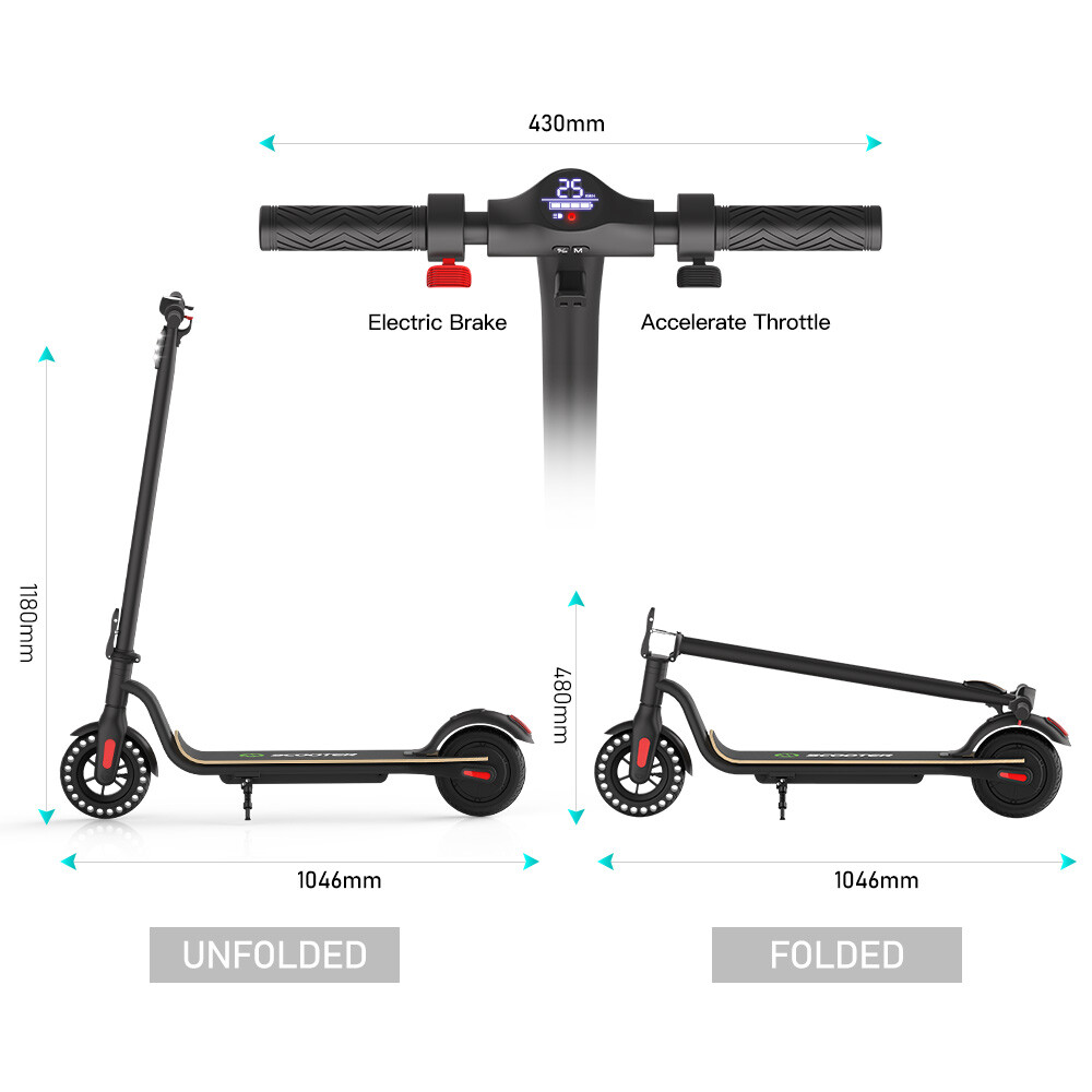 Main features: LONG RANGE BATTERY LIFE - Powerful 250W motor and 5.2 Ah/36V lithium battery pack that supports a speed of up to 15.5 Mph with a range up to 7 Miles. Updated large-capacity battery life, designed for commuters and longer distances. 8.0" HONEYCOMB & SOLID TIRES - Shock-absorbing rubber tires offer a smooth ride even over bumpy surfaces. PORTABLE FOLDING DESIGN - Electric scooter can be folded easily in 3 seconds with quick folding latch for easy carrying and storage. BATTERY INDICATOR AND LIGHTS - Battery indicator keeps to track battery life. Ultra bright LED headlight and taillight. Fast recharging about 5 hours. GEAR SHIFT SETTING - 1st gear for a 7.5 Mph comfortable ride or 3rd gear to get the 15.5 Mph fast experience. Extremely fun to ride and end boring commutes. Specification: Brand: Megawheels Model: S10 Dimension: Unfolding 105 x 43 x 118 cm; Folding: 105 x 43 x 48 cm Net Weight: 11.9kg Color: Black Frame Material: Aluminium Tires: 8.0" Honeycomb Front Tire & Solid Rear Tire Max Load: 100kg Max speed: 25KM/h Speed level: Gear 1--Max 10km/h ; Gear 2--Max 20km/h; Gear 3--Max 25km/h Mileage: 8-12km Grade Ability: 20 degree slope Working Temperature: -15°C-50°C Storage Temperature: -20°C-25°C Mode Type of Motor: Brushless hub motor Battery Type: High quality lithium battery Battery Capacitiy: 5.2 Ah Battery Voltage: 36V Charger Input Voltage: 100V-240V Charger Frequent: 50Hz/60Hz Charging time: 4 hours Package Contents: 1 * Folding Electric Scooter 1 * Battery Charger 1 * User's Manual Riding Skills: -Put your foot in the front of the scooter and the other foot on the floor before riding. -Make sure that the riding route is smooth. -Slide forward with the food standing on the floor before starting (like riding the scooter without power). -Immediately press the acceleration button and lean forward to avoid falling over backward due to inertia, so that the electric scooter will enter the working status. -Avoid pressing the handle with your body in the acceleration and deceleration process. Put one foot ahead and the other behind (like on the sliding plate/surfboard, put one foot ahead and the other behind by 70-90 for better comfort). -Turning – The turning principle of the electric scooter is the same with that of surfboard/sliding plate/skis. The handle shall be balanced with the body. Observe and make sure that turning is safe before turning. Tips: Before riding the scooter, please put one foot on the scooter deck and the other foot on floor and push the scooter forward by kicking the floor for some distance, in this way, the scooter will get some impulse to run forward. Note: This products have been certified under UL2272 safety standards.