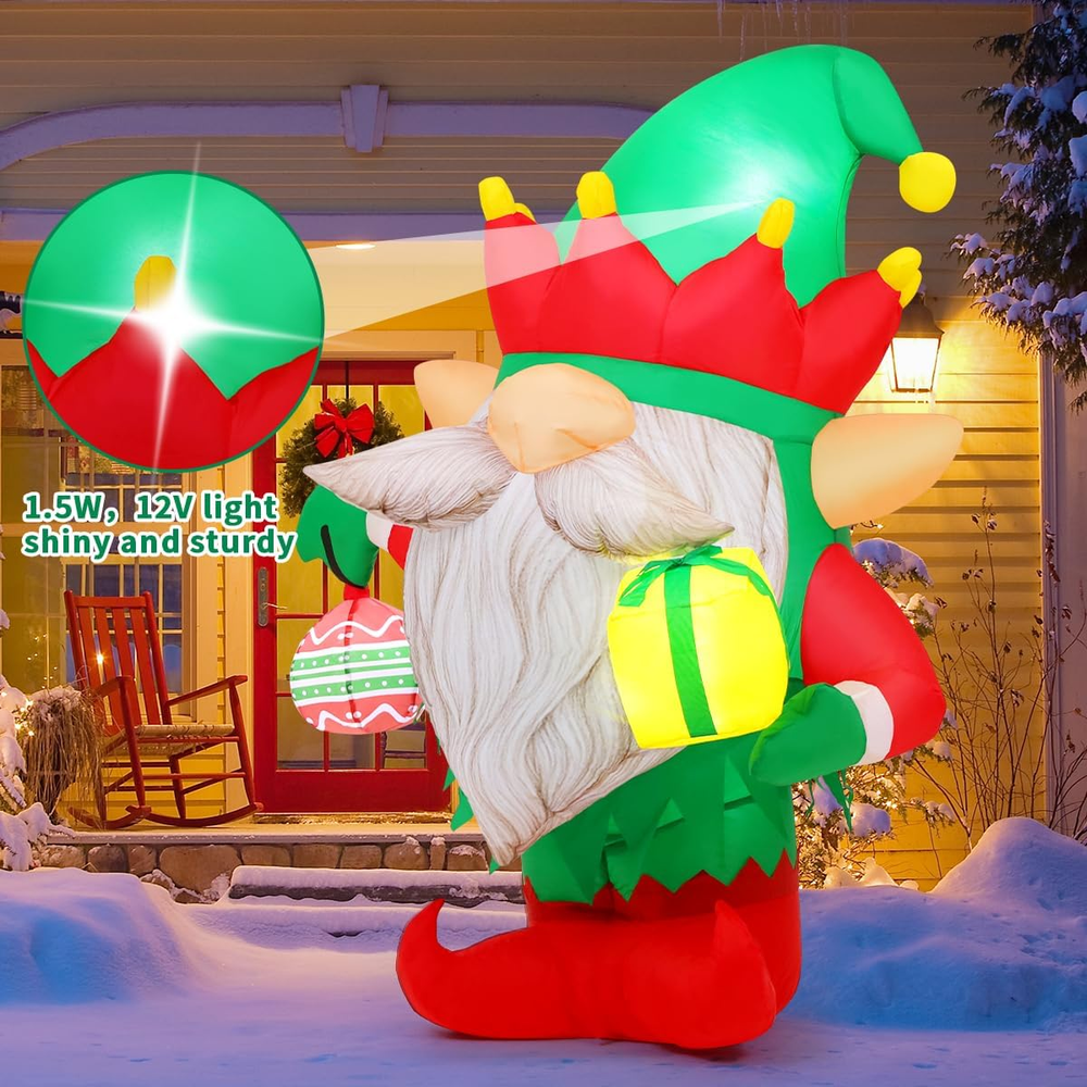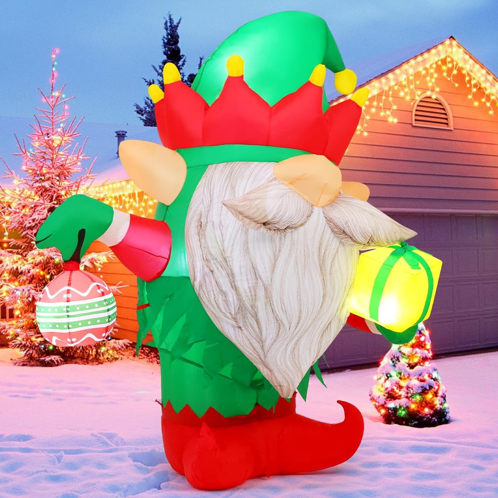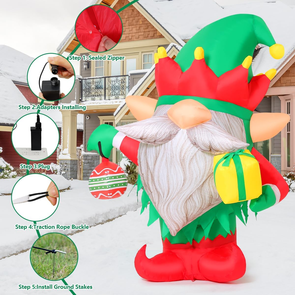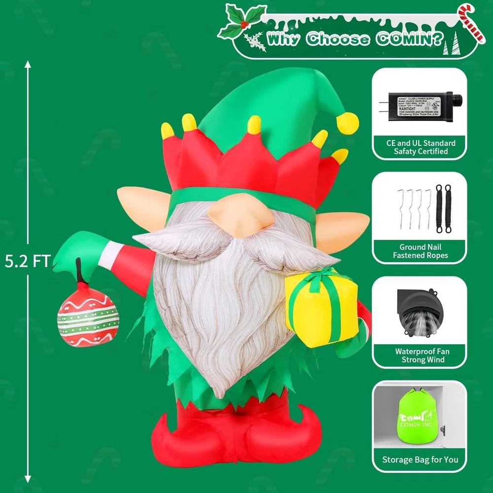 Magical Christmas Outdoor Decorations: 5.2FT COMIN christmas inflatables gnomes charmingly holding a Christmas ball and Gift Box. Christmas inflatable outdoor decoration has built-in bright LEDs cast a cozy, evenly diffused glow that pops at night—perfect for yard, lawn, porch, garden, or walkway. Inflatable gnome will create a sweet, photo-worthy holiday scene the moment you plug it in. Plug In, Self-Inflates in Minutes: Christmas decorations are supported by CE & UL certified adapter and the powerful built-in fan does the rest and supports fuller shape and reliable nightly performance. The bottom zipper helps you release air fast for takedown. This christmas inflatable gnomes are ideal for busy families who want fuss-free décor. Waterproof & Winter-Ready: Our outdoor christmas decorations has reinforced fabric Built to Last Crafted from upgraded, waterproof polyester with solid stitch seams. The christmas blow ups are engineered to operate in rain or light snow. Tear-resistant construction helps defend against rips in changing winter weather for season-after-season use. Complete Outdoor Kit Included: Everything you need arrives in the box: ground stakes, fastening ropes, and a storage bag. Multiple anchor points keep your christmas blow up yard decorations steady and upright, while the compact carry bag makes off-season storage neat and simple—no extra purchases required. Worry-Free Holiday with COMIN Customer Service: Questions, missing parts, or setup help? Our responsive support team is ready with quick solutions and step-by-step guidance so your display shines all season. Enjoy a pleasant experience from unboxing to nightly glow. Product description COMIN 5.2 FT Tall Christmas Inflatables Goblin 1 Suit for any occassions 2 Gift for anyone 3 Easy to set up 4 Perfect Package 5 Bright !!!