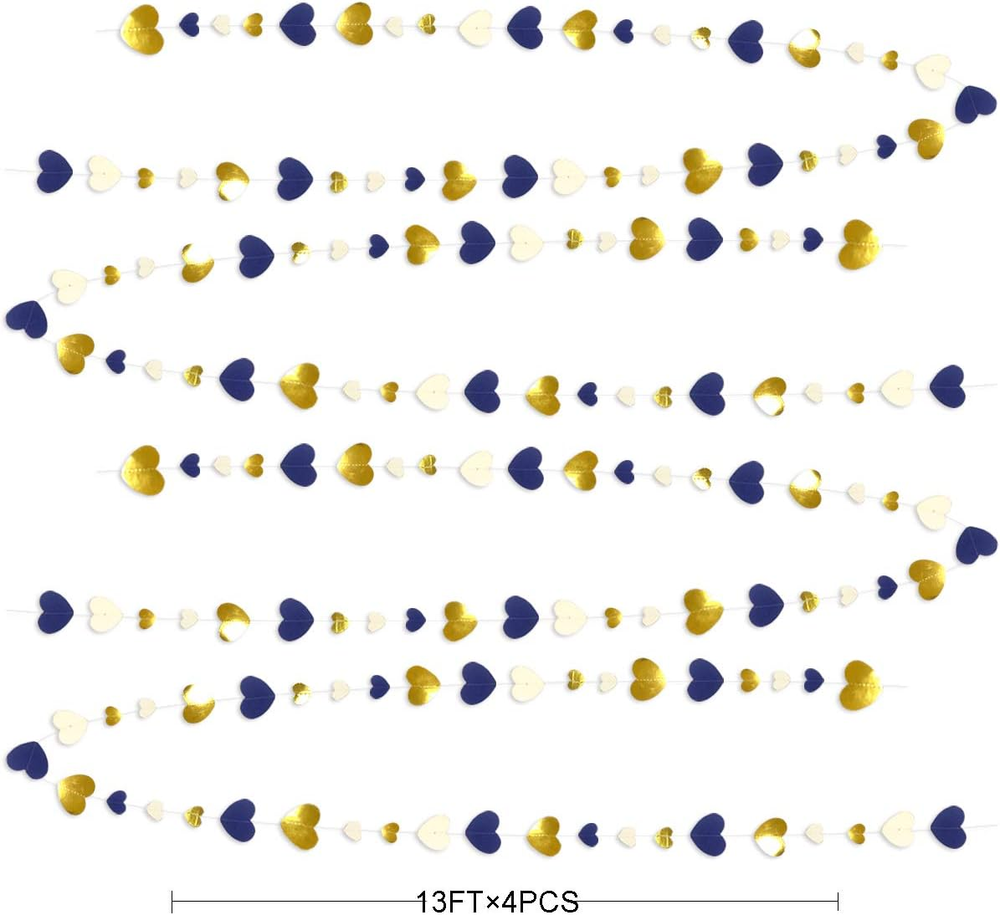 Package Contains - 4 packs of gold and beige white and royal blue heart party decoration garland,each string is 13 feet/ 4 meters. High Quality- Our blue gold backdrop garlands streamer are made of two different materials paper alternately.Double sided metallic paper and high quality cardstock , with neat cut,strong,durable and reusable. Unique Design - Different sizes(lovely little love heart and large heart love)and different material(metallic paper and cardstock),This design will let your party decor more eye-catching and special. Using Occasion - Perfect for decorating any parties.such as wedding,baby shower,birthday,bachelorette,engagement,bridal shower,graduation ceremony,valentines day,anniversary,Christmas,hen party navy blue party,gold party decoration and so on.Also ideal for nursery showcase backdrop decor. Product Warranty and Customer Service - We provide 48-day money-back and 24-month warranty. So feel free to contact us if you have any question. Product Description Pinkblume is specialized in designing and producing decoration products of house,party,wedding Our enterprise purpose is provide high quality products Please search our brand name: pinkblume Be sure to check out our other creations for your party!! Our creamy-white gold dark blue party decorations kit includes: 4 packs of blue gold heart garland Dimension: Each string of this navy blue gold heart garland is 13 feet/ 4 meters.Total length is 52 feet/ 16 meters. MULTIPLE OCCASION: Anniversary decorations Bachelorette decorations Baby shower decorations Bridal Shower decorations Valentines day decorations Blue Gold party decorations Navy blue party decorations Royal blue party decorations Engagement party decorations PERFECT FOR: Birthday decorations Wedding decorations Hen party decorations Blue party decorations Christmas decorations Gold party decorations Graduation decorations Heart party decorations Fiesta party decorations NOTICE: Unroll & unwrap garlands carefully. Due to delicate nature of thread, may tangle. There may be dimension errors to some degree due to manual measurement. There may be some slight differences between the color tone of the pictures and that of the actual items due to lighting effects, monitor's brightness and contrast settings, etc.