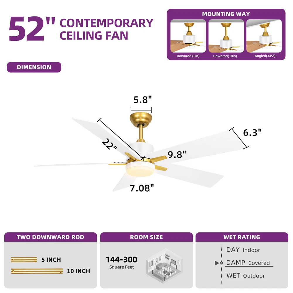 Product Description Specifications: Color:Black & Gold; White & Gold Product Dimensions: 52"L x 52"W x 15"H Numbers of Blades: 5 Numbers of Speeds: 6 Material: Metal Sound Level: 35 dB Item Weight: 16.5 pounds Control Method: Remote Control & APP Control Mounting Type: Ceiling Mount Assembly Required:Yes Package Included: 1 x Ceiling Fan 1 x Remote Control (Battery Not Included) 1 x Instructions Manual Product Details Shipping 1.The shipping rates listed are only for residential or commercial destinations in the continental 48 United States. All international sales will go through eBay Global Shipping Program.please ask us if there are any questions. 2.We only ship the item to the address that is sent to us at the time of checkout. Please verify the correct shipping address in your PayPal account before making your payment. If we ship your item to an old or invalid address and you are not able to locate the item, we are not responsible for shipping a replacement. 3.Currently, we do not ship to Hawaii, Alaska, Puerto Rico,APO/FPO/PO Boxes. 4.We use USPS, UPS & FedEx as shipping method. 5.Payments cleared before 12 PM PST, will be shipped on the same day. Payment 1.We accept PayPal and all forms of credit card. 2.We will only ship to the confirmed Paypal shipping address given with the payment. 3.We do not offer local pick up service. Return 1.30 days Money Back Guarantee. 2.If any package that needs to be returned, please contact our customer service first to receive a RMA form. 3.All return items MUST be in brand new condition. About Us 1.Specialized in aftermarket auto parts since 2012, we source and work directly with professional manufacturers to provide the highest quality parts at the most economical prices. 2.We also has over 5 years of shipping experience with FedEx and USPS . Our Packing Quality is Guaranteed , Item Ship-ping is timely! On Feb 13, 2025 at 03:50:45 PST, seller added the following information:
