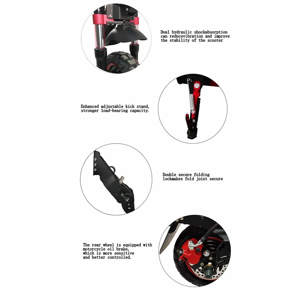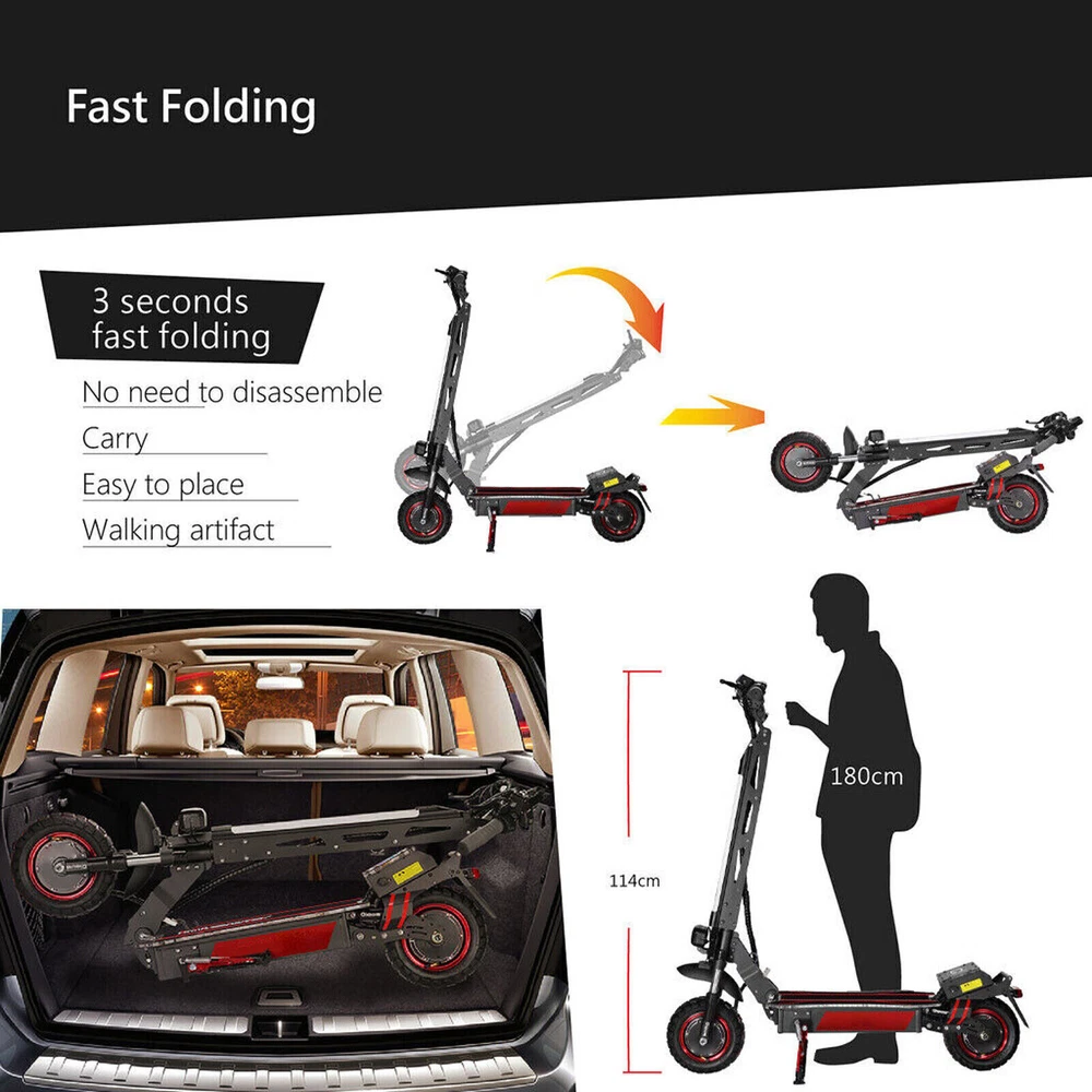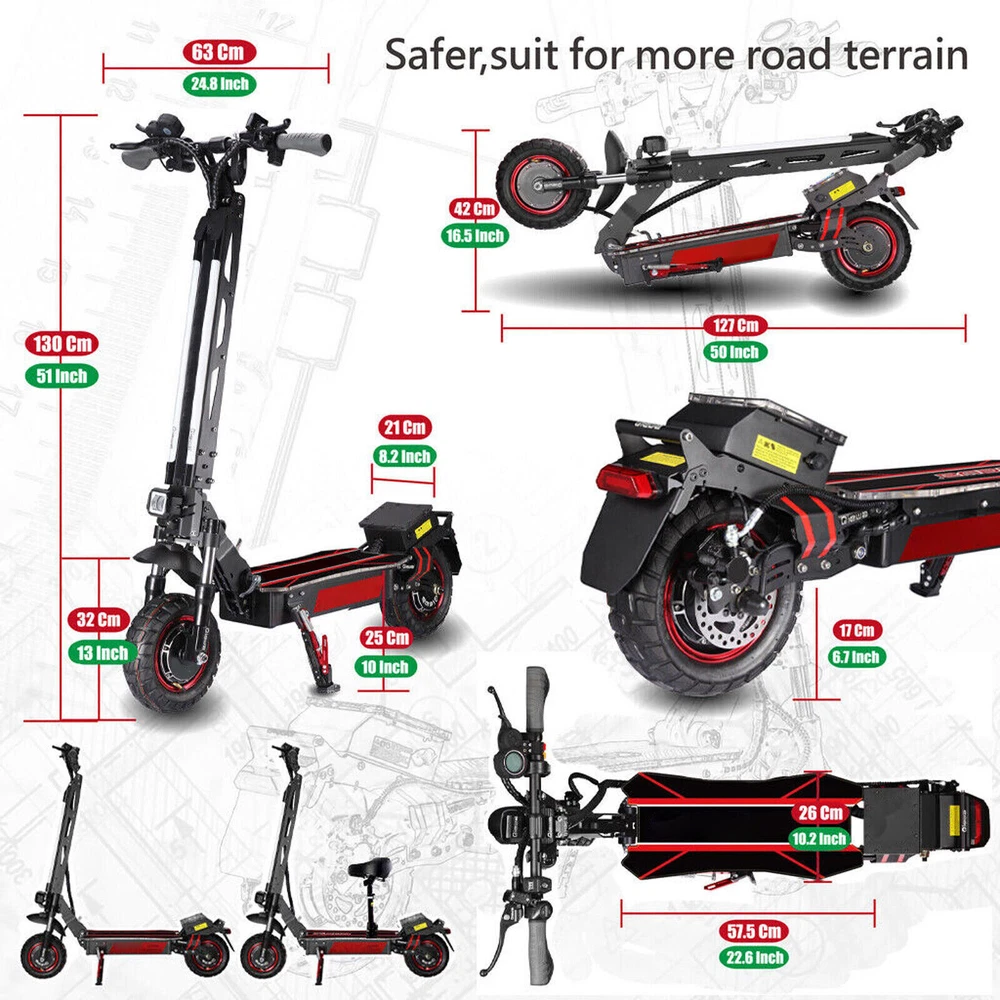 DESCRIPTION: Condition: 100% New Colour: As the picture shown Parameters Standard Specifications Product unfolded size 1190*605*1270mm Product folded size 1270*380*600mm Chassis height 160mm Pedal length*width 575*255mm Packing size 1375*365*570mm Charging stand (single/dual) double Front and rear shock absorption form Front hydraulic shock absorption Motor parameters 52V2400W Anti-theft form key lock Handlebars (adjustable) Dovetail handlebars Front and rear brake form Front disc and rear oil back handle has Headlight configuration/horn Square high-end headlight + horn Frame material aluminum alloy Tire size 10.8 inch off-road vacuum tire Double drive net weight (without battery) 33kg Packing weight 4kg Maximum speed 55-65km/h Load range 150kg Packaging material (inside) double-layer carton + pearl cotton Climbing angle 30-45 Fender material: Adjustable iron fender + tail light Marquee/Cruise function Yes/Yes Battery option one 52V23.4AH Battery option two 52V30AH NOTE: 1. Due to the hand measurement, there may have error measurement about 1-5mm. 2.Item color displayed in pictures may be showing slightly different on your computer monitor since monitors are not calibrated same. Your understanding will be highly appreciated. SHIPMENT: 1.Buyer take responsibility in import / tax cost (not included in item price) 2.Pls contact with us to confirm extra cost if you need to upgrade the shipping option 3.If there's any concern about shipping, pls contact with us for further confirmation RETRUN POLICY: -30 DAY MONEY BACK RETURN POLICY: 1. If you are unhappy with your item or changing of mind purchases for whatever reason, pls keep the item and package original. Buyer needs to afford the return postage. Besides, original postage will not return. 2. Please contact us within 30 days if you have a faulty item and we will cover the return postage where necessary, we do not cover this outside 30 days of purchase. -ADDRESS CHANGES: 1. If you enter the incorrect name or shipping details before purchasing, we will arrange shipment for you according to your ebay address. 2. We are not responsible for these changes if there is a mistake entered by the buyer. CONTACT US: 1. Our working time is from Beijing time 9:00am to 18:00pm on working days. 2. We hope to give you a good shopping experience. We will glad to help you solve problems once we receive your letter on working time. 3. If you have any questions or advice about the product you receive, pls contact us and send the pictures about the item firstly, we will check the issue for you ASAP and make you sastified.