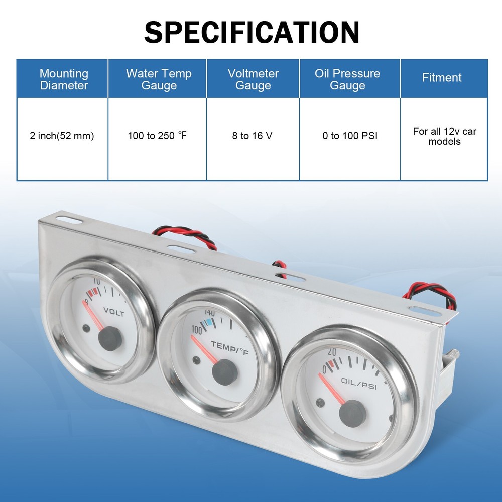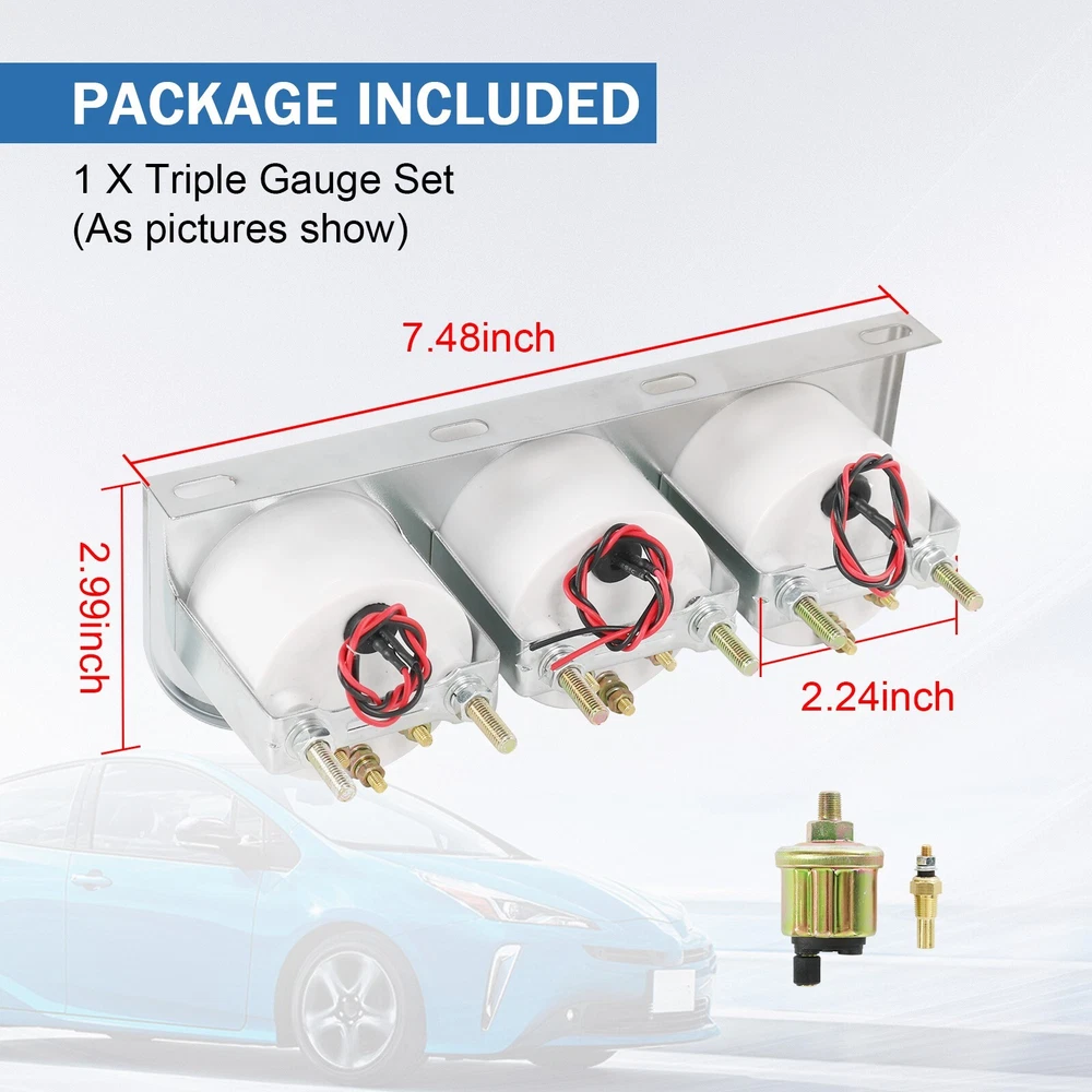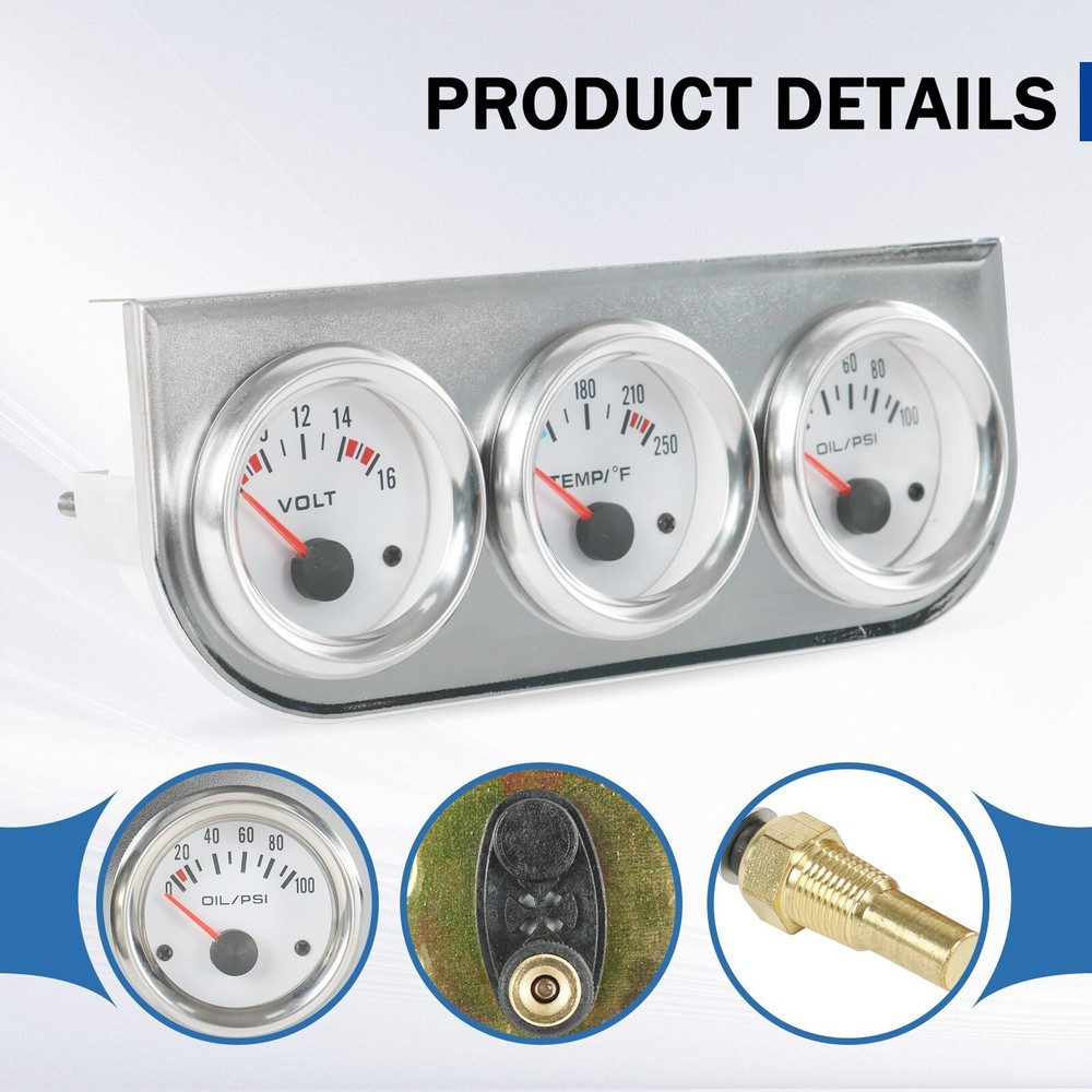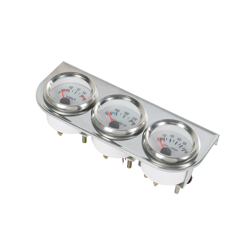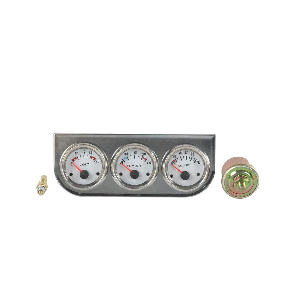 Universal 2'' 52mm Chrome Volt Water Oil Pressure Triple 3 Gauge Set Gauges Kit ★ 1 Year warranty, long durable life ★ Fast and Free Ecomomic/Standard shipping Manufacturer: JDMSPEED Application: This item is universal fit for most 12V vehicles Specification: Color: Chrome housing, white face, red needles Size: Like the picture show Water Temp Gauge: 100 to 280 ℉ Volts Gauge: 8V to 16V Oil Pressure Gauge: 0 to 100 psi Size of Sensor: Z 1/2 Features: Universal Chrome 3-Gauge Mechanical Kit Includes oil pressure, voltage, and water temperature. Gauges are illuminated. Installation kit included with everything needed to install. PS: Ship items within one working days All parts are in stock and ready to ship The part you see is the part you receive Standard size, perfect match for your vehicle All parts are fully inspected and professionally packaged We respond to any and all buyer questions or issues Shipping and Payment Return Warranty Delivery Warning Shipping and Payment We ship all the packages within 1-2 business days. Our shipment arrive your address will take around 2-10 business days. Orders placed on Saturday or Sundays should be processed and shipped on Monday. Hope you can understand. If you didn't received packages in 15 business days, please contact us freely, and we will check and solve it. Please purchase and pay for the item through eBay auction, and do not manually send us a PayPal payment. Return 60-day money back guarantee We offer a 6-month warranty for most of our products that starts on the original purchase date. If you are not satisfied with our product, most items can be returned in their new/original/unworn condition within 60 days. We will offer a refund or exchange (Shipping and handling fees are not refundable). A 15% restocking fee ($10 minimum) may be applicable. Items that have been worn, misused, abused, damaged, and/or altered beyond warranty coverage and period will not be refunded or exchanged. Warranty This item have 1-year warranty. In the event the item should fail due to manufacturing defects during intended use, we will replace the part by free. We only warranty cost of item parts. Any installation or other fees are non-refundable. Note: Any modifying the item of any kind without contacting us will void any and all warranty coverage for this item. Please contact us before modifying the part so that we have the opportunity to correct the situation. You can contact us by ebay message to get the full text of the written warranty. Delivery We ship all the packages within 1-2 business days. Arrival time for the USA buyers: about 1-6 business days. Arrival time for Canada buyers: about 3-10 business days. Please allow 3 to 6 working days to receive your item(s). International Buyers - Please Note: Import duties, taxes, and charges are not included in the item price or shipping cost. These charges are the buyer's responsibility. Please check with your country's customs office to determine what these additional costs will be prior to bidding or buying. Warning This product can expose you to chemicals including Chromium (Hexavalent Compounds), which is known to the State of California to cause cancer, and birth defects or other reproductive harm. For more information, go to California goverment website, you can search California P65Warnings. Type Instrument Cluster Manufacturer Part Number 100816 Other Part Number Voltage Meter + Water Temp + Oil Press Gauge Interchange Part Number Universal Chrome 2inch 52MM Triple Gauge Kit Size 2'' 52mm Feature Chrome Display Type Analog Items Included Temperature Gauge, Oil Pressure Gauge, Mounting Hardware Needle Color Red Features Illuminated (Backlit) OE/OEM Part Number This item is universal fit for most 12V vehicles Unit of Measure Degrees Farenheit, psi Color Silver Brand JDMSPEED Manufacturer Warranty 1 Year