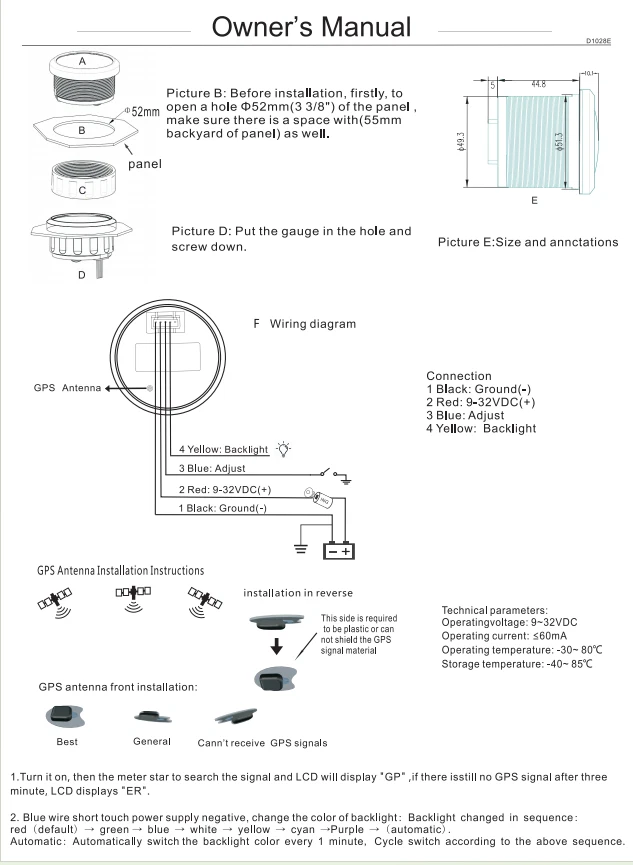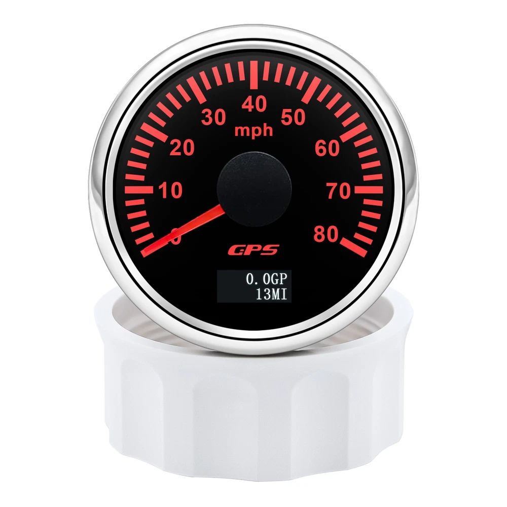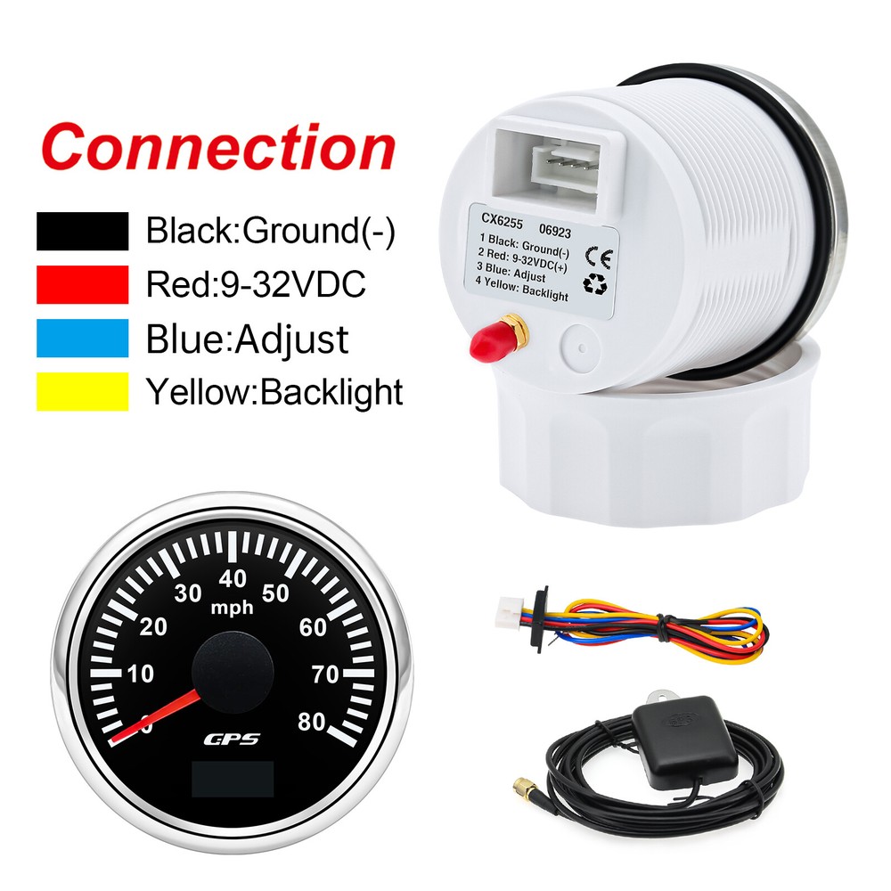 52mm Waterproof GPS Speedometer 0-80MPH Odometer Gauge for Marine Boat Car Truck 85mm GPS Speedometer Gauge 80 MPH Speed Stainless Waterproof for Car Boat Truck Specifications: Name: GPS Speedometer Odometer Material: PVC+Stainless steel+Glass Panel Color:Black Backlight Color: 7Colors LED Fixing Dimension: 85mm(3-3/8") Working Voltage:9~32VDC Working Current: ≤100mA Operating Temperature: -30°~75° Storage Temperature:-40°~85° Levels Of Protection: IP67 Indicating Range: 0-80MPH Suitable for car truck boats off-roadvehicles boats Features: -Protection grade is IP67. -100% brand new and high quality -With polarity reverse protection function. -The durability is good, and the seismic performance is good. -Thesignal comes directly from the satellite signal receiver(GPS Speed Sensor) -The gauge has the advantages of high precision,quick location confirmation and short start up time. -With ultra-wide working voltage design(long-term operating voltage: 9~32V,Maximum up to:36V(≤ 1 min) Installation instructions: 1.Opening a hole in the panel (your cabin board and dashboard) with a diameter of 85mm,Insert meter into the hole,The panel corresponding to the instrument panel is marked with a convex table,and open a small notch in this location,To ensure that there is at least 85mm of the instrument panel at the back of the instrument. 2.After the instrument is mounted in the panel,Screw down with a fixed ring.Opening a hole in the panel (your cabin board and dashboard) with a diameter of 85mm,Insert meter into the hole,The panel corresponding to the instrument panel is marked with a convex table,and open a small notch in this location,To ensure that there is at least 85mm of the instrument panel at the back of the instrument. 3.Connect the wire,the instrument housing is directly connected to the 9~36V power supply. 4.Insert wire harness,Firmly locked in the table. Package List: 1 x GPS Speedometer 1 x Standard Cables 1 x GPS Receiver 1 x Installation Instruction