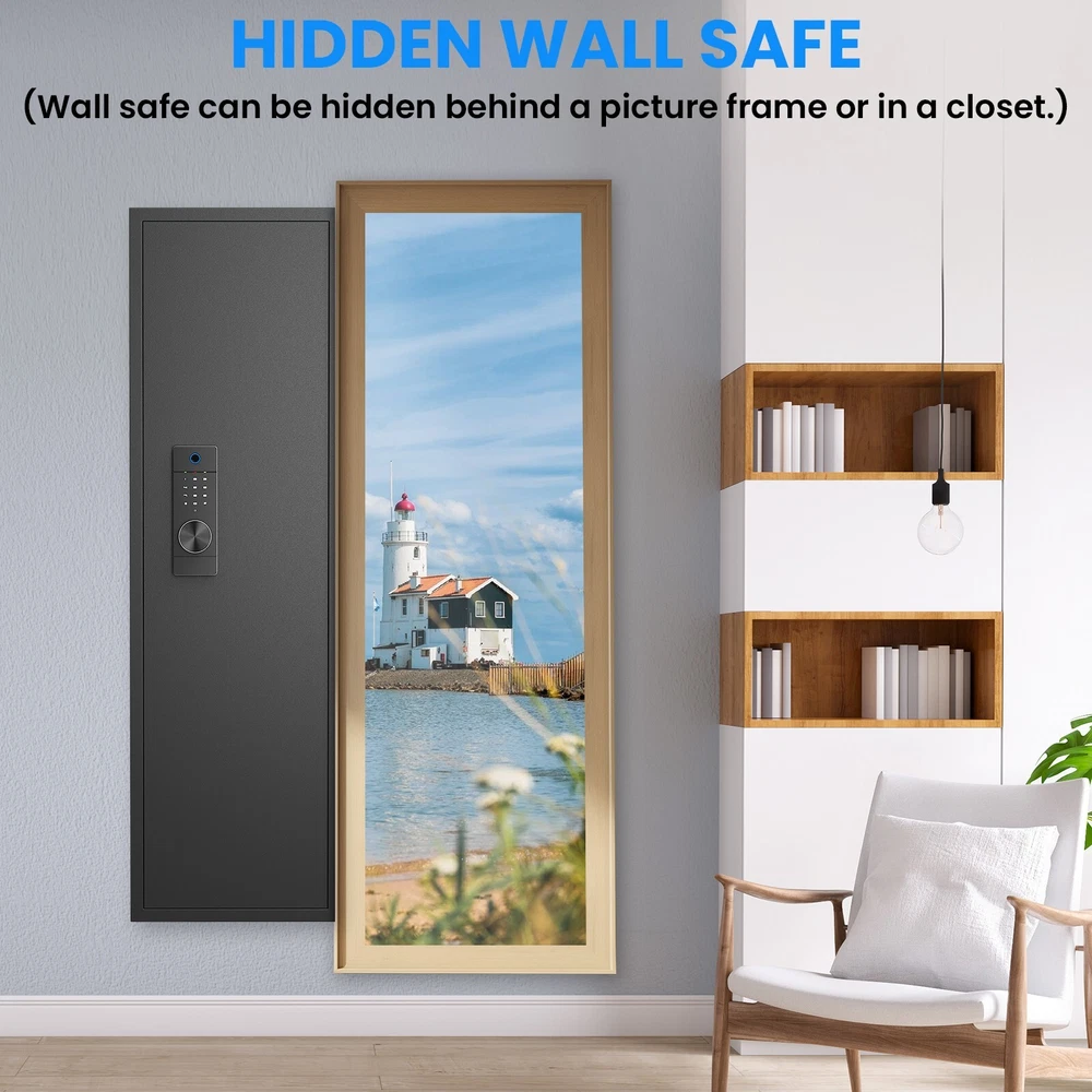 Specification Product Information Item Code: W1779P207550 Product Type: General Item Product Name: 53" Fingerprint Touch Panel In-Wall Safe,Hidden Wall Gun Safe for Rifles with Adjustable Shelves,Assembled Storage Multifunctional Wall Safe for Firearm and Valuables (Black-Fingerprint) Main Color: Black Main Material: Steel Product Dimensions Assembled Length (in.): 15.70 Assembled Width (in.): 5.00 Assembled Height (in.): 53.00 Weight (lbs.): 41.00 Package Size Length (in.): 20.65 Width (in.): 7.87 Height (in.): 57.65 Weight (lbs.): 49.50 Product Features Our in-wall safe, designed for 16” stud centers, discreetly secures documents, passports, jewelry, cash, firearms, meds, and heirlooms. Its spacious interior and concealable size offer ideal protection. Our heavy-duty steel wall safe, with 4 solid bolts on three sides and an all-metal door, features a scratch-resistant powder coat for enduring protection. It’s designed to withstand forced entry and deter burglars. Our in-wall safe is engineered for ultimate durability and security, featuring anti-theft and anti-pry defenses. Its high-level safety measures ensure maximum protection against unauthorized access. The in-wall safe is equipped with a high-identification touch screen panel, offering quick response and easy operation. The advanced touch technology provides a seamless user experience, enabling effortless access. Description Press-Type Retractable Handle The safe is designed with a retractable handle. This innovative handle can be extended or retracted with a simple press. When extended, it provides a firm grip for easy opening and closing of the safe. When retracted, it blends seamlessly into the panel's surface, giving a clean and streamlined look Touch Screen Panel and Multiple Unlocking This safe boasts a high-identification touch screen panel for swift and precise interaction, offering a smooth and modern operational experience. Beyond the touch screen, it offers various unlocking options, including combination, key, and digital code, for personalized security and convenience. Customized Storage Space The safe provides customized storage with adjustable and removable partitions and gun stocks. You can configure the interior on your needs. Whether for firearms, documents, jewelry, or other valuables, the partitions can be adjusted for the perfect layout. Dual Alarm Function In case of violent shaking or impact on the safe, or when the wrong password is entered three times consecutively, a 30-second alarm will be set off. This alarm serves as a warning and a security measure. It alerts the owner and those in the vicinity of potential unauthorized access or mishandling.